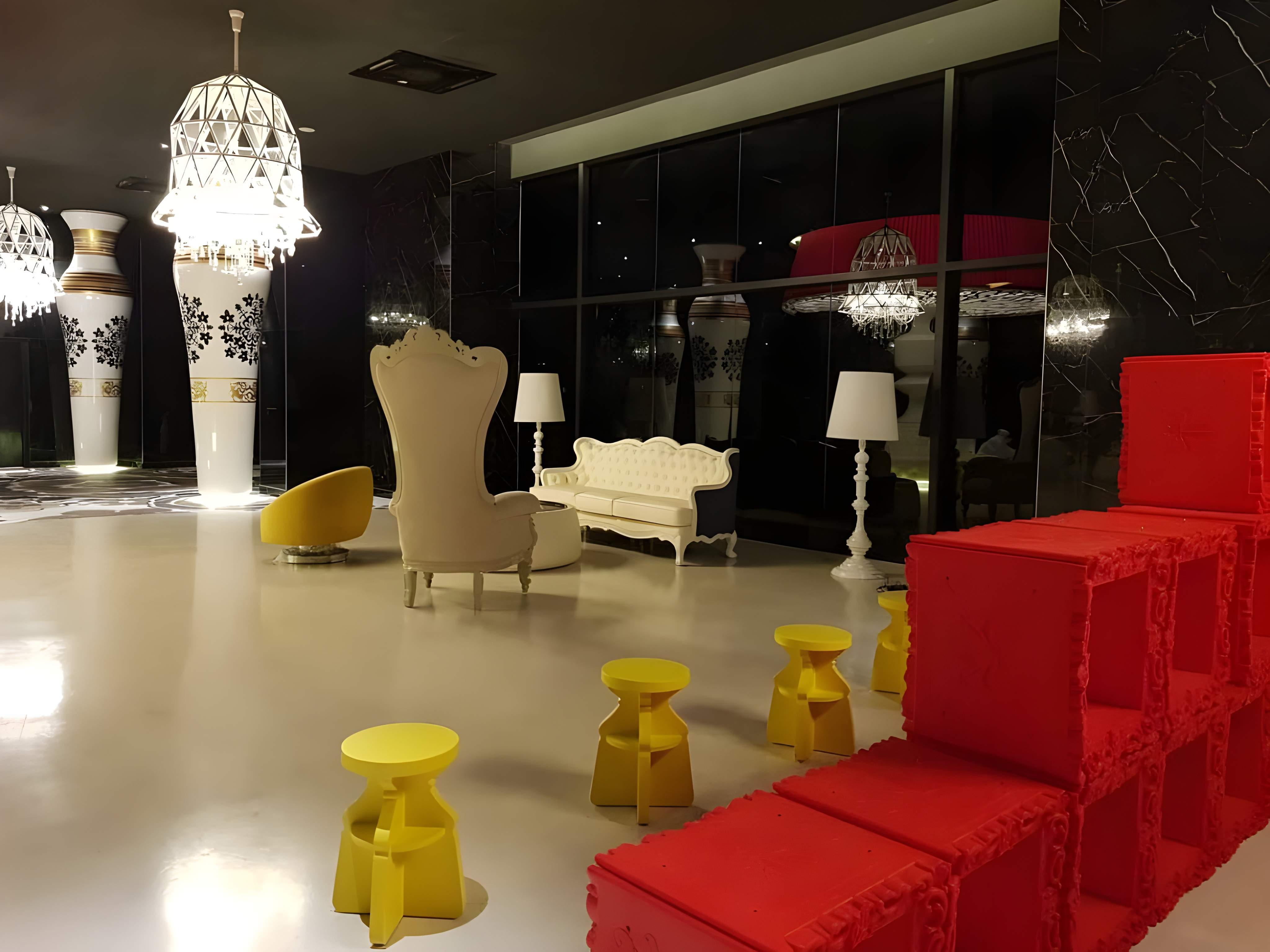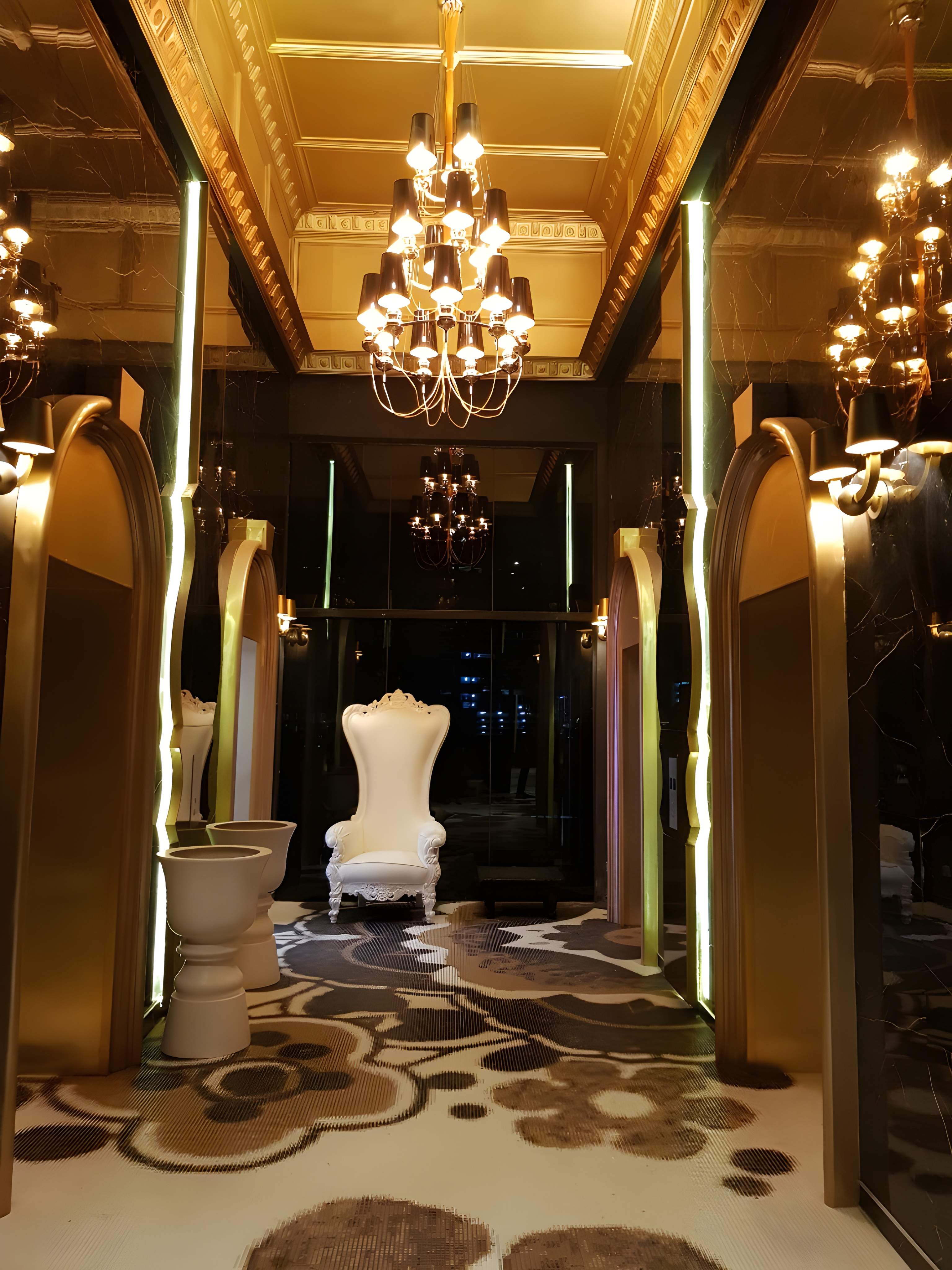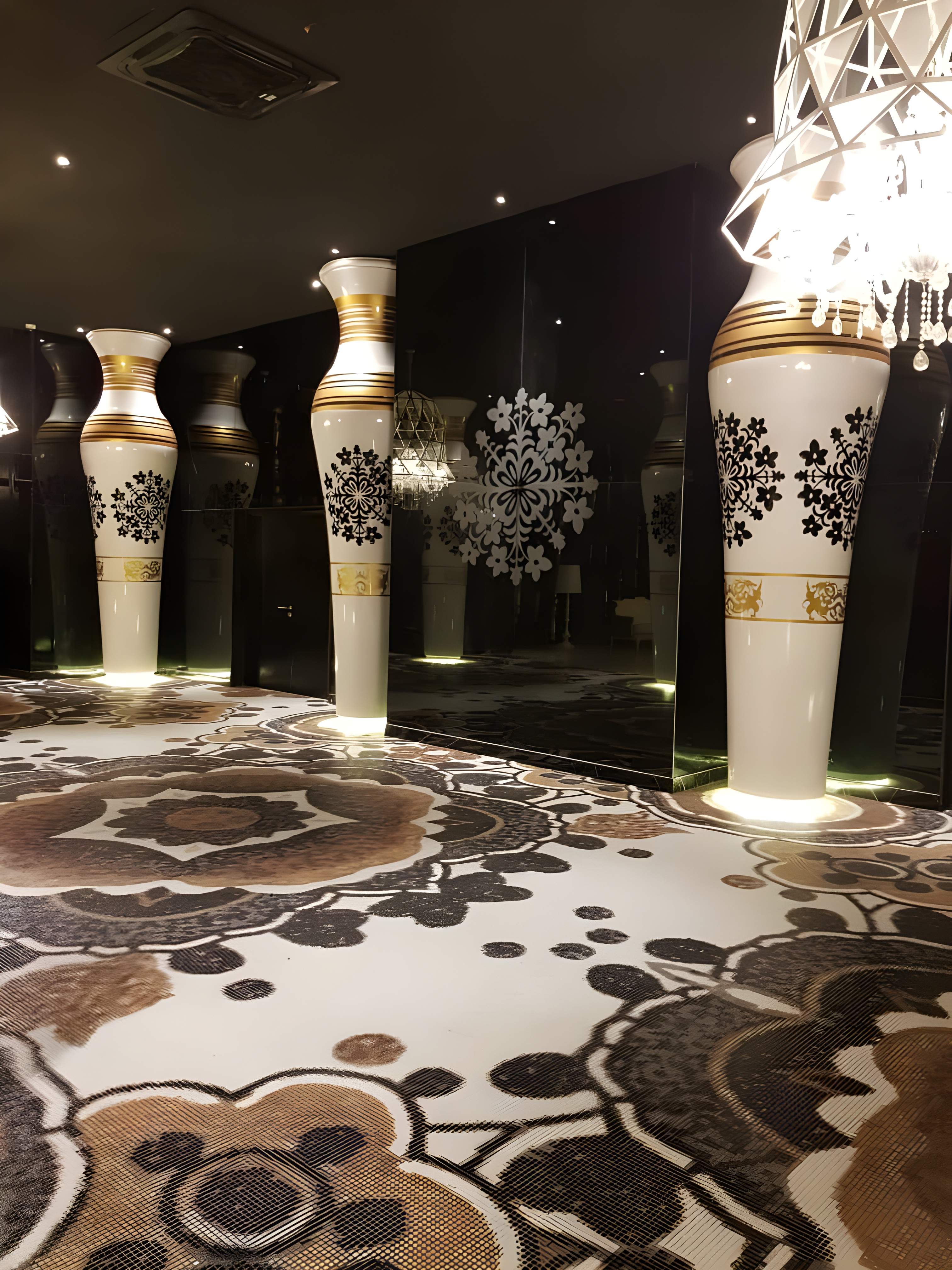 The interior design for the Arte Mont Kiara project is defined by a highly distinctive and bold Baroque Maximalism or Neo-Glamour aesthetic, creating a theatrical and surreal environment. The space features extensive use of glossy, dark materials, primarily black marble-look walls and flooring, which create a luxurious and reflective foundation. This opulent base is dramatically contrasted by elaborate polished gold/brass accents used for geometric floor inlays, decorative archways, and intricate framing elements. A key feature is the integration of surreal, oversized decorative elements, such as a large red leather tufted archway surrounding an entrance and massive, decorative white vase-like pillars with gold and black patterning, all set against mirrors to enhance the dramatic scale. The lighting is intentionally heavy and ornate, including multi-tiered crystal or geometric chandeliers and linear wall lighting, further contributing to the highly immersive, almost fantasy-like atmosphere of modern, high-end luxury.