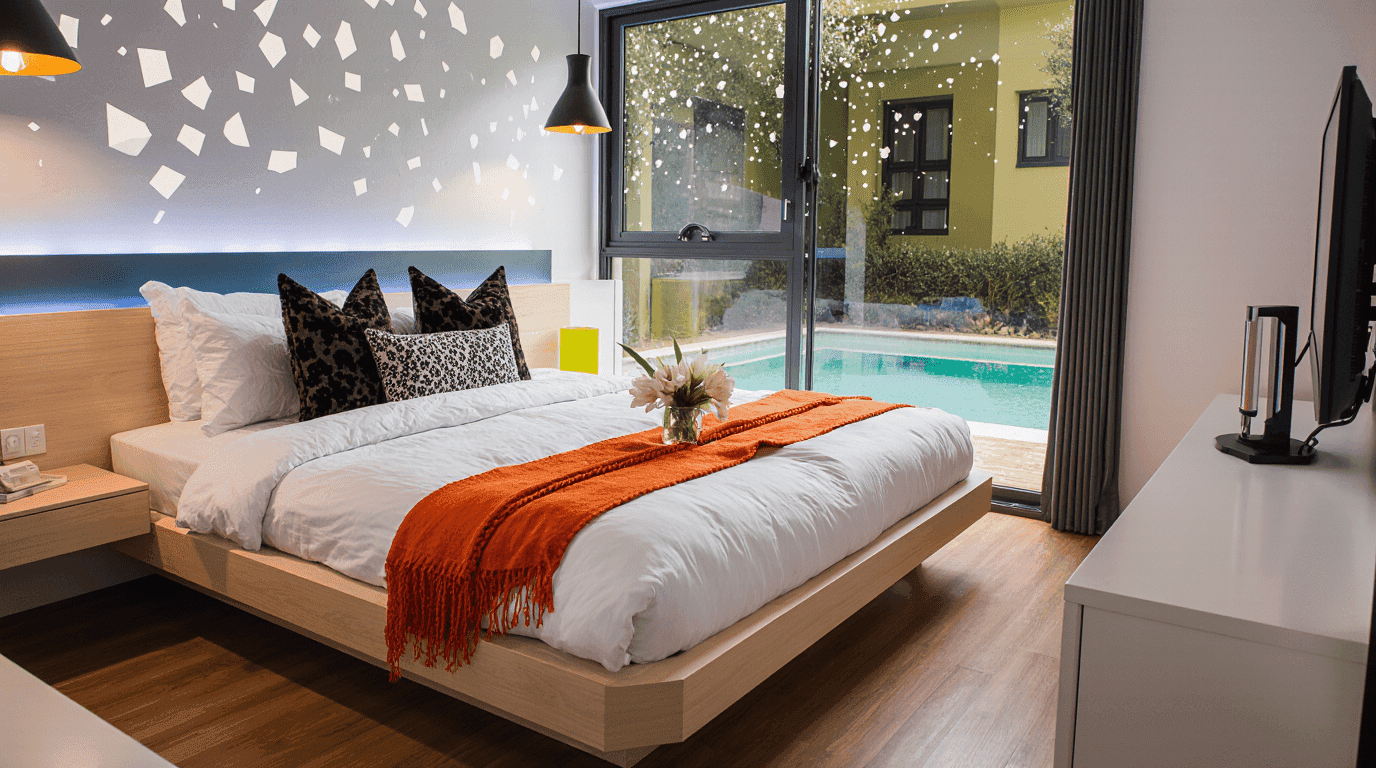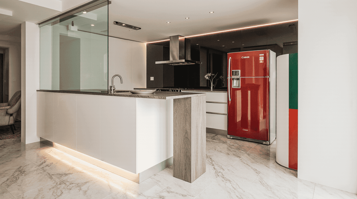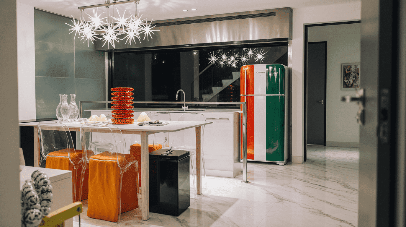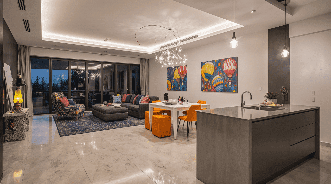 The interior design for the Arte S Bukit Gambir Room project follows the brand's signature Maximalist and Surreal aesthetic, creating a visually extravagant and high-concept environment. The space is characterized by a strong, almost dizzying visual vocabulary, utilizing a mix of dark, glossy surfaces and intricate architectural detailing to define its luxurious mood. Key features include complex geometric patterns on the ceiling and walls, often highlighted by dramatic recessed or strip lighting in deep tones like blue and purple, which accentuate the sculptural forms of the architecture. The design employs highly polished materials, such as black marble-look flooring and walls, contrasted with metallic and reflective elements, and often incorporates large, abstract decorative structures or furniture that feel more like art installations than typical functional pieces. The overall impression is one of opulent, futuristic glamour and intentional visual excess, designed to be highly memorable and experiential.