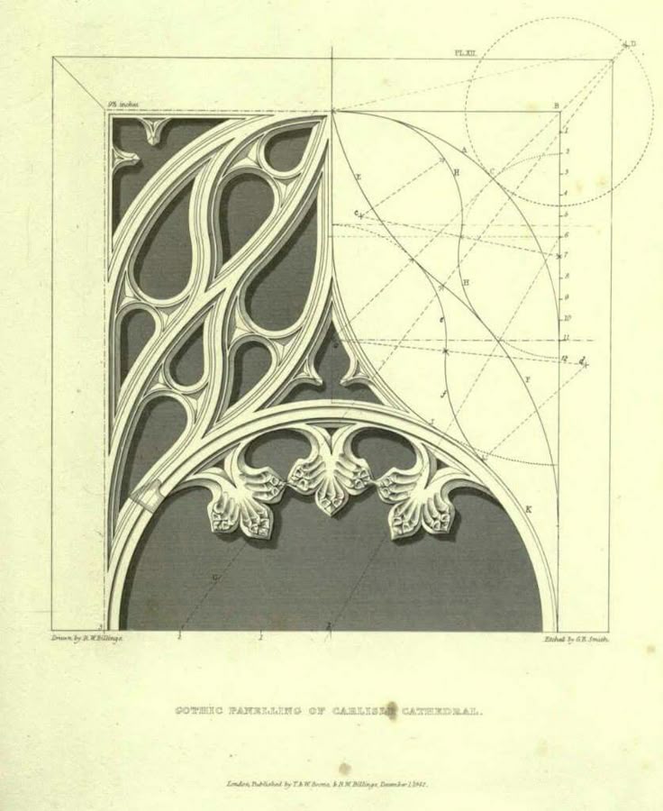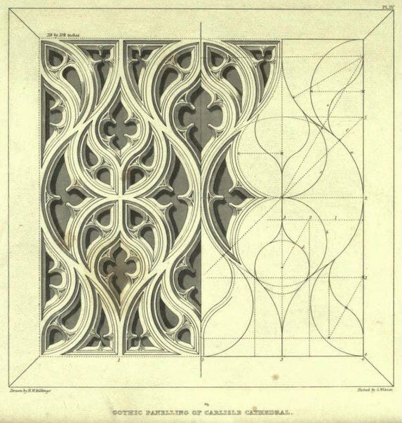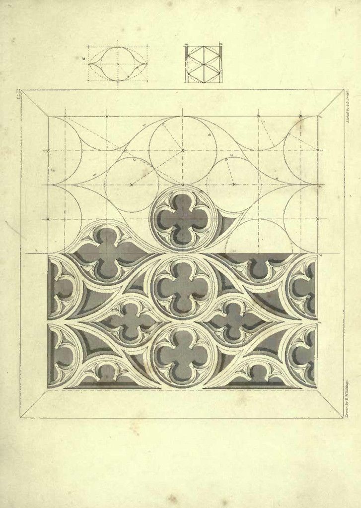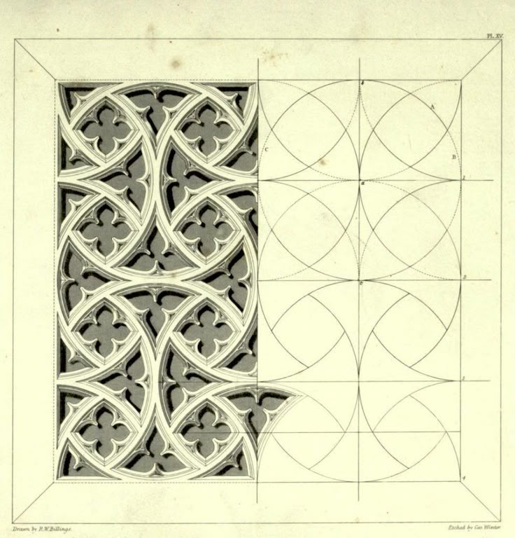 The graphic design for the GFRC Design Schematics sketches illustrate the complex geometric construction underlying classical architectural ornamentation. The visuals are technical study drawings that break down intricate Gothic-style tracery into their fundamental mathematical components, utilizing a network of construction lines, radii, and center points to define precise arcs and circles. Key motifs include interlocking quatrefoils and trefoils set within pointed arches or rectangular panels, demonstrating a rigorous approach to modular design. The graphics serve as a blueprint for fabrication, highlighting the transition from abstract geometry to tangible form, likely intended to guide the creation of precise molds for casting reinforced concrete panels.