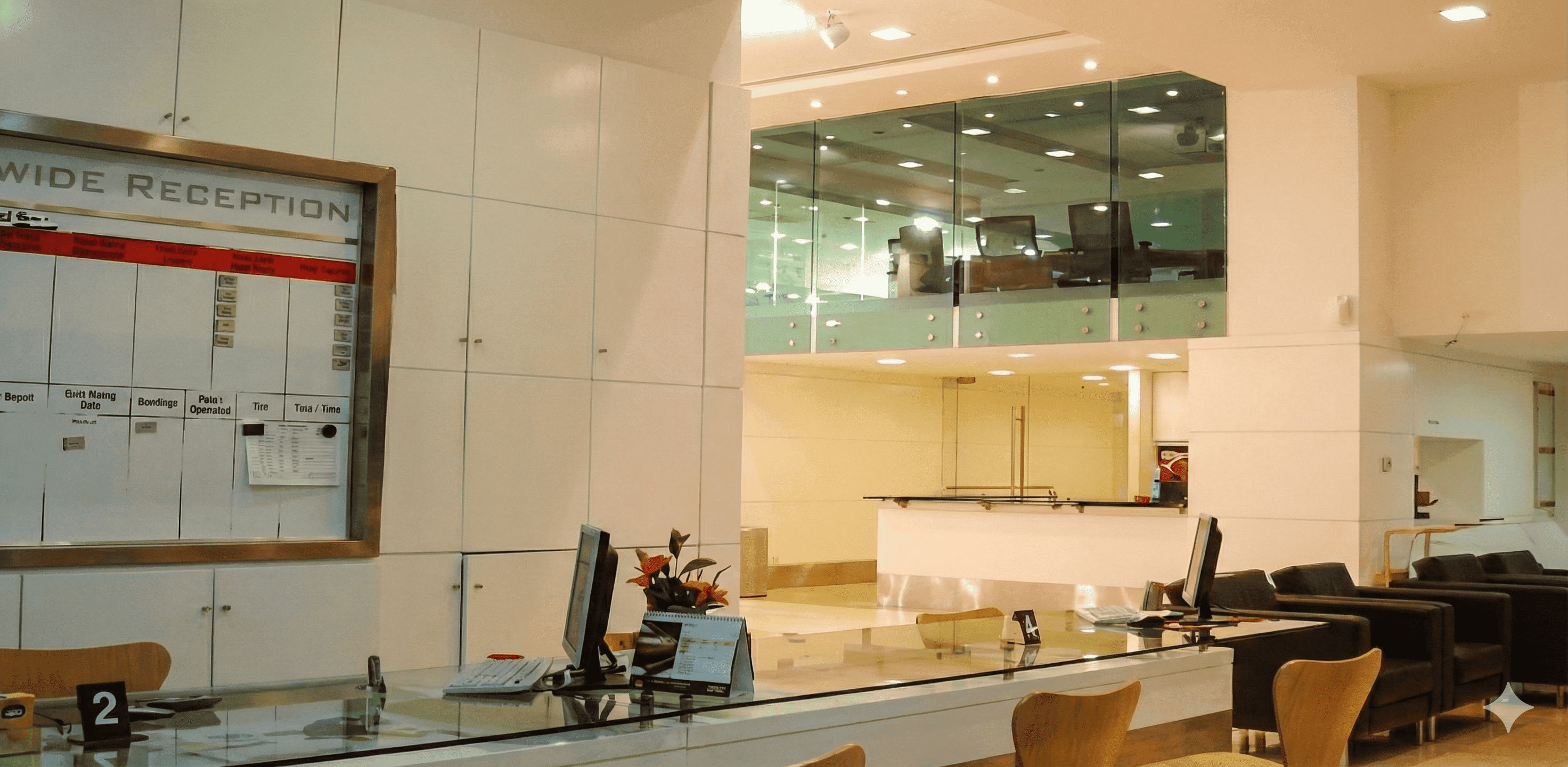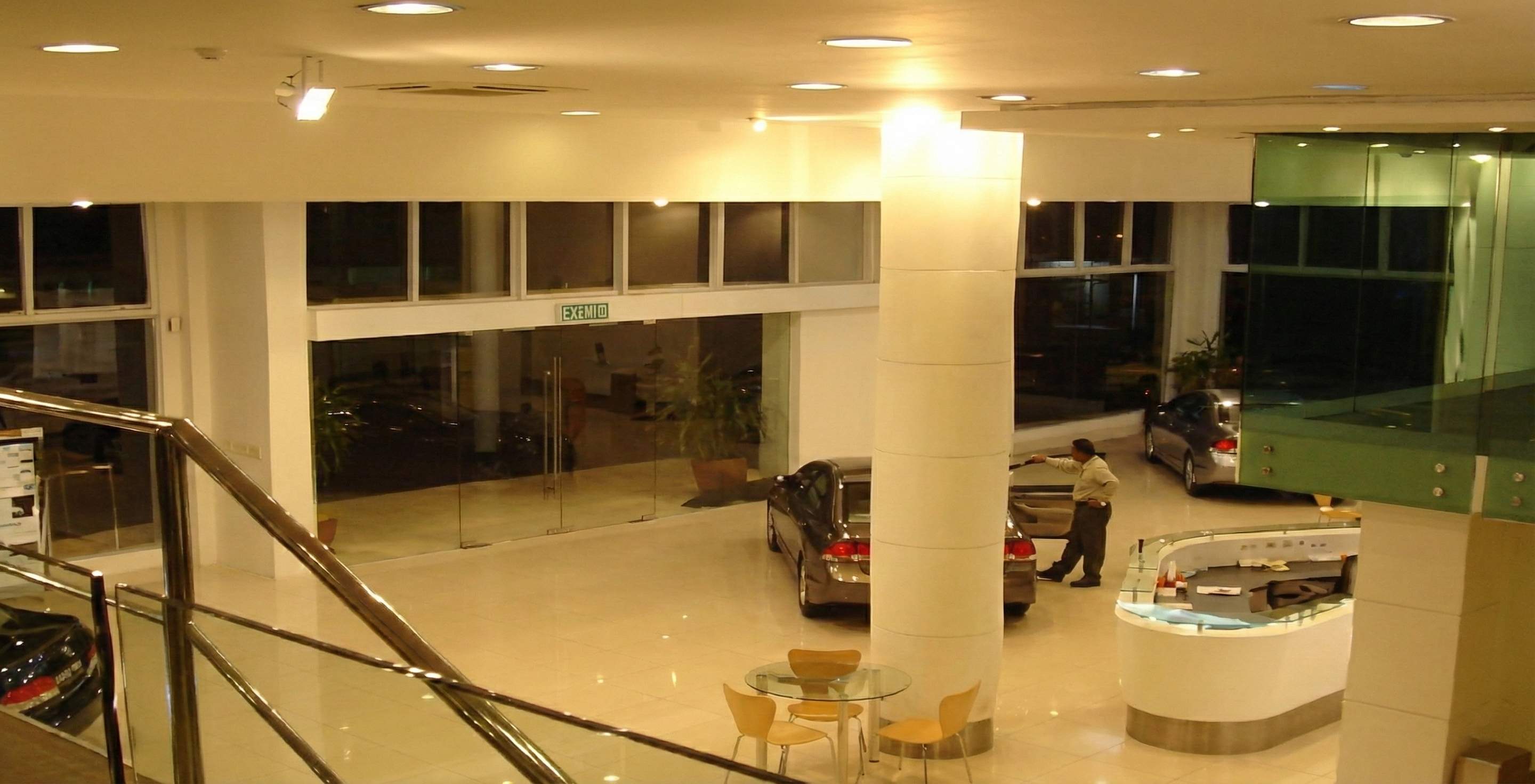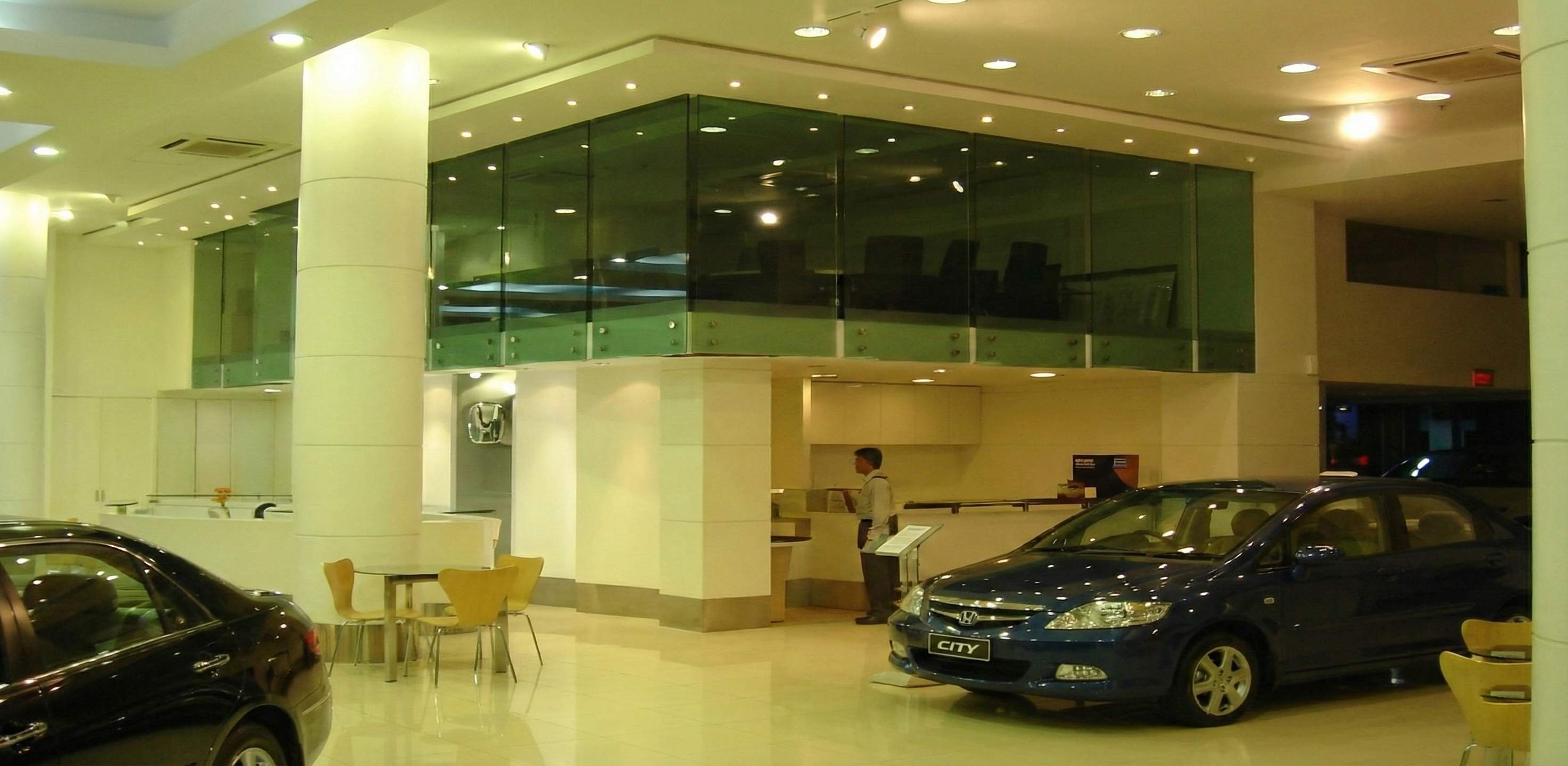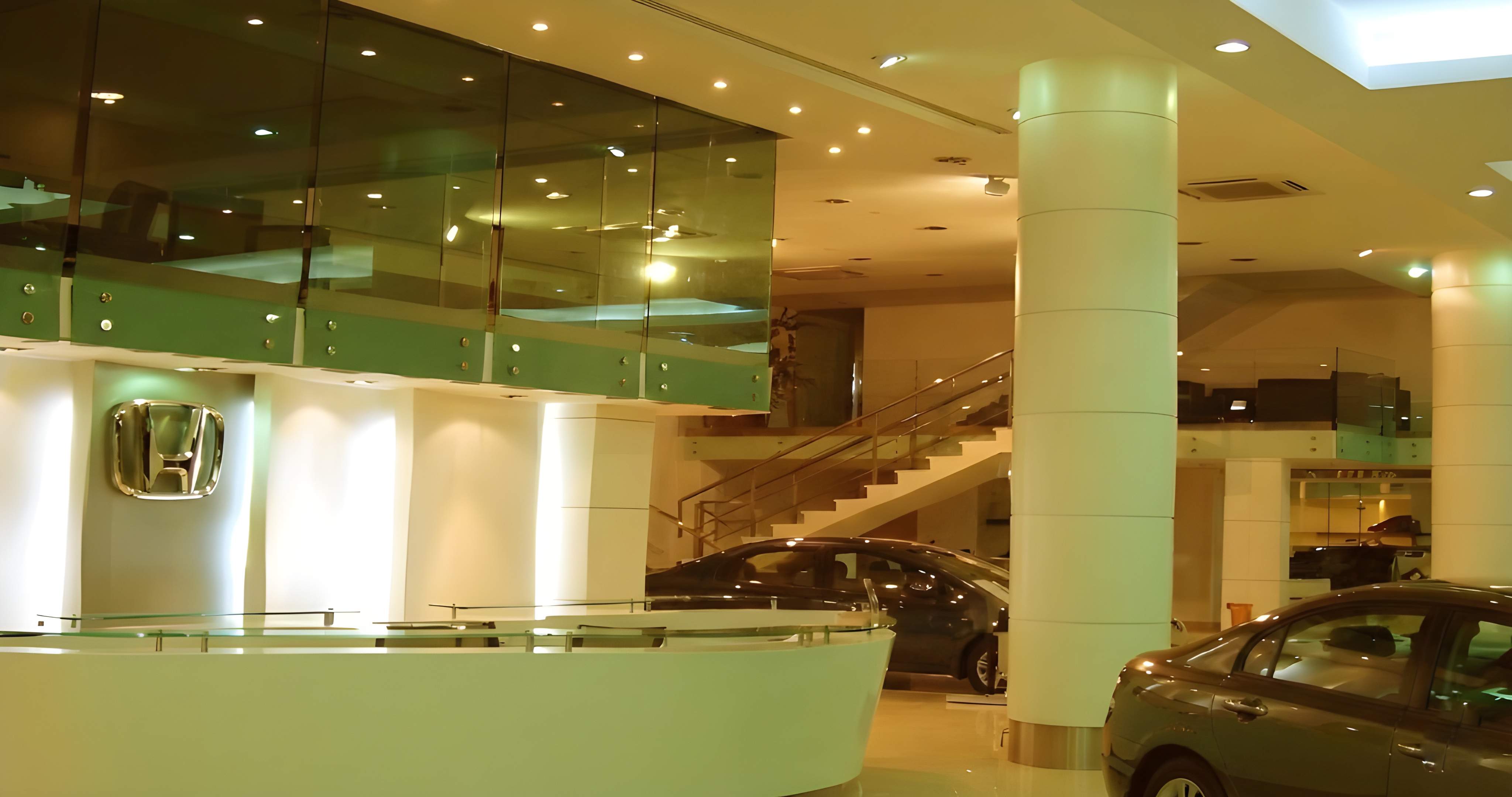 The interior design for the Honda 3S Centre showcases a modern, bright, and highly professional automotive retail environment, emphasizing transparency and brand identity. The showroom is characterized by an expansive, open-plan layout with glossy, light cream tiled flooring that reflects the ample artificial lighting, creating a pristine stage for vehicle display. A key architectural feature is the double-height volume in the main showroom, which incorporates a mezzanine level with green-tinted glass railings, housing administrative offices that overlook the sales floor. The reception area is sleek and functional, featuring a curved white counter with light wood accents and integrated technology, supported by a prominent, cylindrical white column. The color palette is strictly corporate, utilizing clean whites, silvers, and the brand's signature blue in vehicle models, while customer waiting areas are furnished with minimalist black leather seating and simple wooden tables, projecting an image of efficiency, reliability, and modern service.