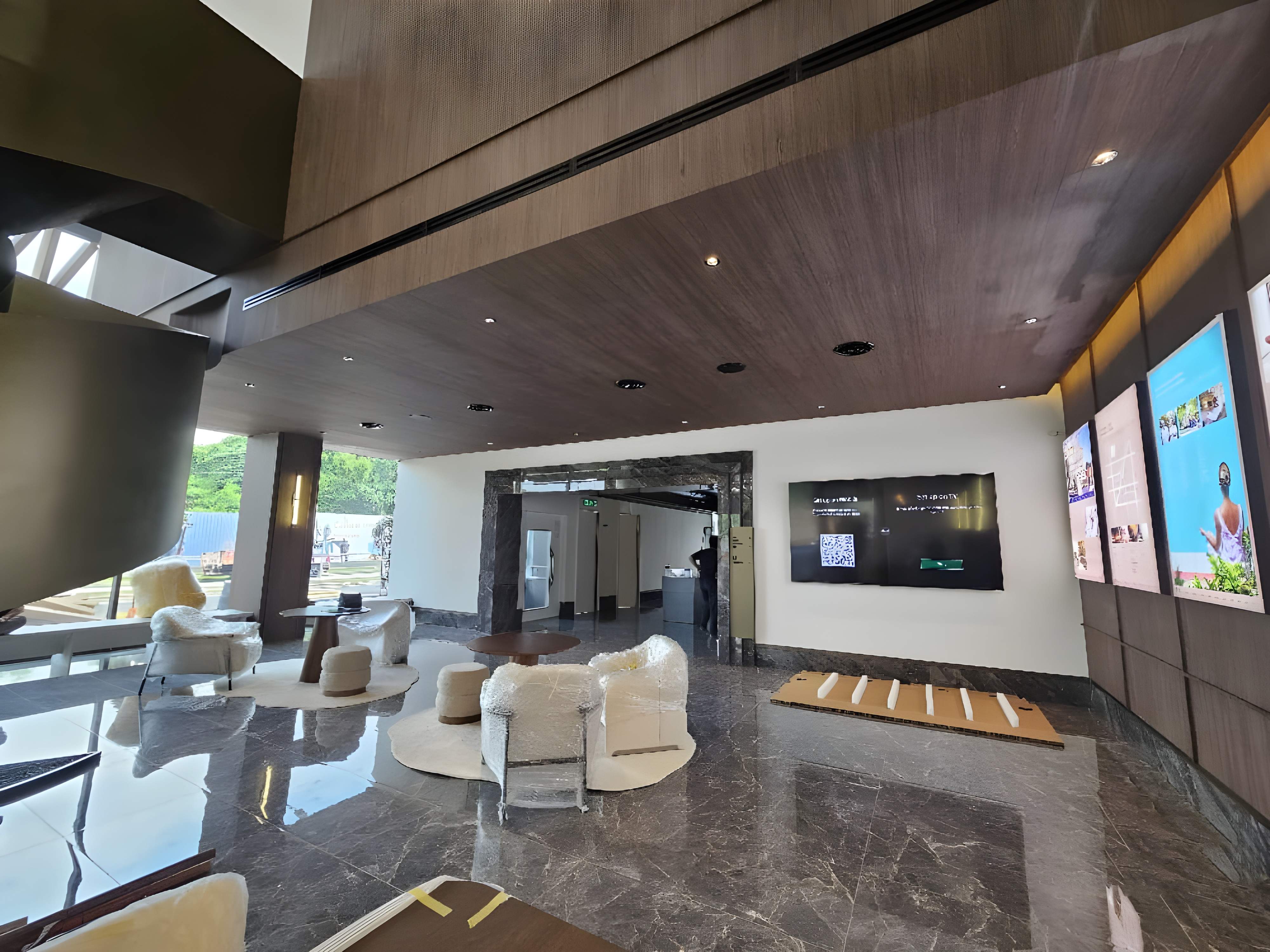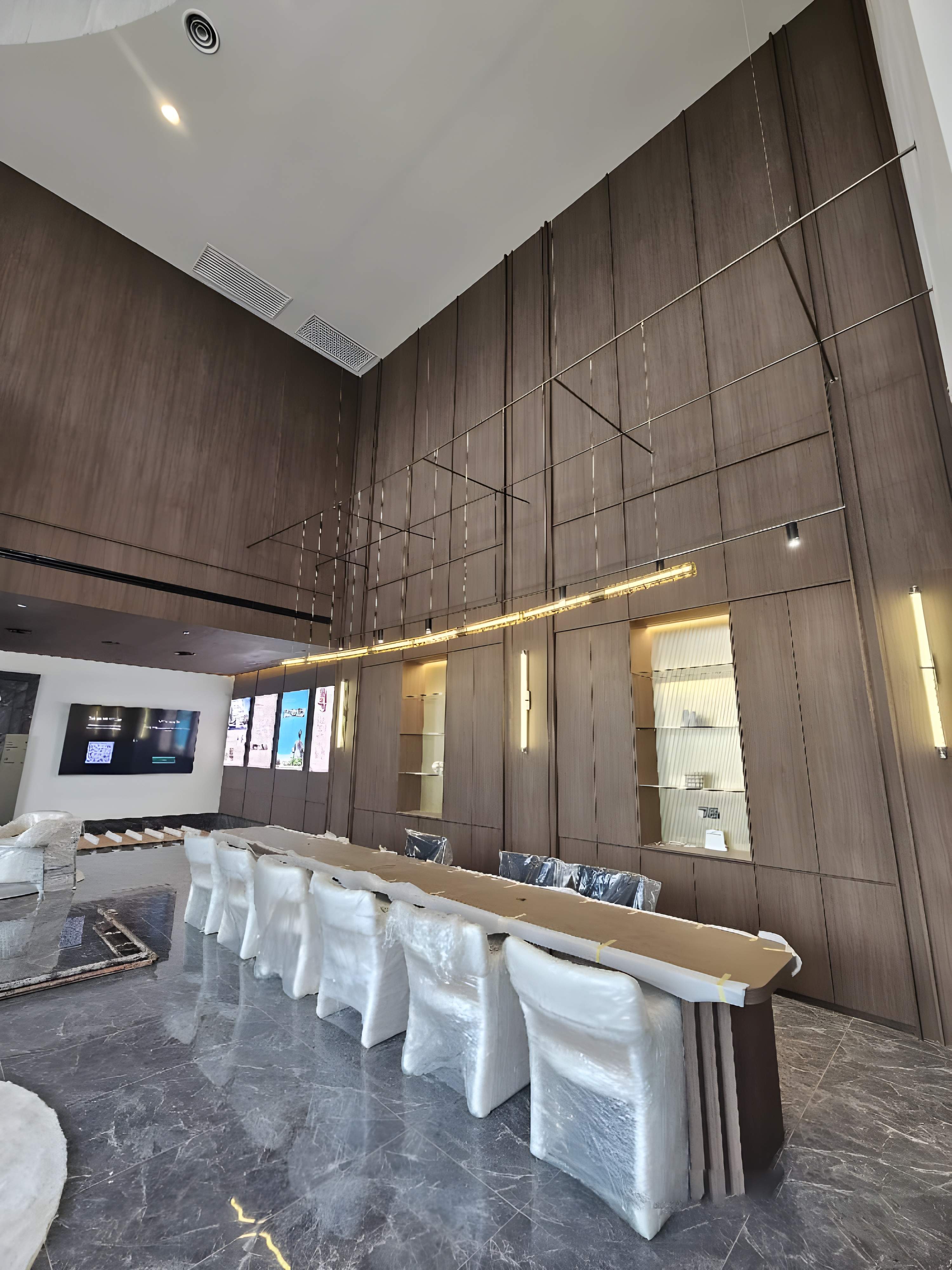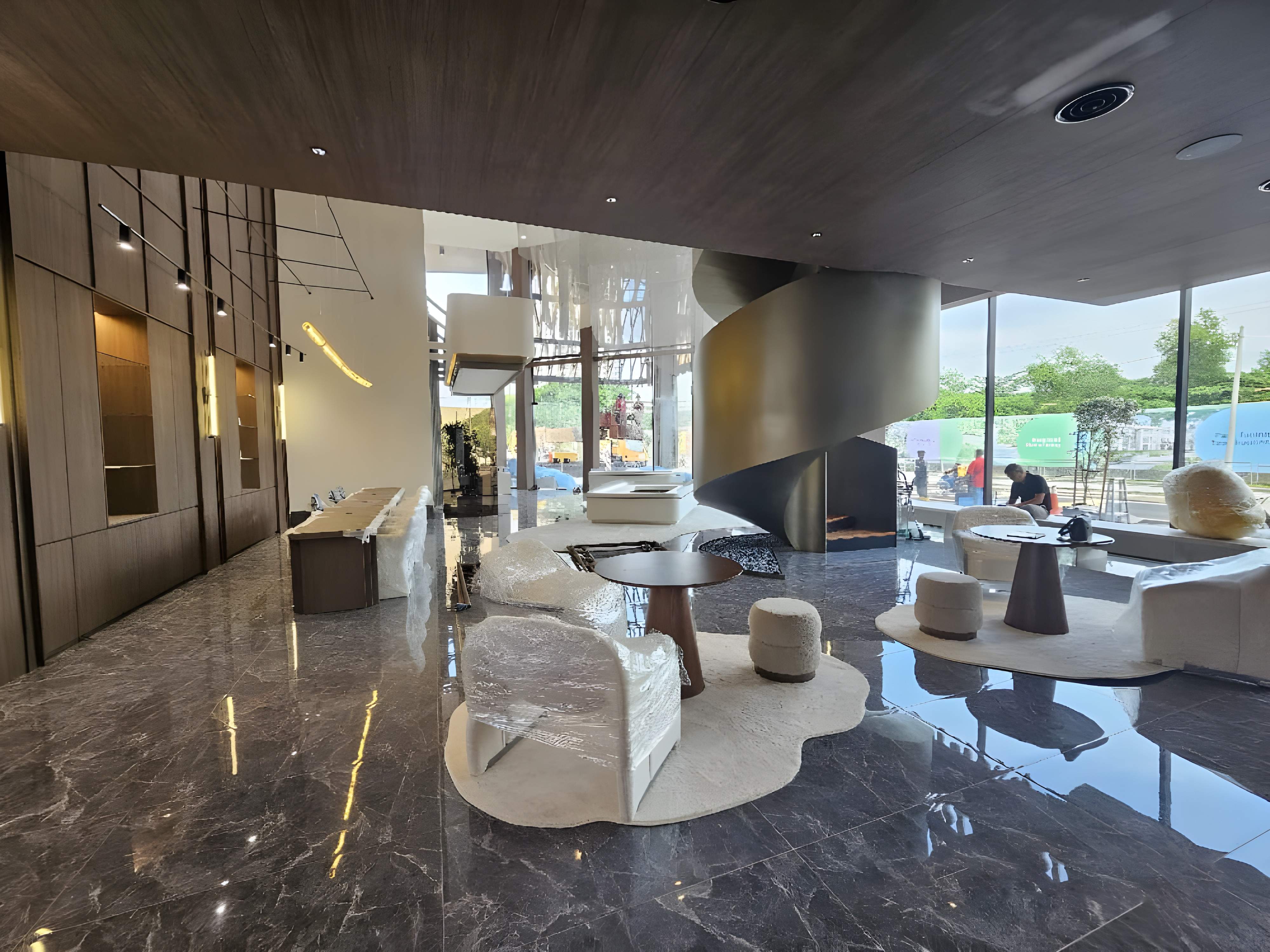 The interior design for the JRK Sales Gallery showcases a bold, high-contrast Modern Corporate Glamour aesthetic, designed to be impactful and immediately convey a sense of prestige and quality. The space is defined by a striking black and white monochromatic palette, primarily utilizing high-gloss black marble-look surfaces for the floor and reception counter, sharply contrasted with pristine white walls and ceilings. This drama is enhanced by the strategic use of metallic gold accents in detailing, trim work, and unique, modern lighting fixtures, which elevate the space from corporate to luxurious. Key features include a massive, curved white reception counter set against a backdrop of sophisticated dark grey/black vertical wall paneling illuminated by subtle cove lighting. The waiting and presentation areas feature contemporary furniture with soft, neutral upholstery and velvet textures, such as the curved white seating, complemented by a large, minimalist round gold pendant light. The design successfully employs geometric precision and a rich material selection to deliver a high-end gallery environment that is both visually stunning and professionally commanding.