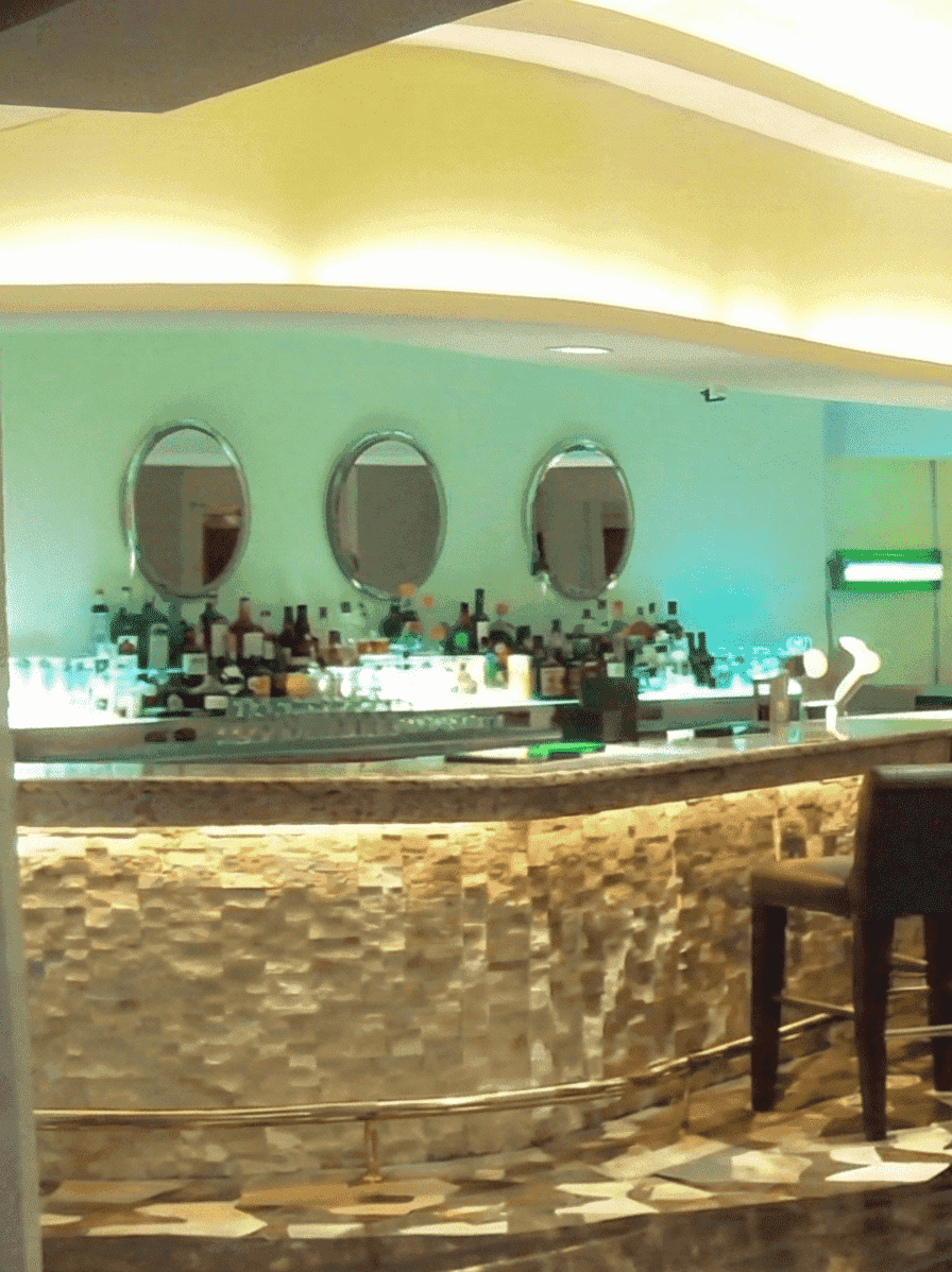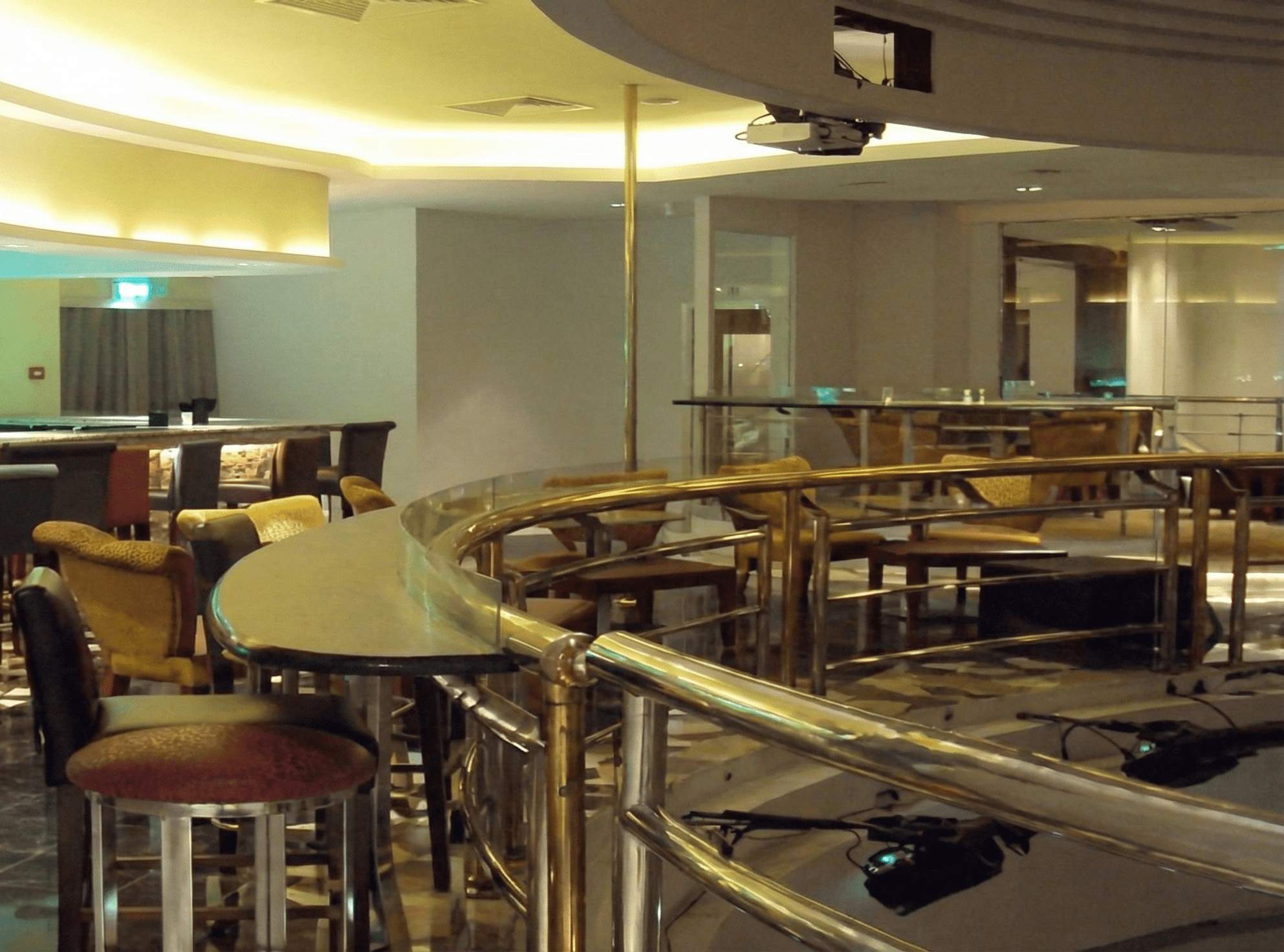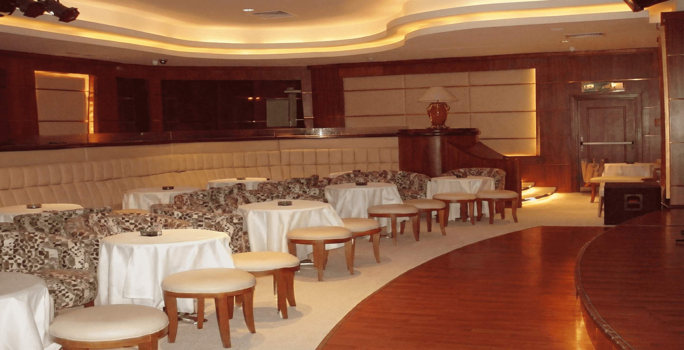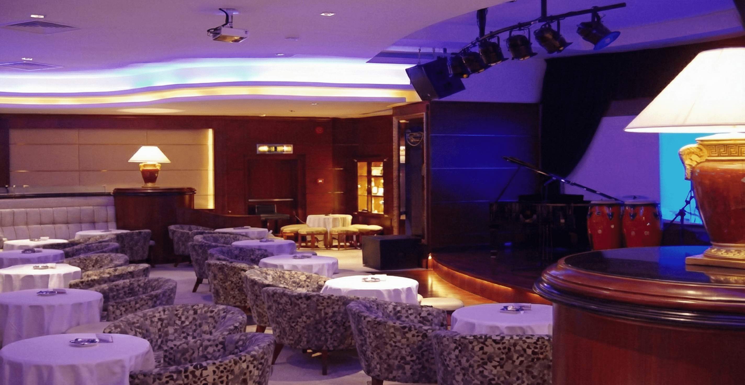 The interior design for the Kit Kat Lounge & Supper Club envisions an opulent, theatrical, and atmospheric entertainment venue that creates a seamless transition between intimate dining and vibrant nightlife. The aesthetic is defined by a sophisticated base of rich wood paneling and plush, patterned armchairs, establishing a classic 'supper club' vibe. A key design element is the dynamic lighting scheme, featuring stepped ceiling coves with color-changing LED strips (shifting from warm ambers to deep blues and purples) that allow the mood to transform from a relaxed dinner setting to an energetic club atmosphere. The layout centers around two main focal points: a raised performance stage equipped for live music with a grand piano, and a glamorous bar area defined by a textured stone counter front and retro-style oval mirrors. Polished gold or brass railings and curved architectural lines guide the flow of the space, adding a touch of metallic luxury to the overall dark, moody, and exclusive environment.