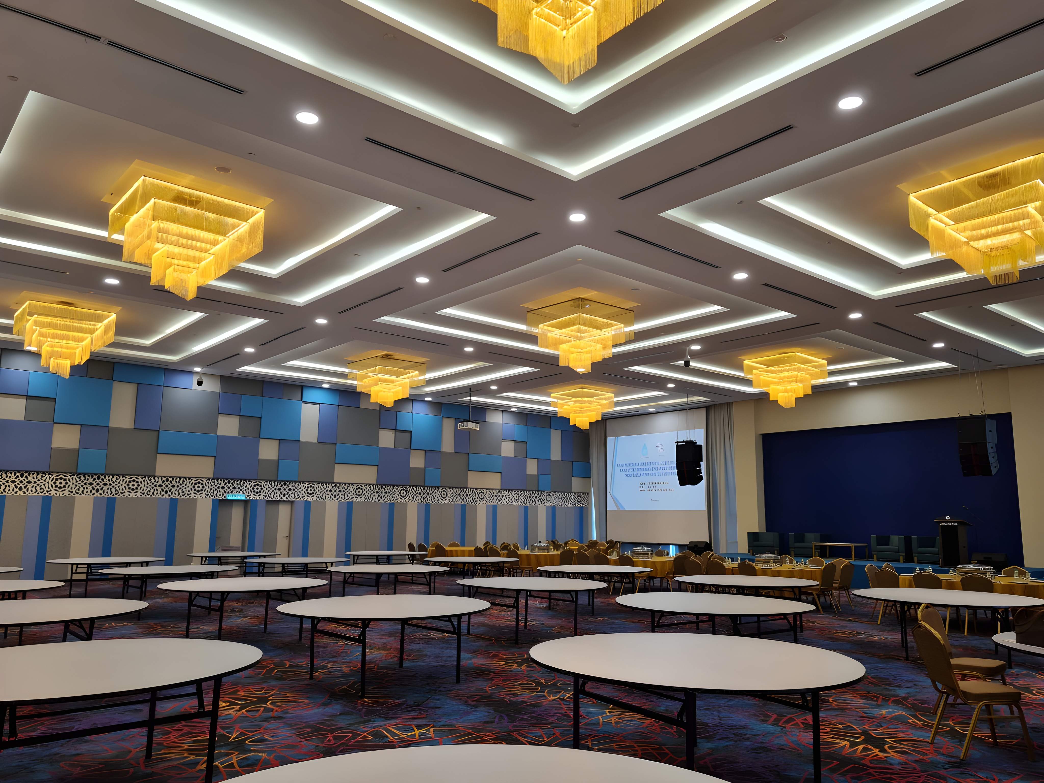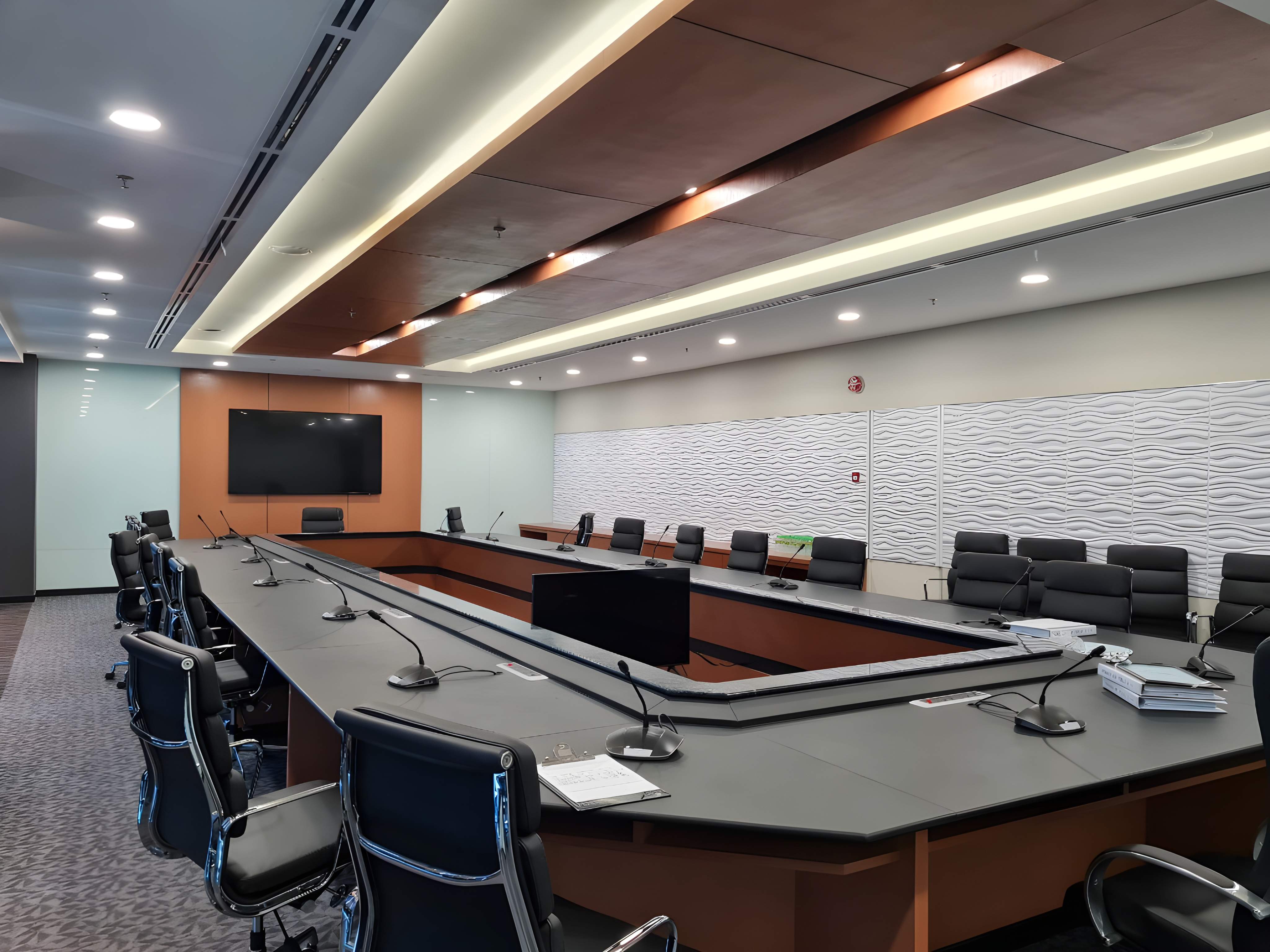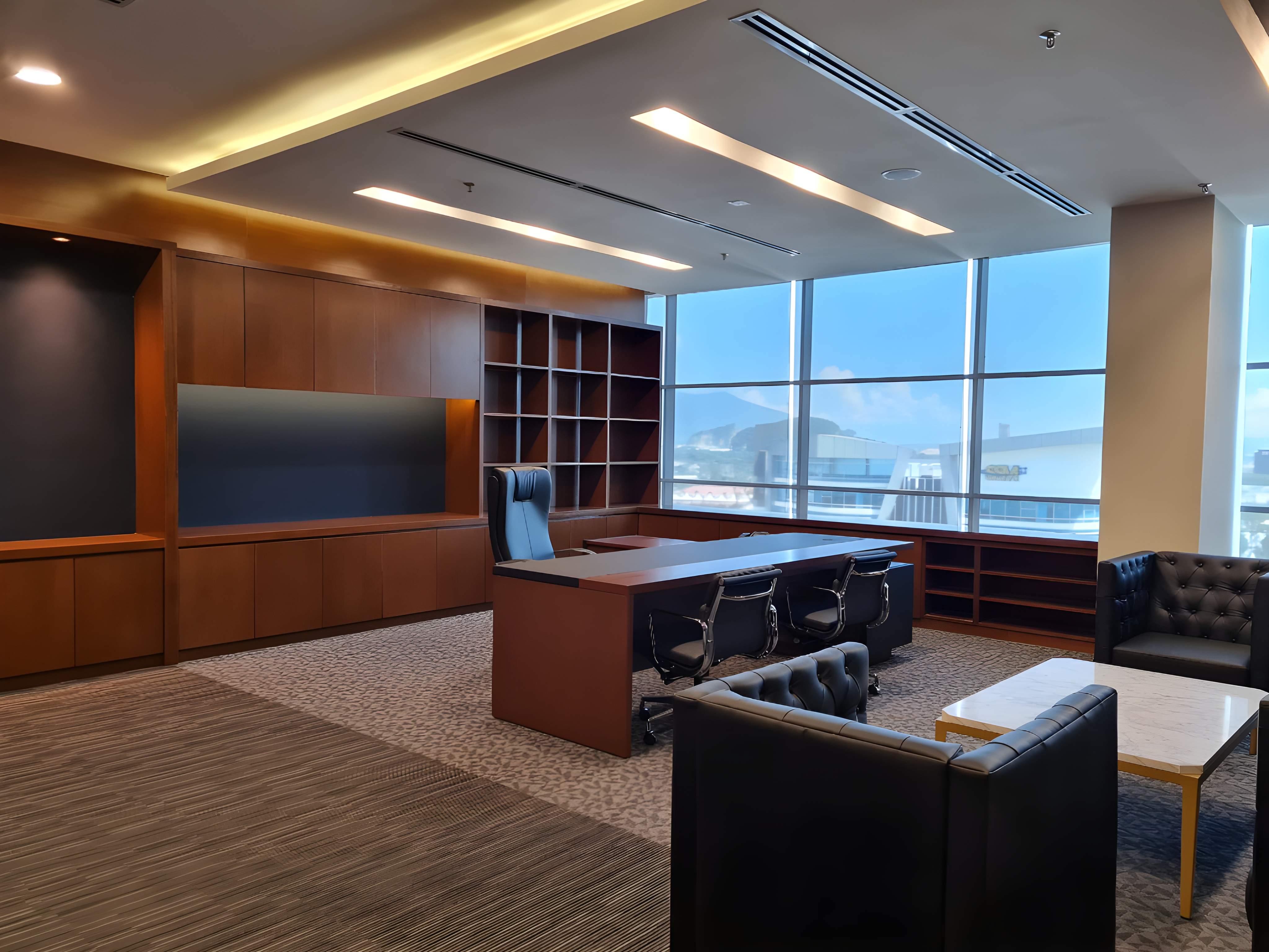 The interior design for the Lembaga Air Perak(LAP) Ipoh project establishes a modern, professional, and visually dynamic corporate environment, blending structured corporate elements with contemporary flair. The aesthetic is defined by a bold use of primary white and cool grey tones contrasted with strategic accents of bright royal blue and warm wood. The design emphasizes clean lines and geometric patterns, notably featuring a dynamic ceiling design composed of angular, linear elements and integrated strip lighting that creates a high-tech feel. The main reception area is impactful, featuring a substantial, curved white counter set against a backdrop of sophisticated dark grey/black vertical slats that add texture and depth. Throughout the space, large digital display screens are integrated seamlessly into the wall paneling, reinforcing a forward-thinking and technologically advanced image. The flooring utilizes polished light-toned tiles with subtle geometric patterns, while a large, patterned rug in the waiting area adds a touch of color and softness, ensuring the overall look is one of streamlined efficiency, modern professionalism, and high energy.