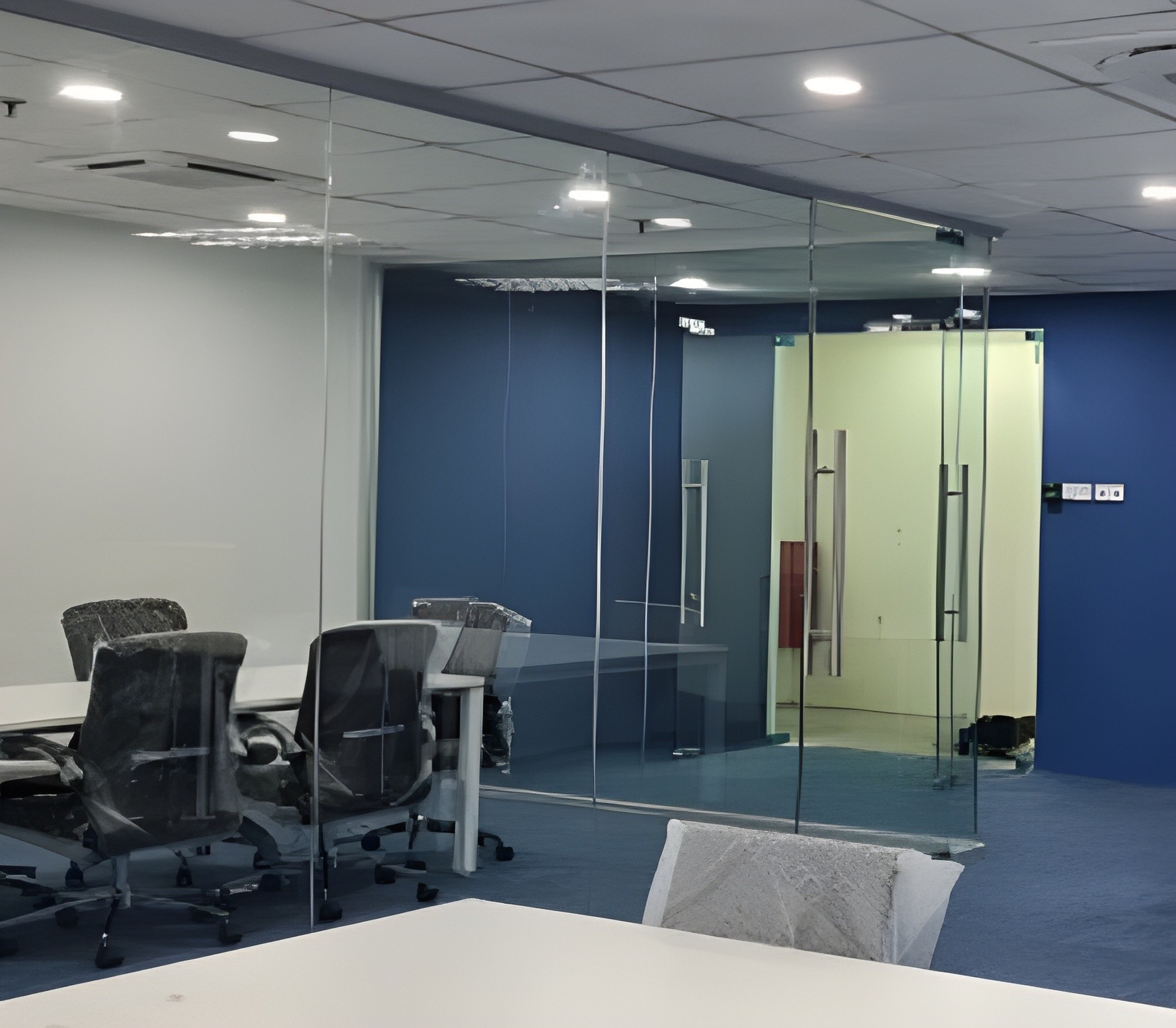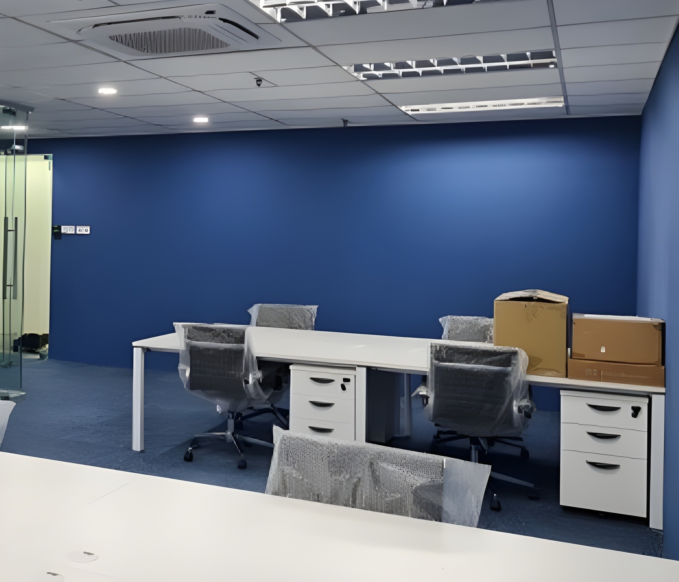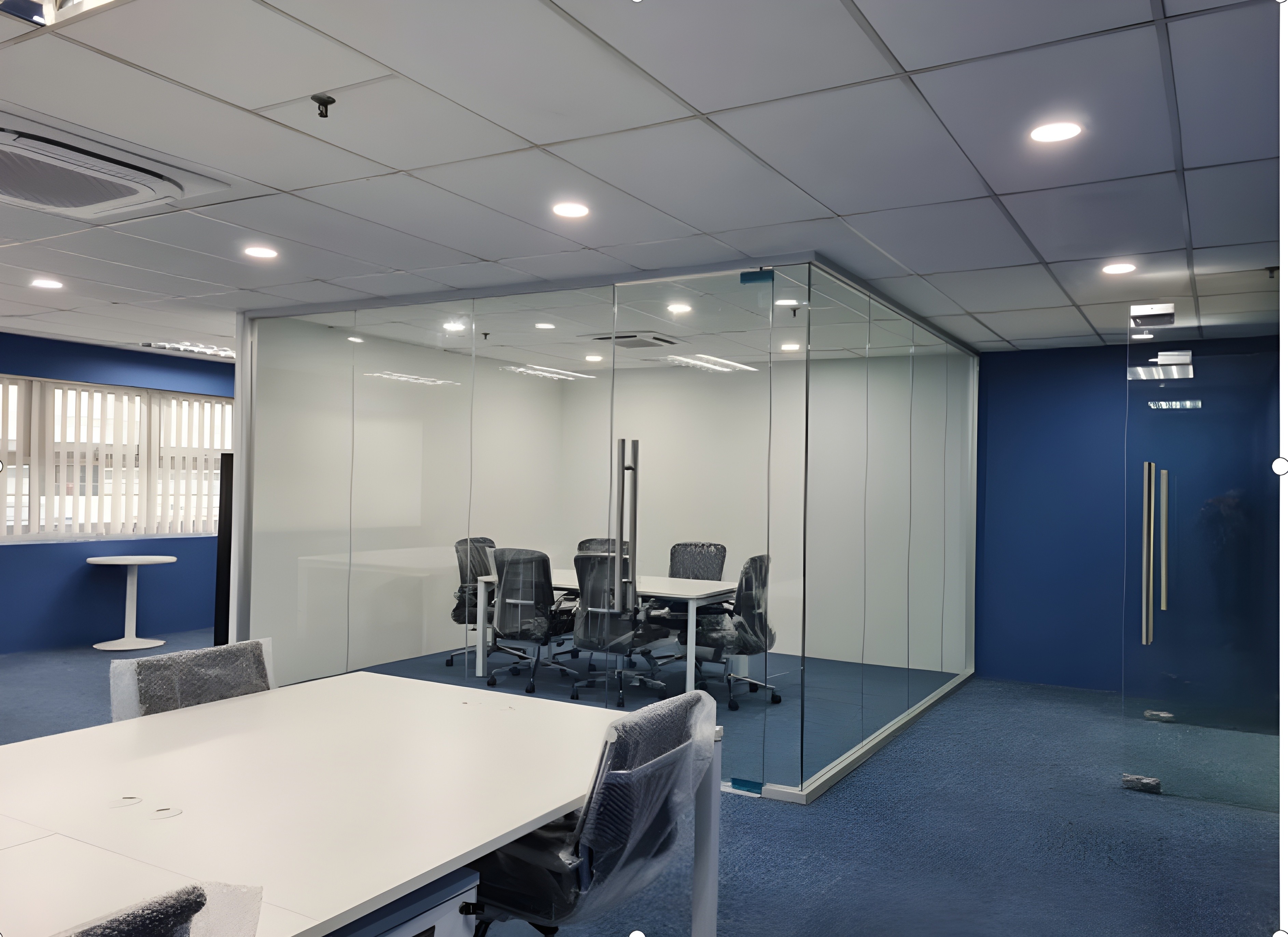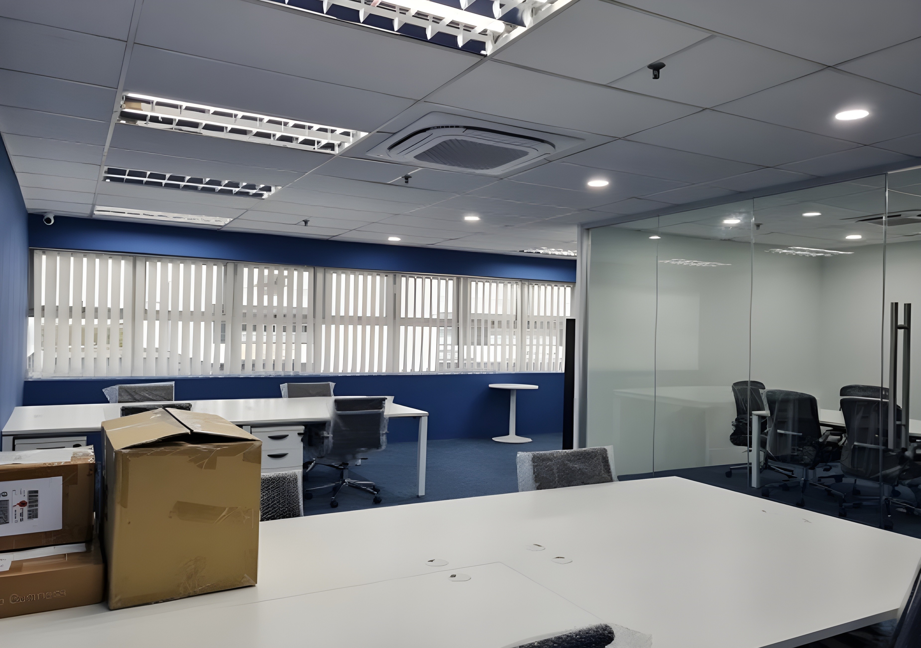 The interior design for the Mainfreight Logistics office effectively merges a professional corporate identity with a bright, dynamic, and partially industrial aesthetic suitable for a logistics company. The design utilizes a crisp, functional base of polished concrete-look or light grey flooring, contrasted with clean white walls and ceilings. A key visual element is the strategic use of the company's bright red brand color in accents, notably on vertical support pillars, framed meeting room doors, and chair upholstery, which injects energy and strong brand identity throughout the space. The design of the meeting and collaborative areas emphasizes transparency and natural light, achieved through full-height glass partitions with minimal black framing. The open workspace features clean, long desk banks with integrated storage, while the informal meeting areas introduce textural contrast with vertical wood-slat feature walls and custom bench seating. Overall, the design delivers a workspace that is highly efficient, structured, and visually reinforces the company's clear, streamlined corporate presence.