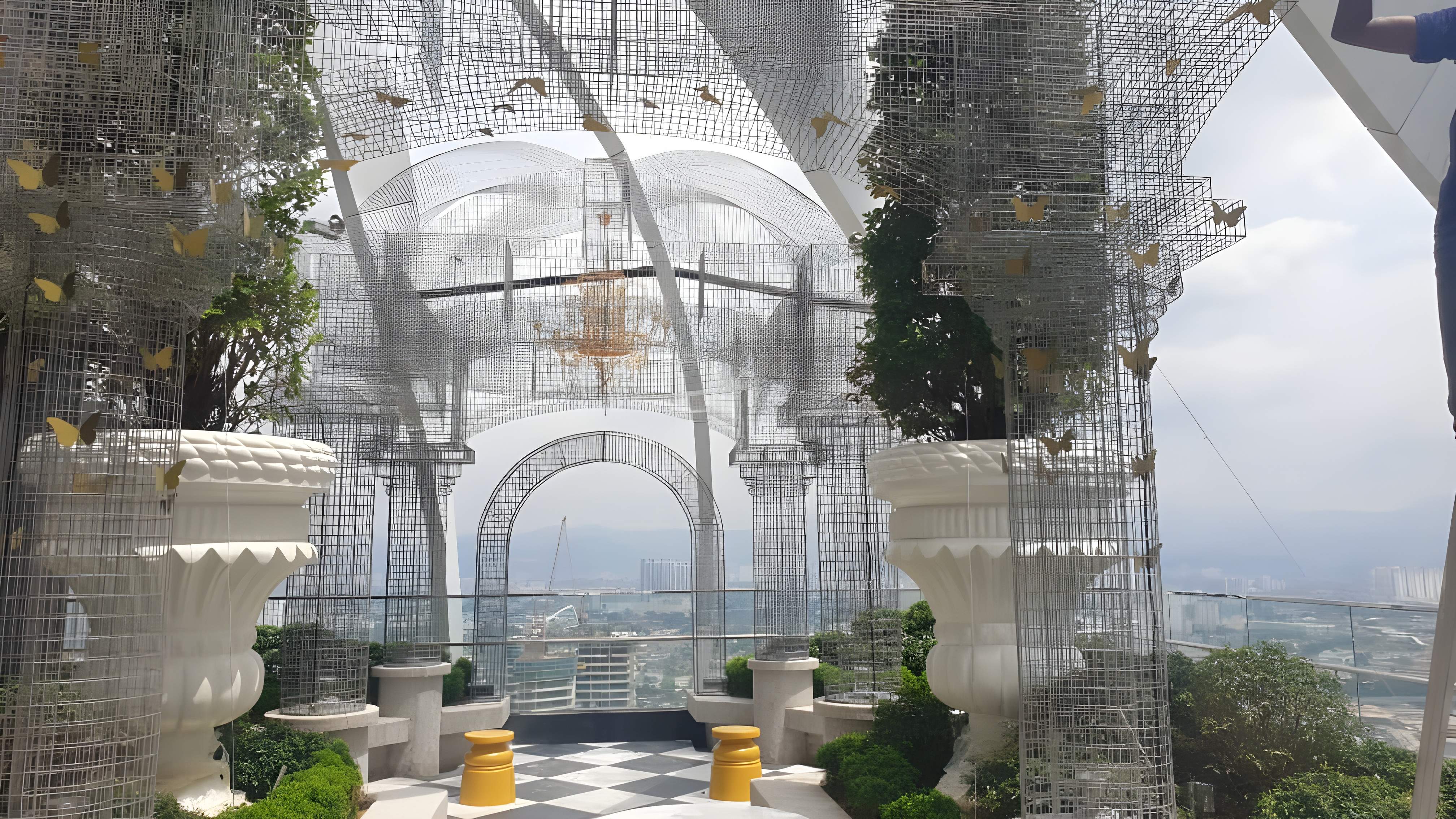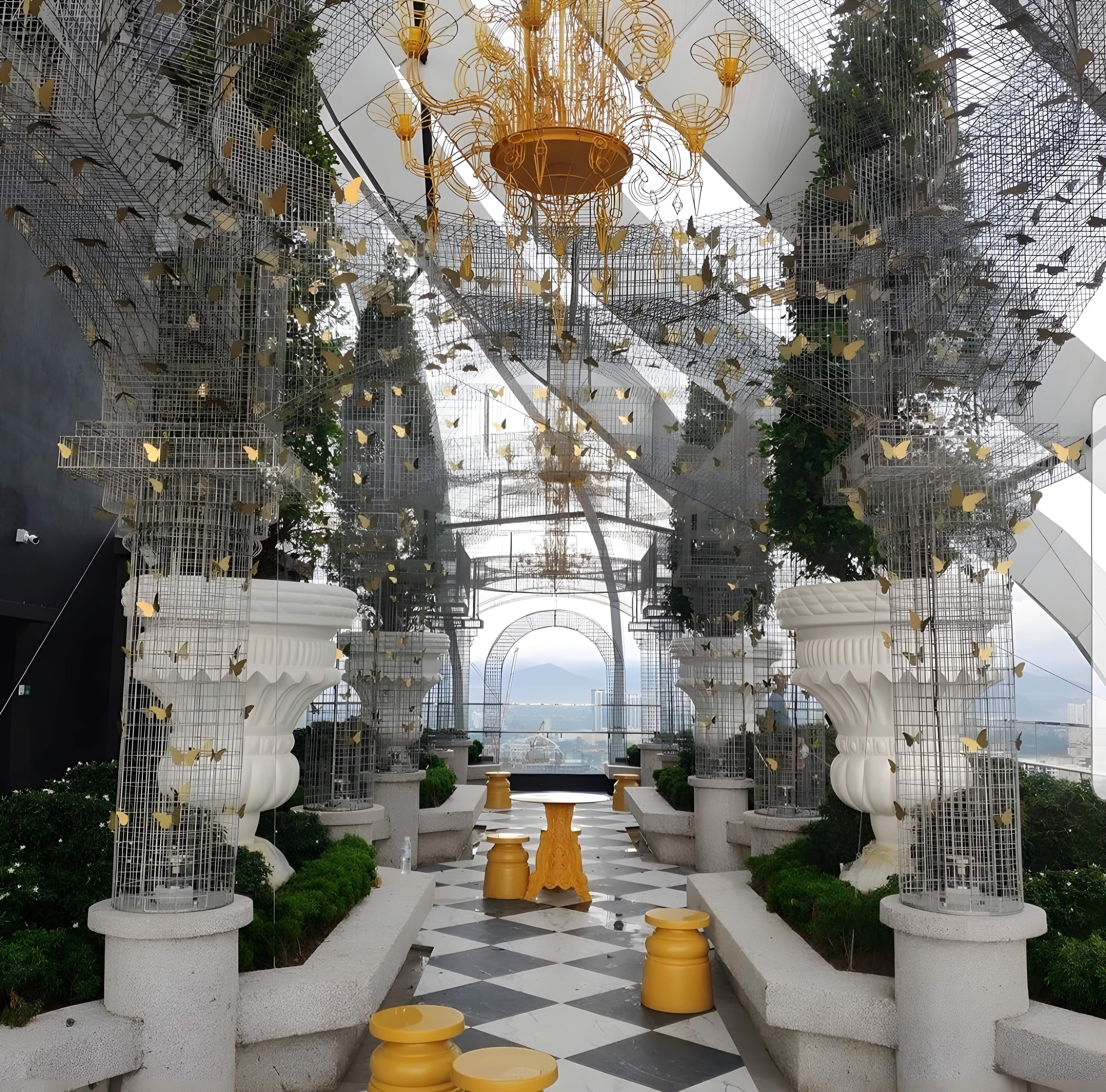 The interior design for the Arte Mesh Garden project in Mont Kiara showcases a dramatic, surreal, and highly textured aesthetic, delivering an immersive environment best characterized as Industrial Maximalism with Biophilic Elements. The design boldly features raw, industrial textures, particularly rough grey concrete-look walls and flooring, which provides a rugged backdrop for the elaborate detailing. Contrast is achieved through the extensive use of vertical metal mesh screening and fencing, which defines walkways and creates caged, geometric zones, often layered with lush, artificial greenery to simulate an overgrown, controlled garden or sanctuary. This biophilic element is further emphasized by large planters and ceiling treatments incorporating foliage. The color palette is dark and moody, dominated by grey and black, punctuated by subtle metallic gold/brass accents on feature walls and signage, and often highlighted by dramatic, focused lighting, giving the space an artistic, high-concept, and visually heavy character that feels simultaneously industrial and fantastical.