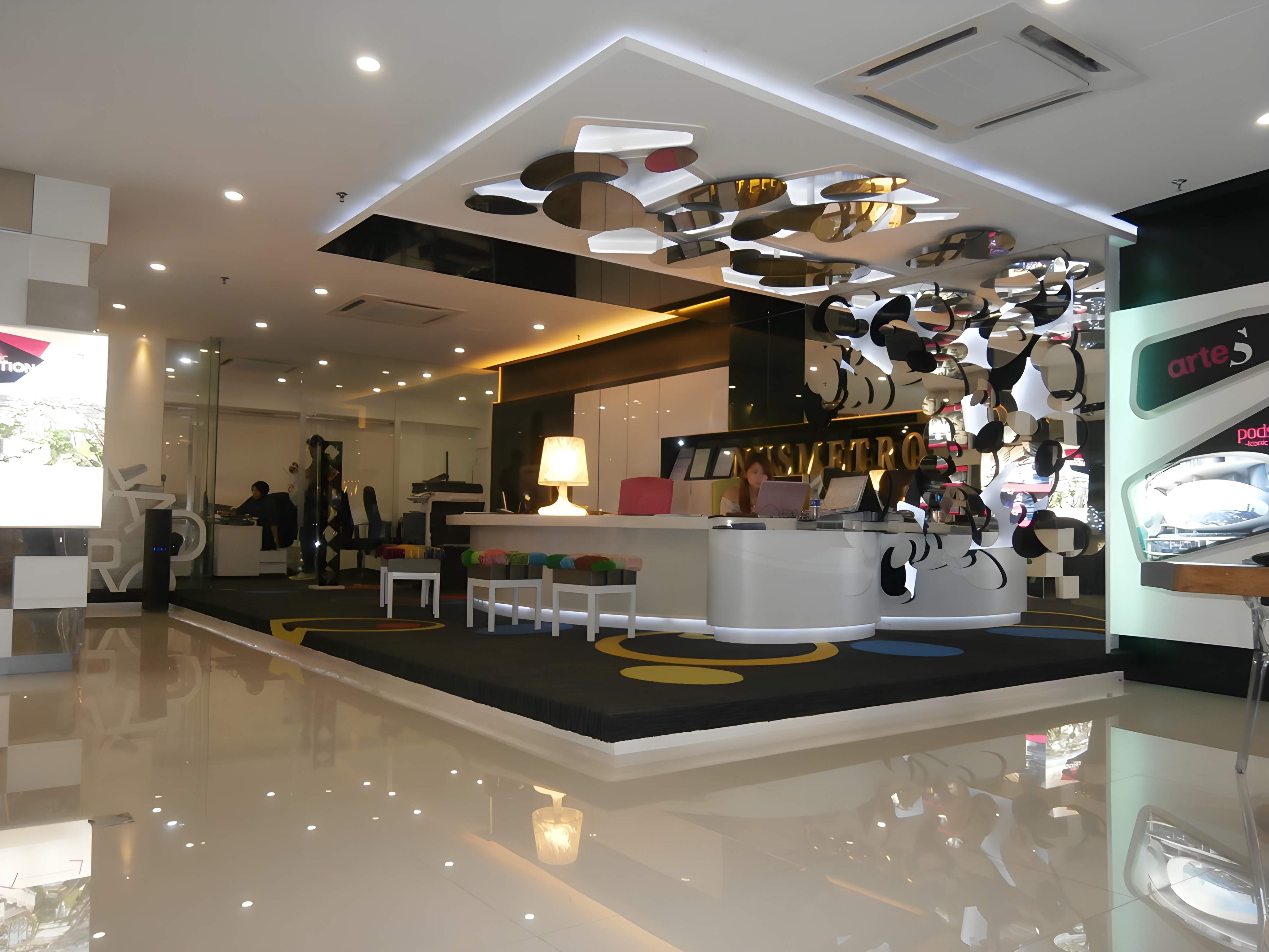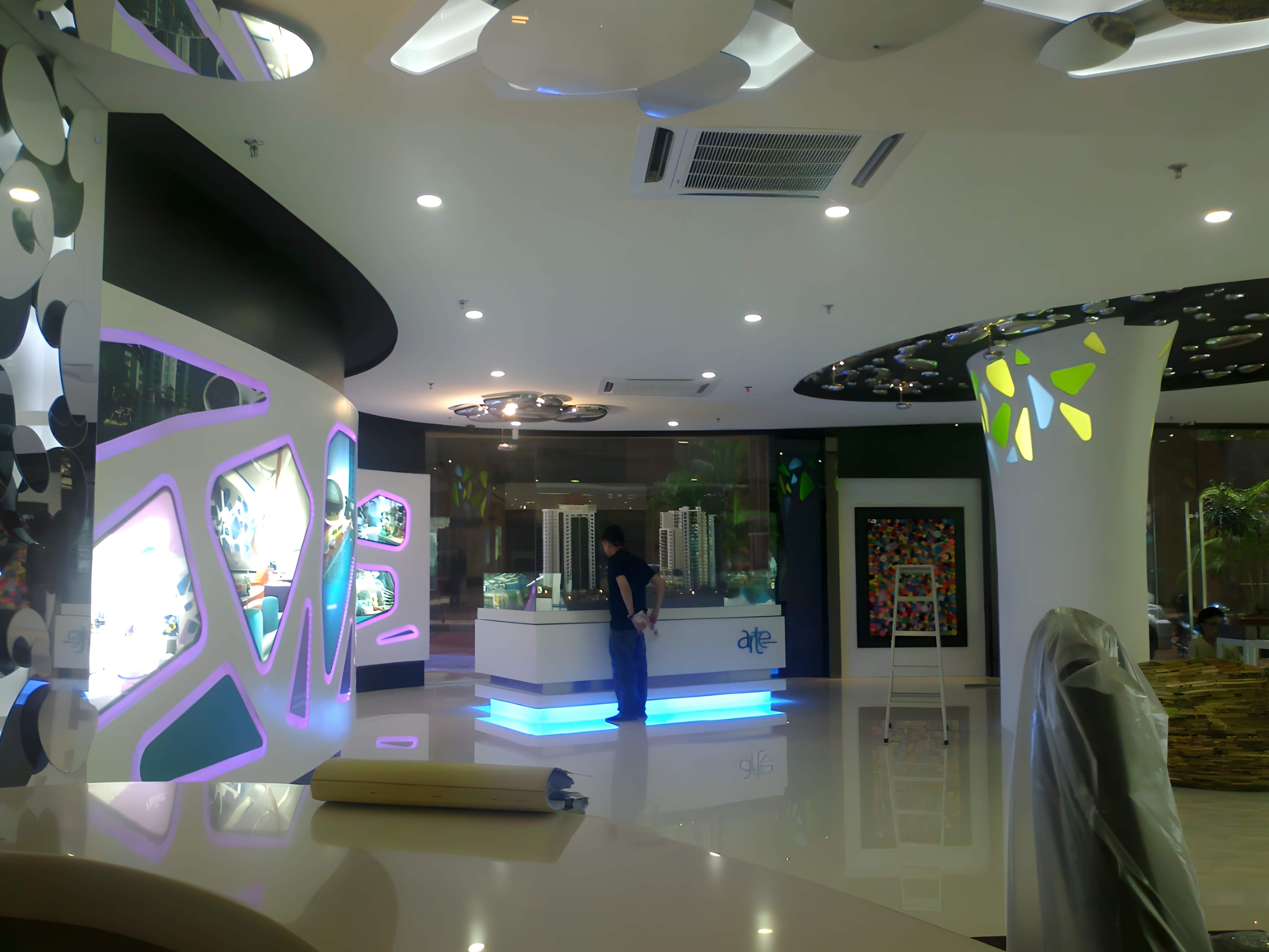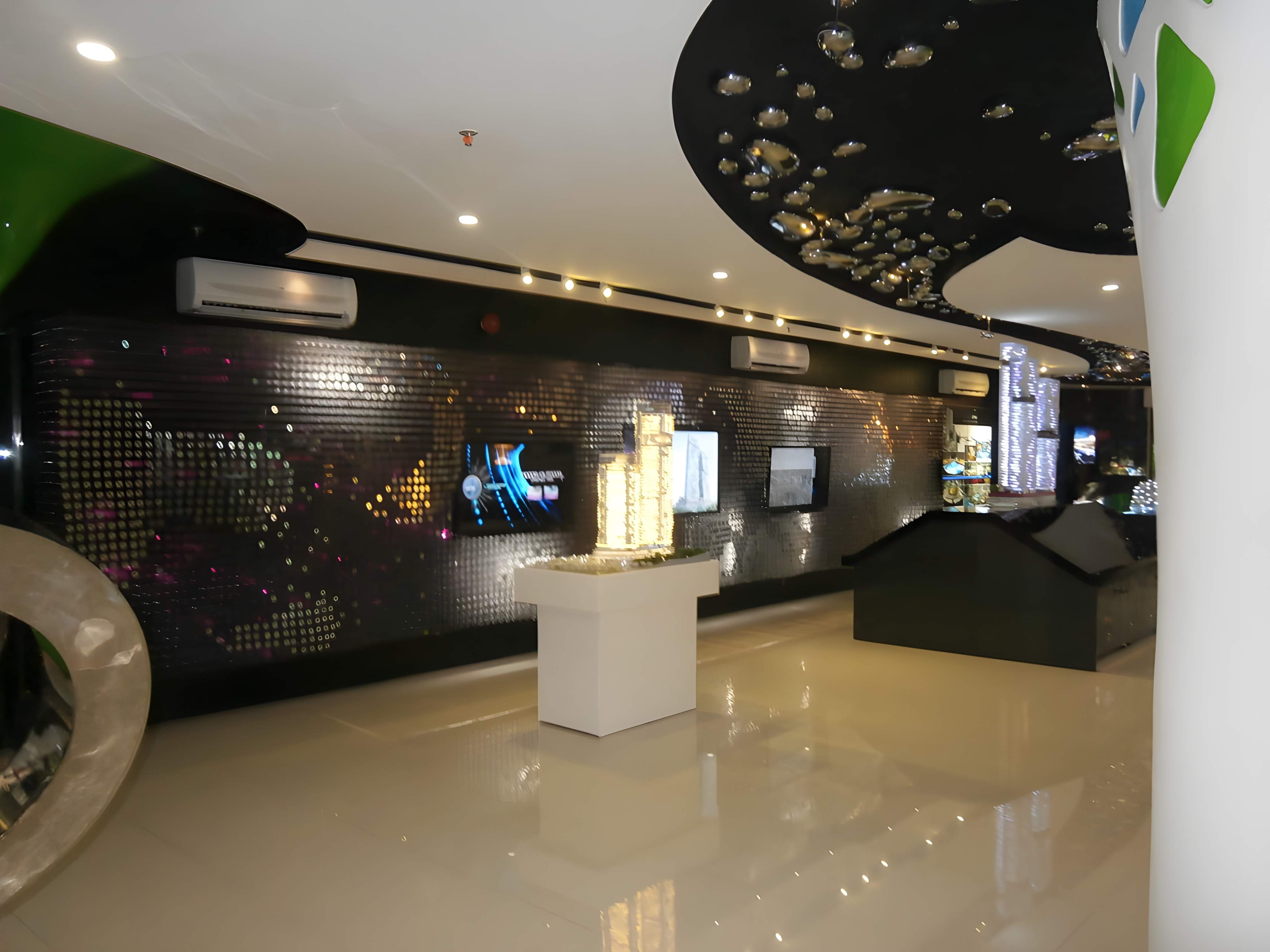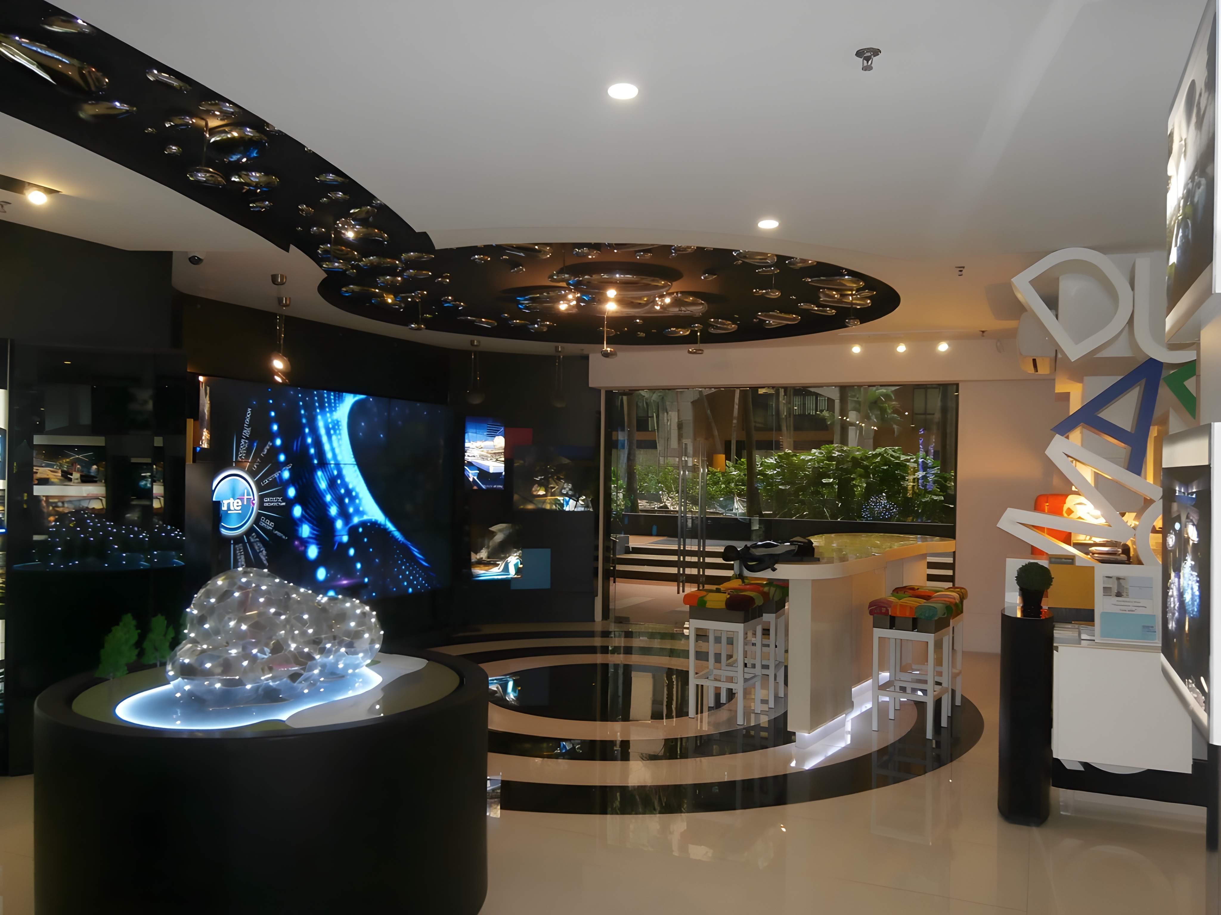 The interior design for the Nusmetro Gallery Damansara project showcases a sleek, dramatic, and high-contrast aesthetic that is typical of a luxury property or sales gallery, blending strong architectural lines with bold materials. The design relies heavily on a monochromatic palette dominated by polished black and reflective white surfaces, immediately establishing an atmosphere of corporate sophistication and modern elegance. Key features include the extensive use of high-gloss black marble-look flooring and feature walls, often contrasted with clean, white ceilings and accent lighting. The space employs striking geometric forms, visible in the angular lines of the reception desk, the abstract wall art, and the intricate ceiling designs, which often feature linear or recessed lighting. A subtle introduction of warmth is achieved through the incorporation of soft-toned wooden vertical slatting or paneling in specific areas, such as the back of the reception desk, contrasting the coldness of the polished stone. The overall environment is highly polished, minimalist, and intentionally dramatic, designed to be visually impactful and convey a premium brand image.
