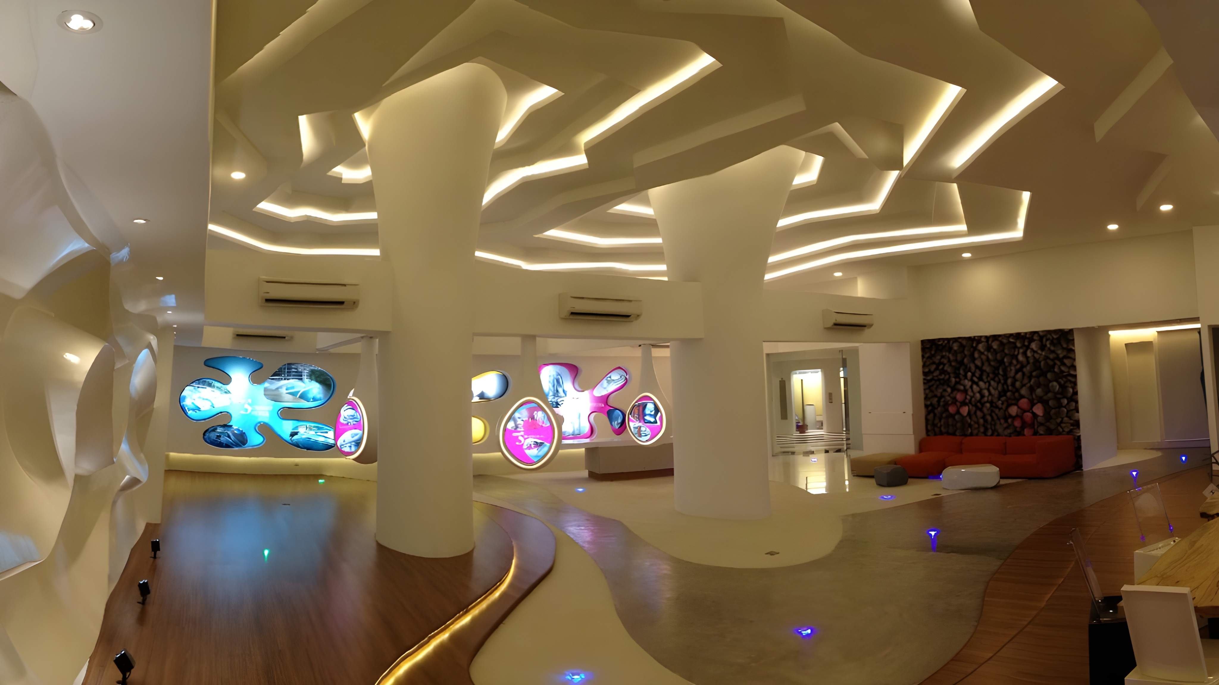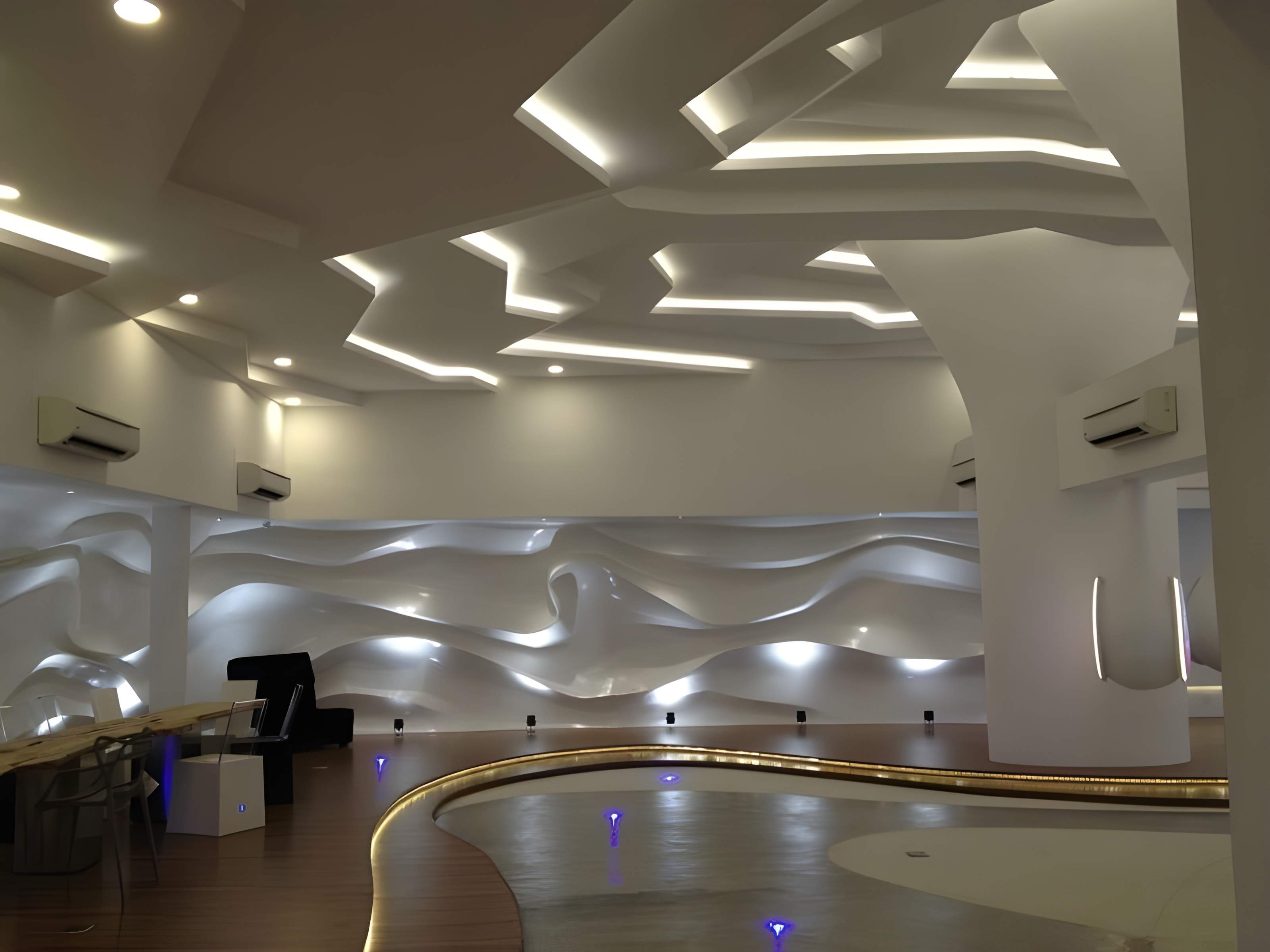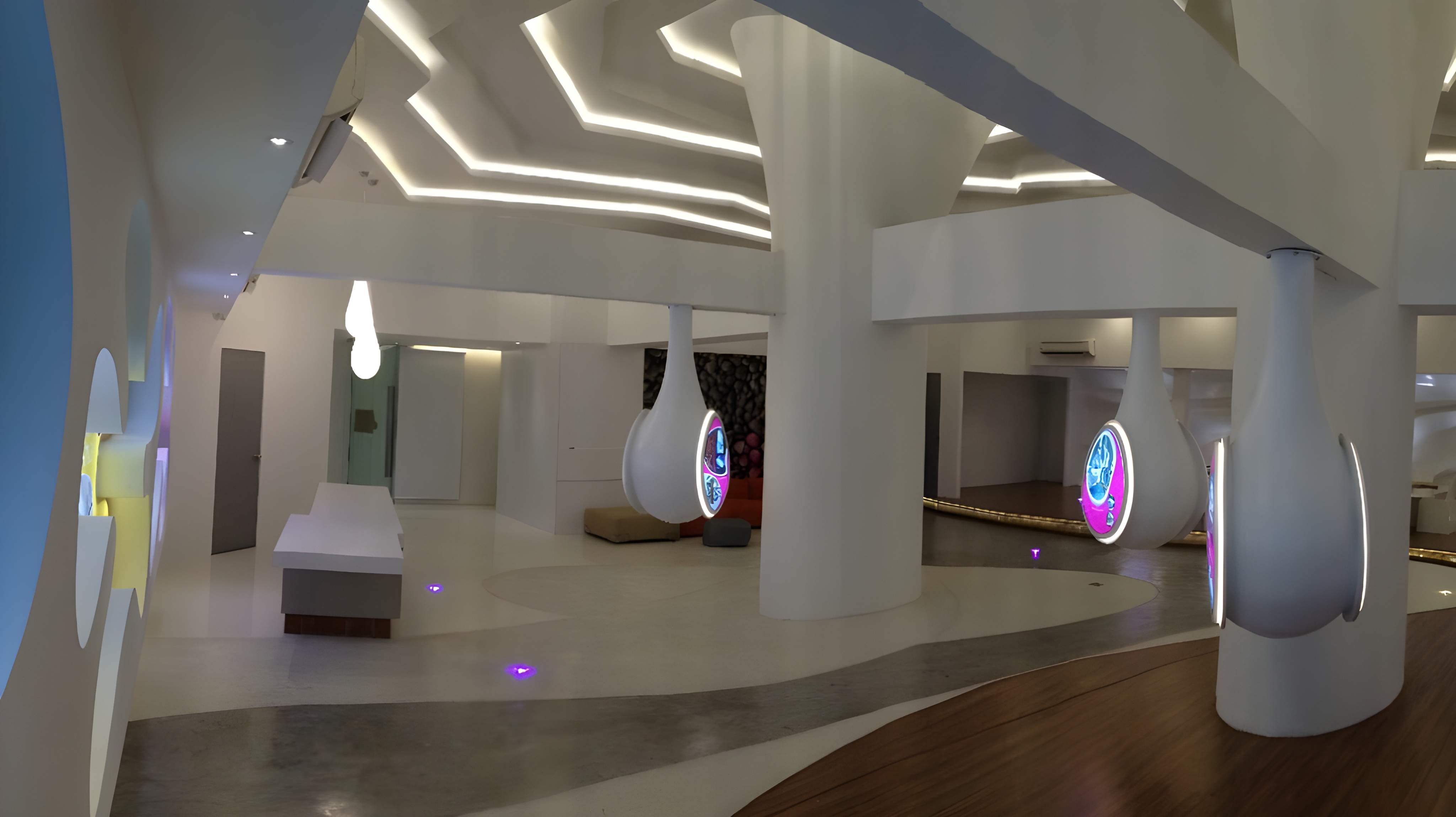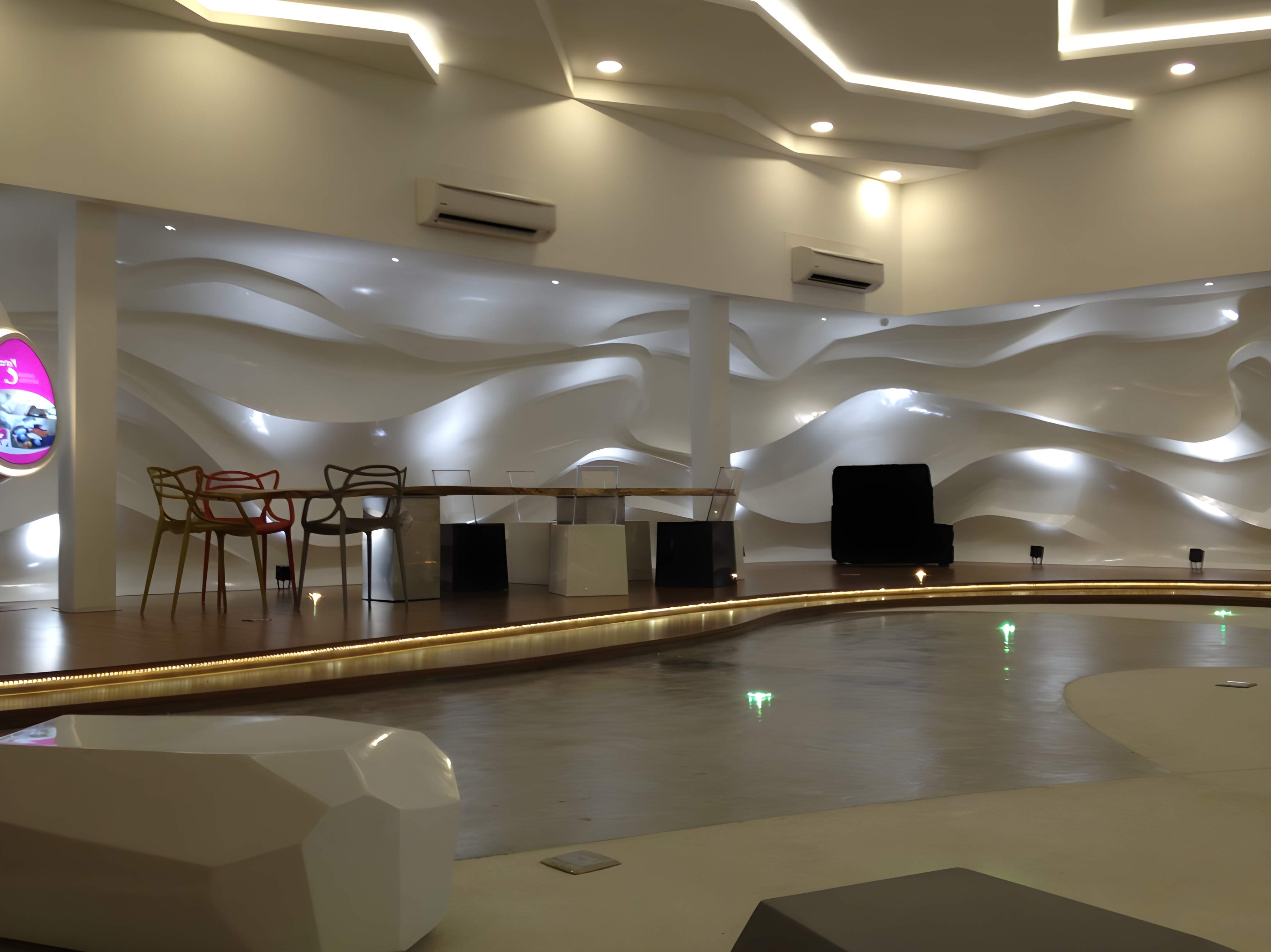 The interior design for the Nusmetro Gallery Penang project presents a sophisticated, high-end showroom aesthetic, defined by its crisp lines, rich materials, and dramatic use of contrast. The design immediately conveys luxury using a polished foundation of light-toned marble or polished tile flooring, contrasted with extensive vertical use of dark, rich wood veneers and black accents to define architectural features. A key element is the interplay of natural light and shadow, with large, open windows balanced by internal features like a striking, full-height metal mesh or slatted screening element that provides semi-transparency and texture. The reception and waiting areas are streamlined, featuring minimalist, plush seating in neutral tones and custom cabinetry with integrated lighting that highlights the quality of the finishes. Geometric forms are used throughout, particularly in the angular designs of the custom desks and presentation tables, resulting in a cohesive, polished, and executive sales gallery environment.
