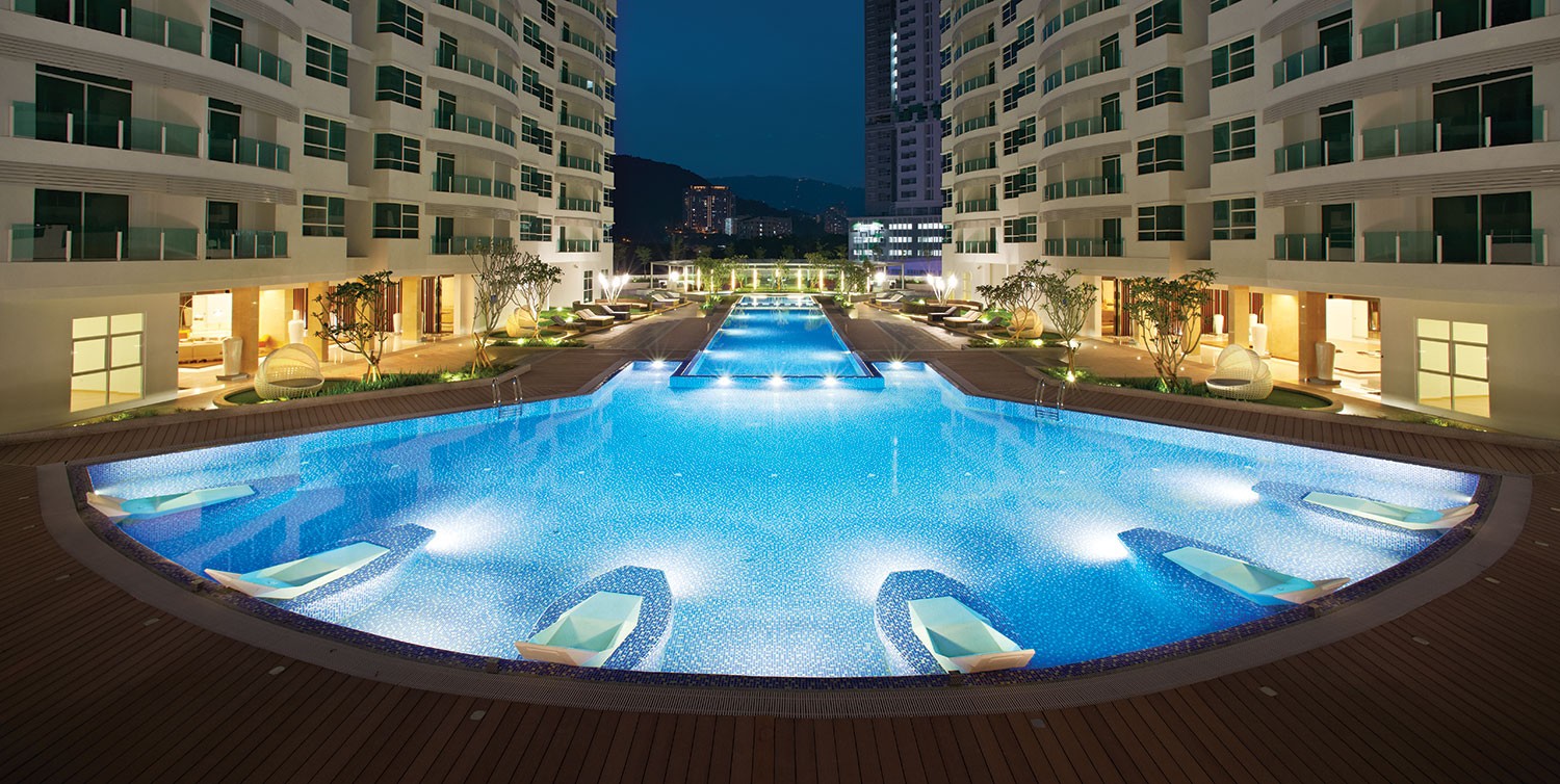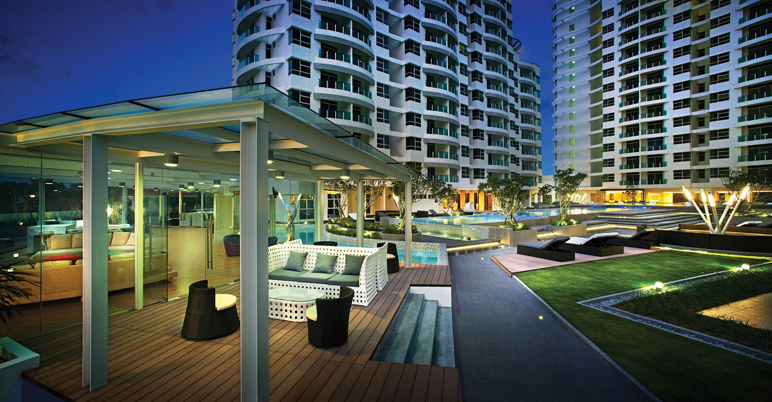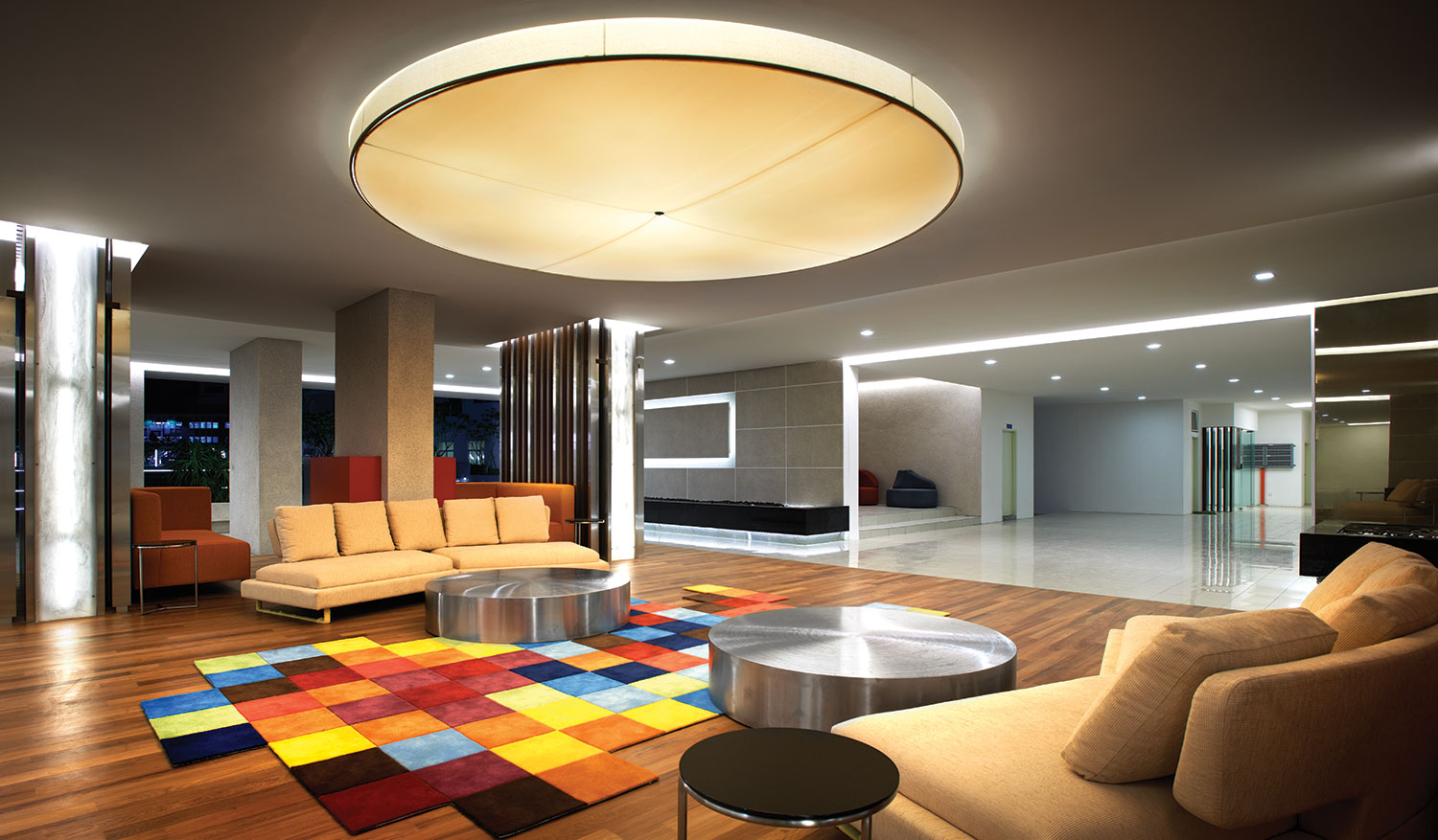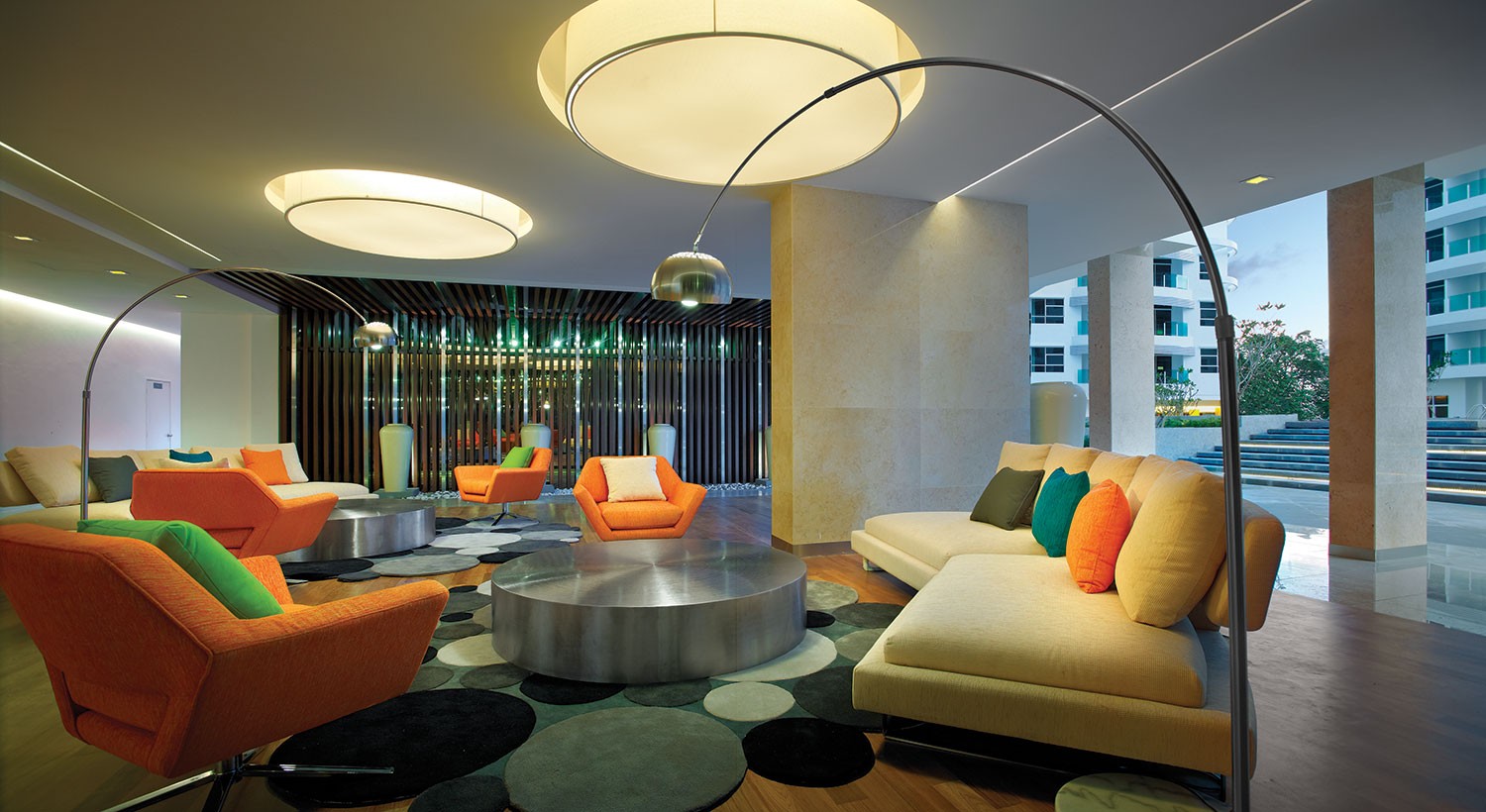 The interior and communal design for Nusmetro The Oasis embodies a vibrant, contemporary resort lifestyle, defined by a playful yet sophisticated use of color and geometry. The aesthetic features a neutral architectural base of warm beige stone columns and polished flooring, which serves as a canvas for bold, energetic accents of tangerine orange, lime green, and teal found in the plush lounge seating and graphic, multi-colored rugs. Key design elements include large, circular ceiling features and oversized arc lamps that soften the structural lines, creating a welcoming and relaxed atmosphere. The design emphasizes a seamless flow between the semi-open lobby and the outdoors, leading directly to an expansive swimming pool deck lined with timber flooring and modern pergolas. The overall effect is a refreshing, high-energy urban sanctuary that balances modern luxury with a fun, youthful spirit.