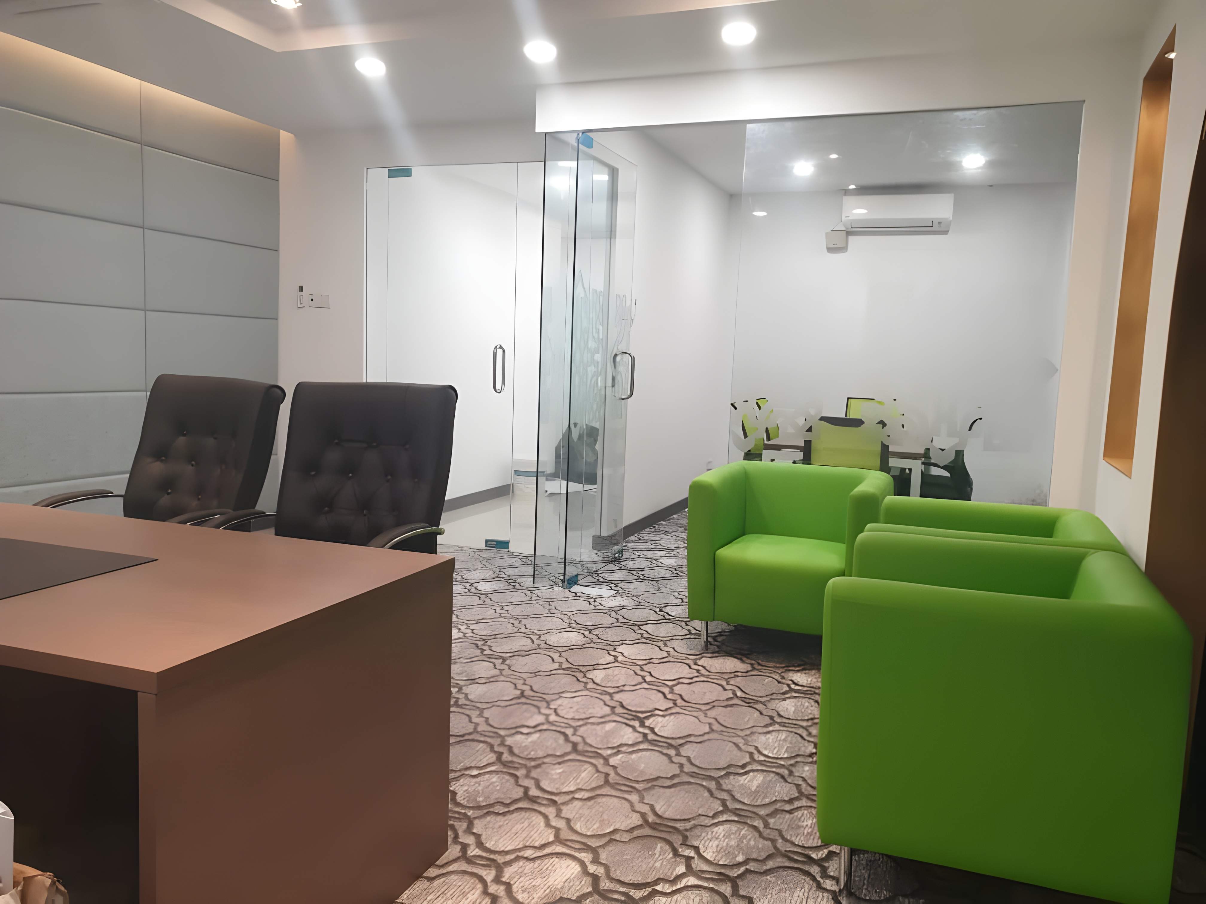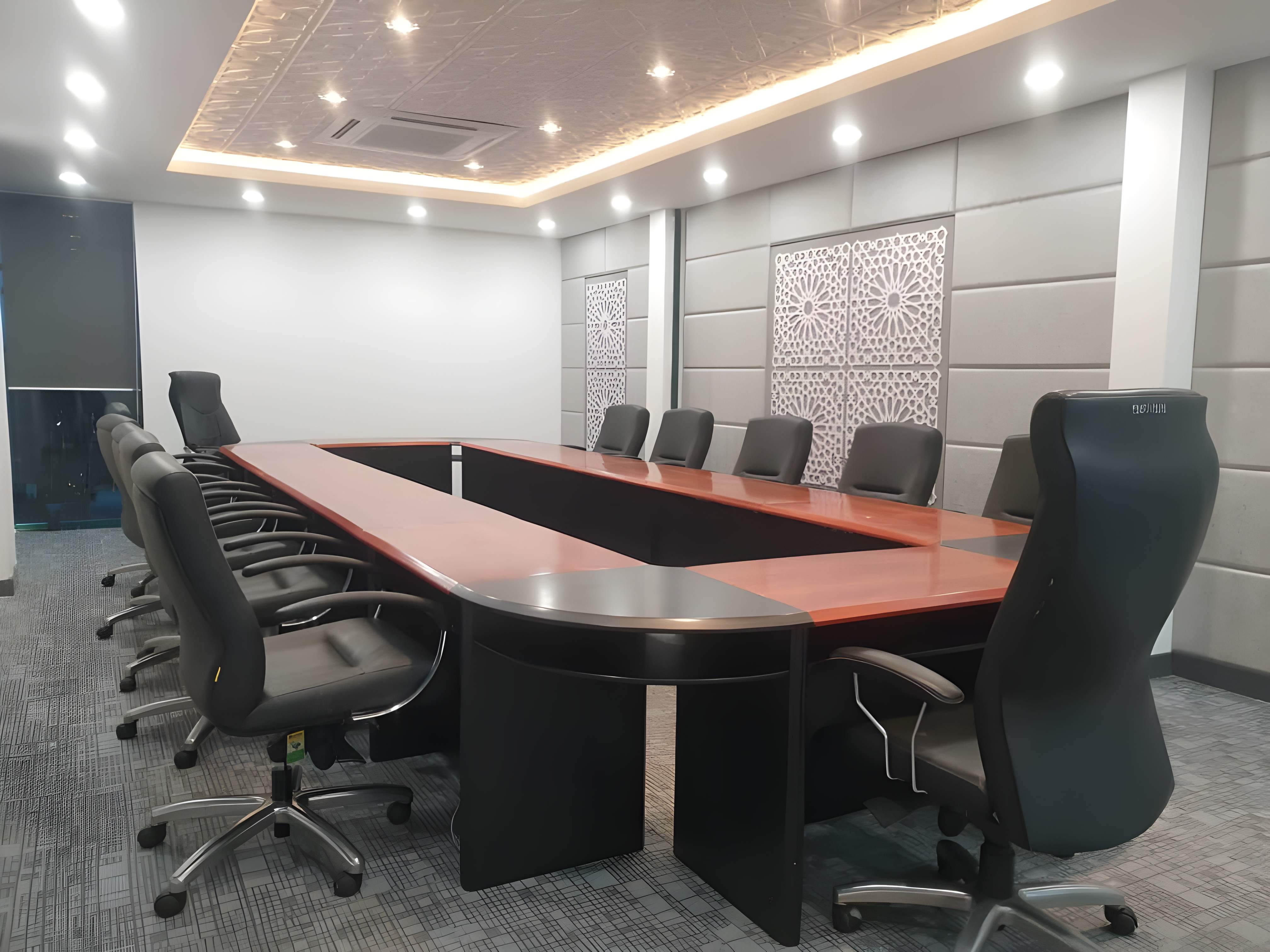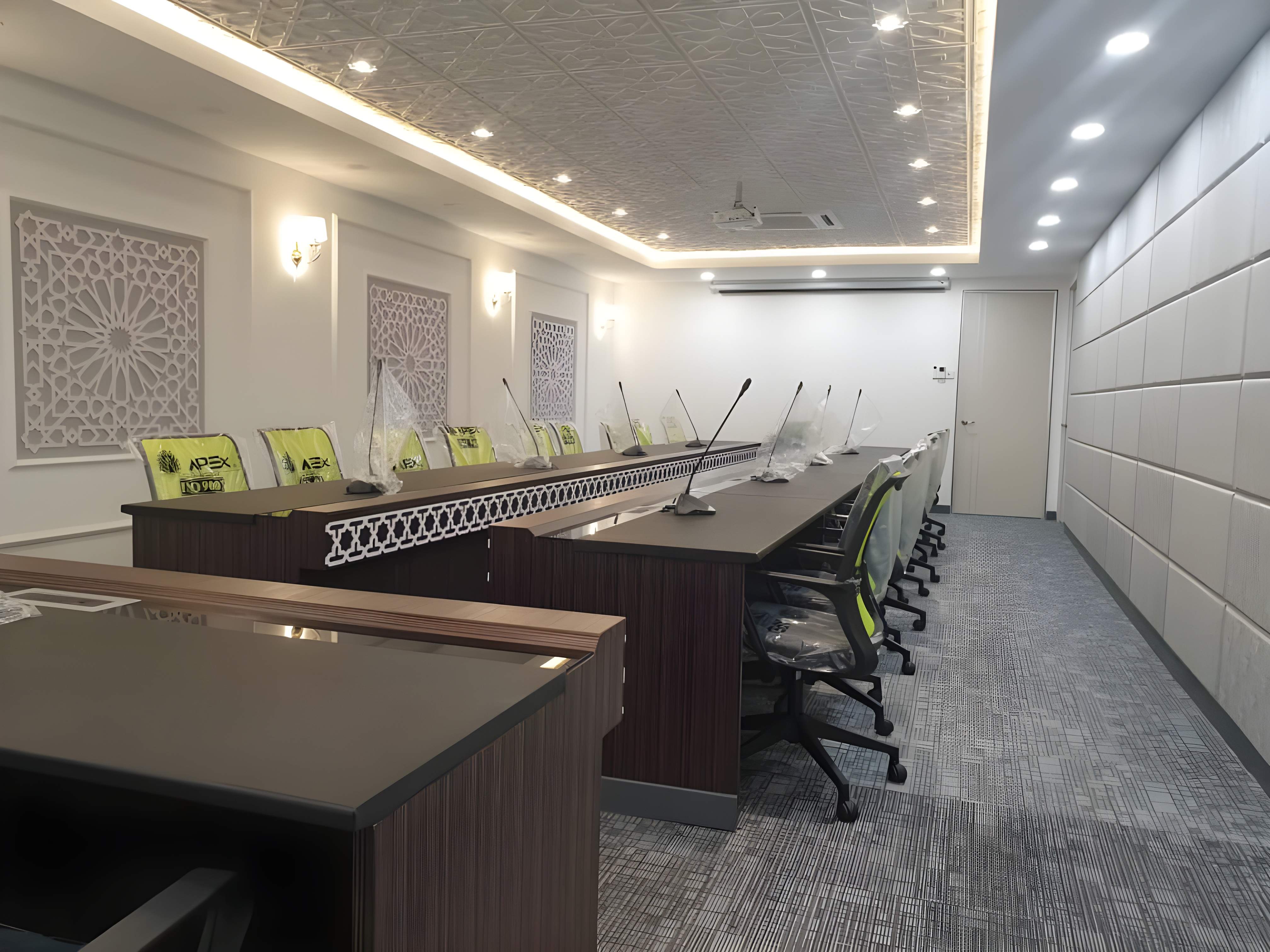 The interior design for the Perbadanan Bandar Baru Tunjung (PBBT) office creates a formal, structured, and distinguished corporate environment suitable for a government or corporate body. The aesthetic is defined by a traditional yet modern approach, utilizing a sophisticated palette of rich, dark wood finishes contrasted with luminous white and beige tones. Key design features include the extensive use of floor-to-ceiling wooden paneling and built-in cabinetry, providing a weighty, established feel, particularly in the executive and reception areas. The reception counter itself is substantial, featuring a polished white stone surface set against a backdrop of vertical wood slats, and is elegantly lit by recessed cove lighting. Conference rooms maintain this formality, featuring long wooden tables and executive chairs, with walls and ceilings clad in a blend of patterned fabric, wood, and clean white gypsum board to enhance acoustics and visual texture. Throughout the office, large-format cream or light-toned marble-look flooring is used to maintain a bright, high-quality, and professional atmosphere.