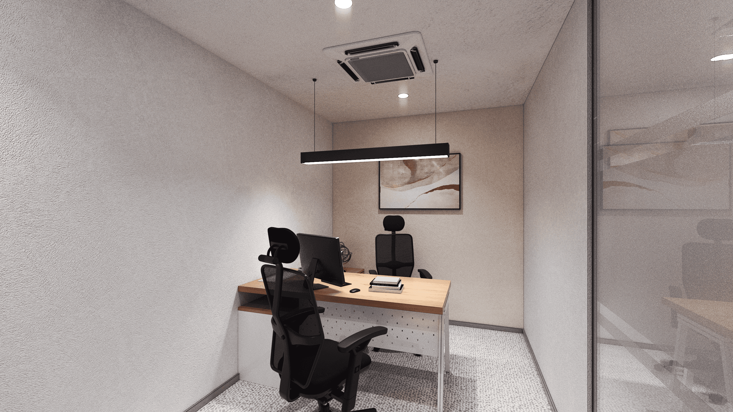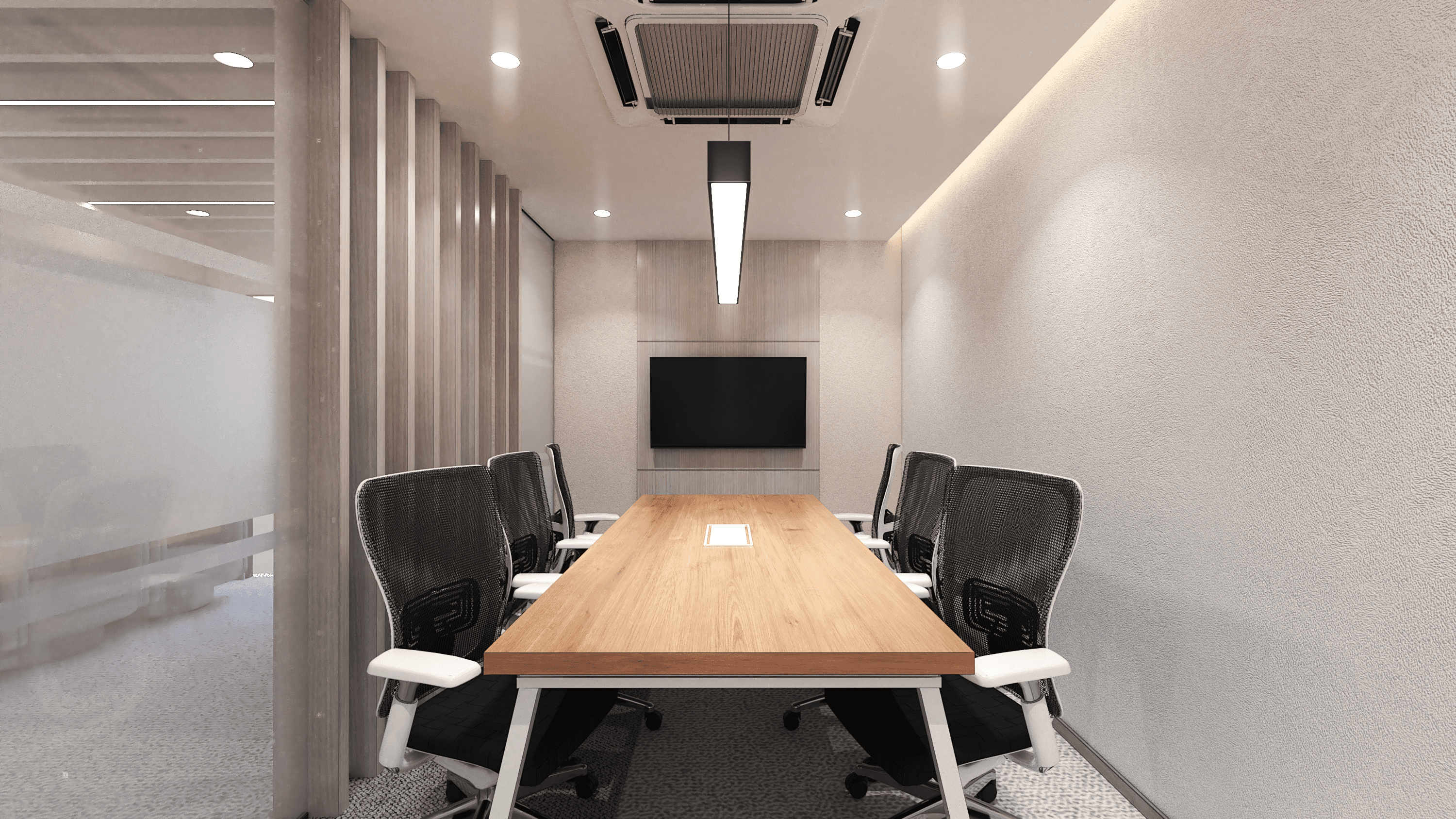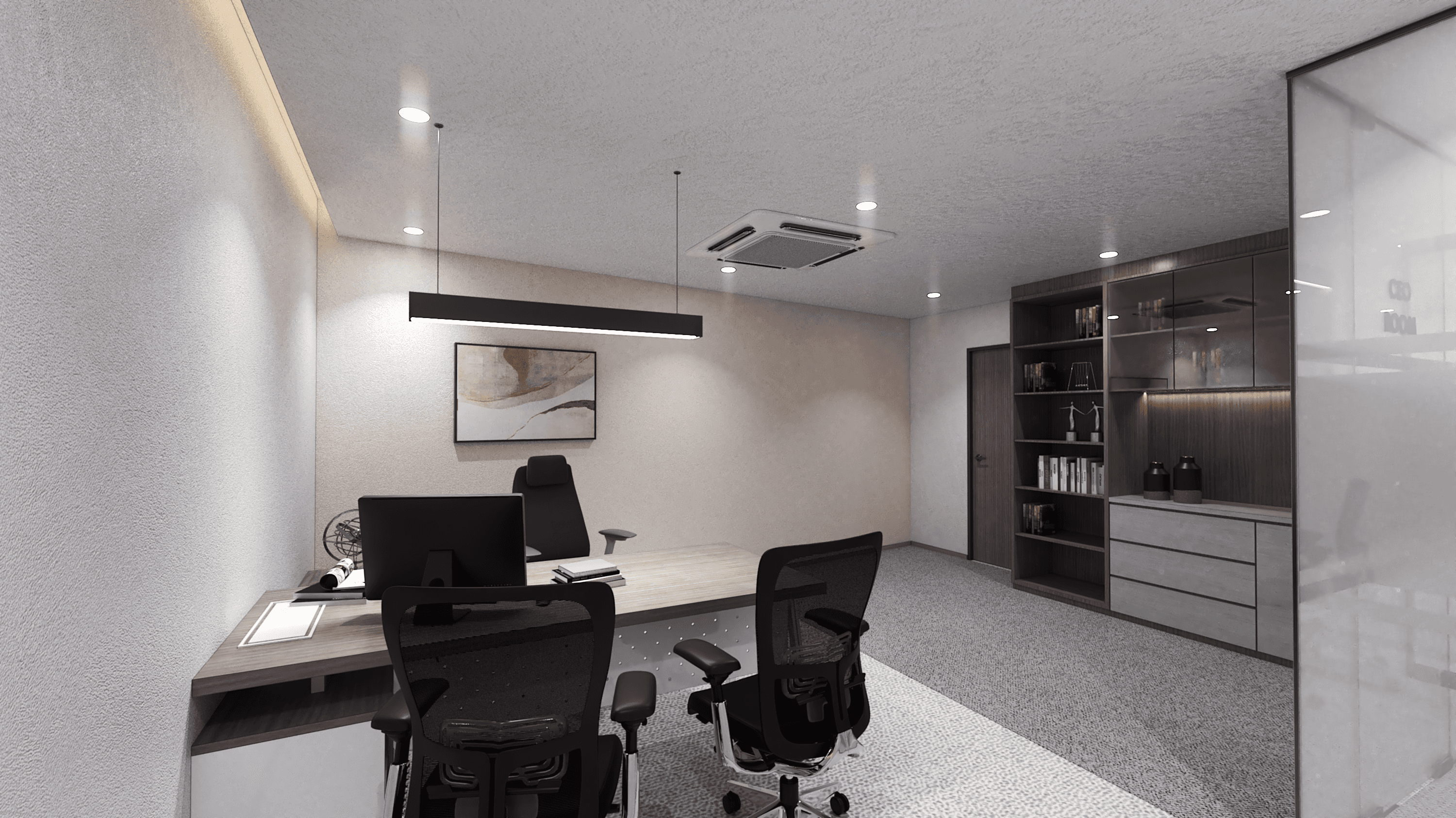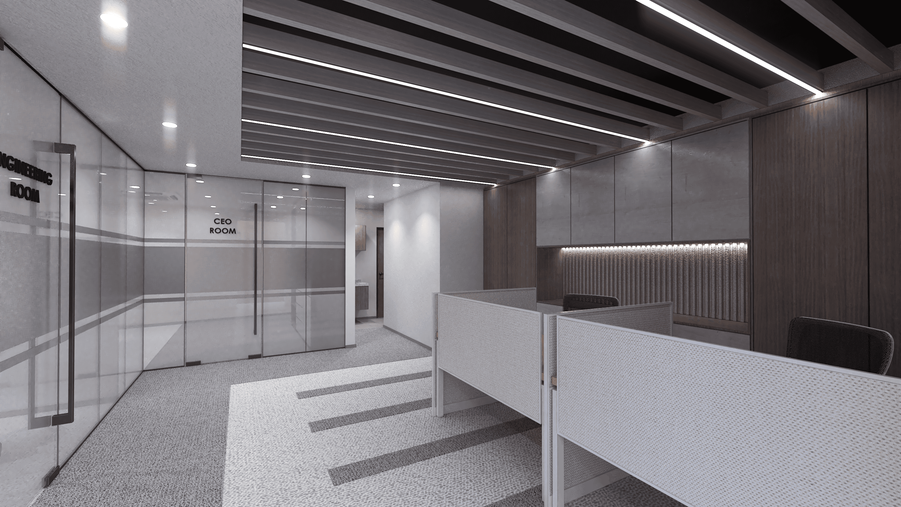 The proposed design for the Office Perimuda Makmur establishes a professional and executive workspace characterized by a refined blend of warm timber textures and clean, minimalist surfaces. The aesthetic is centered on quiet professionalism, utilizing a controlled palette of soft neutral beige/white textured walls, grey patterned carpeting, and rich, medium-toned wood accents. Open areas and corridors are defined by sleek, horizontal ceiling slats with integrated linear lighting, creating a sense of forward movement and clean design. The design prioritizes privacy and transparency, utilizing frosted or clear glass partitions framed by subtle black lines to define areas like the "CEO Room" and "Engineering Room," allowing light diffusion while maintaining separation. Executive offices and meeting rooms feature custom wooden built-in storage and feature walls, often accented by vertical timber slatting to introduce texture. The furniture, including the main conference table, consists of light wooden surfaces paired with professional black and white ergonomic chairs, ensuring a focused, comfortable, and highly polished corporate setting.