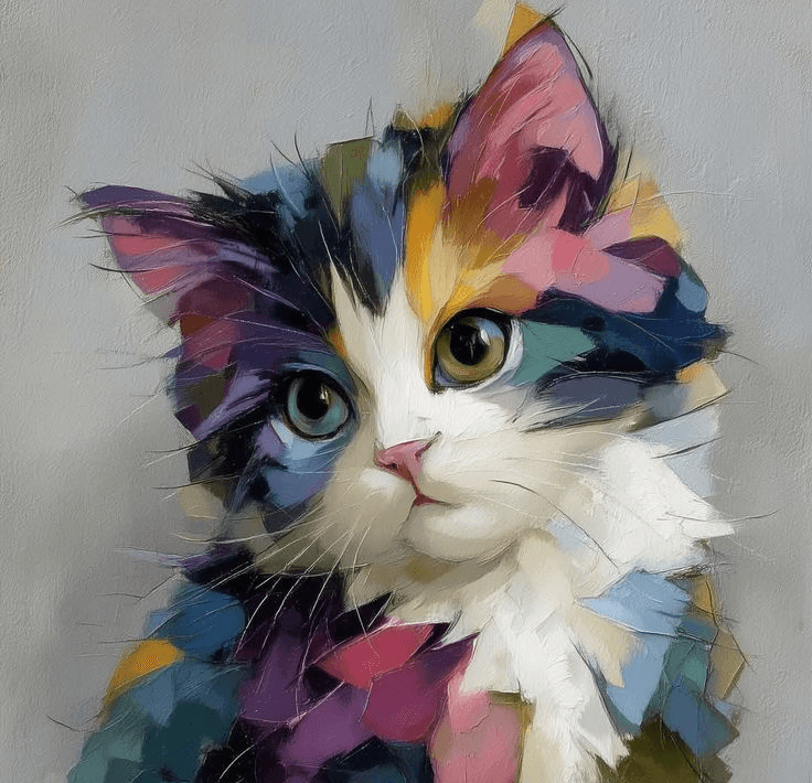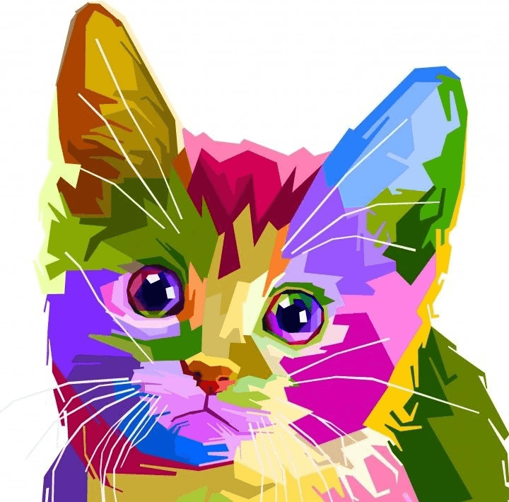 The graphic design series for Pop Art Cats explores the expressive potential of animal portraiture through a vibrant, multi-stylistic lens. The collection moves away from traditional realism, instead utilizing a bold, saturated color palette of rainbow hues—pinks, blues, greens, and oranges—to define the form and texture of the subjects. The visual approaches vary significantly, ranging from sharp, geometric vector art that constructs the feline form out of angular, flat-colored facets, to softer, painterly interpretations that mimic watercolor or oil techniques with fluid blends and visible brushstrokes. Despite the abstraction, the designs maintain a strong focus on the detailed, expressive eyes of the cats, which serve as the emotional anchor amidst the explosion of color, resulting in a playful and modern artistic statement.