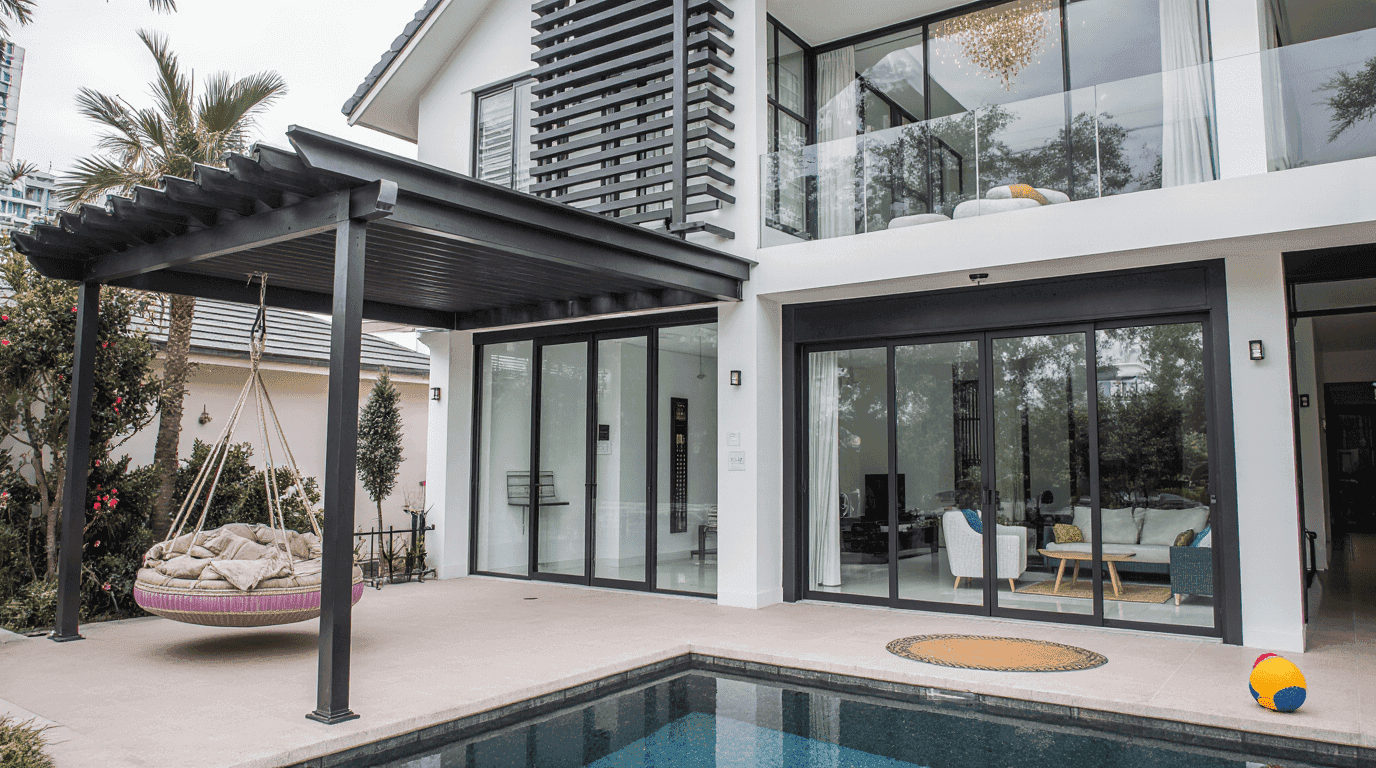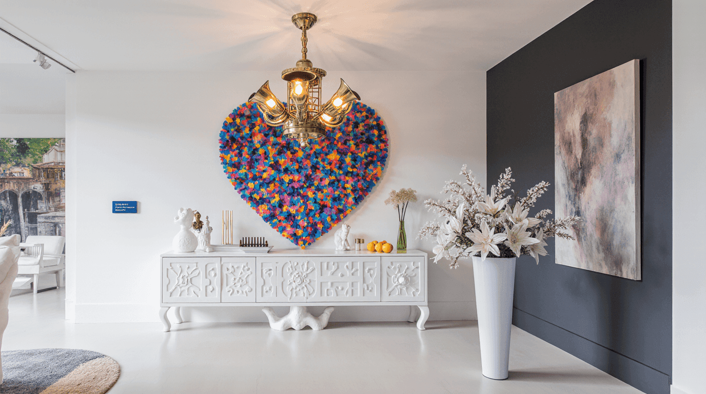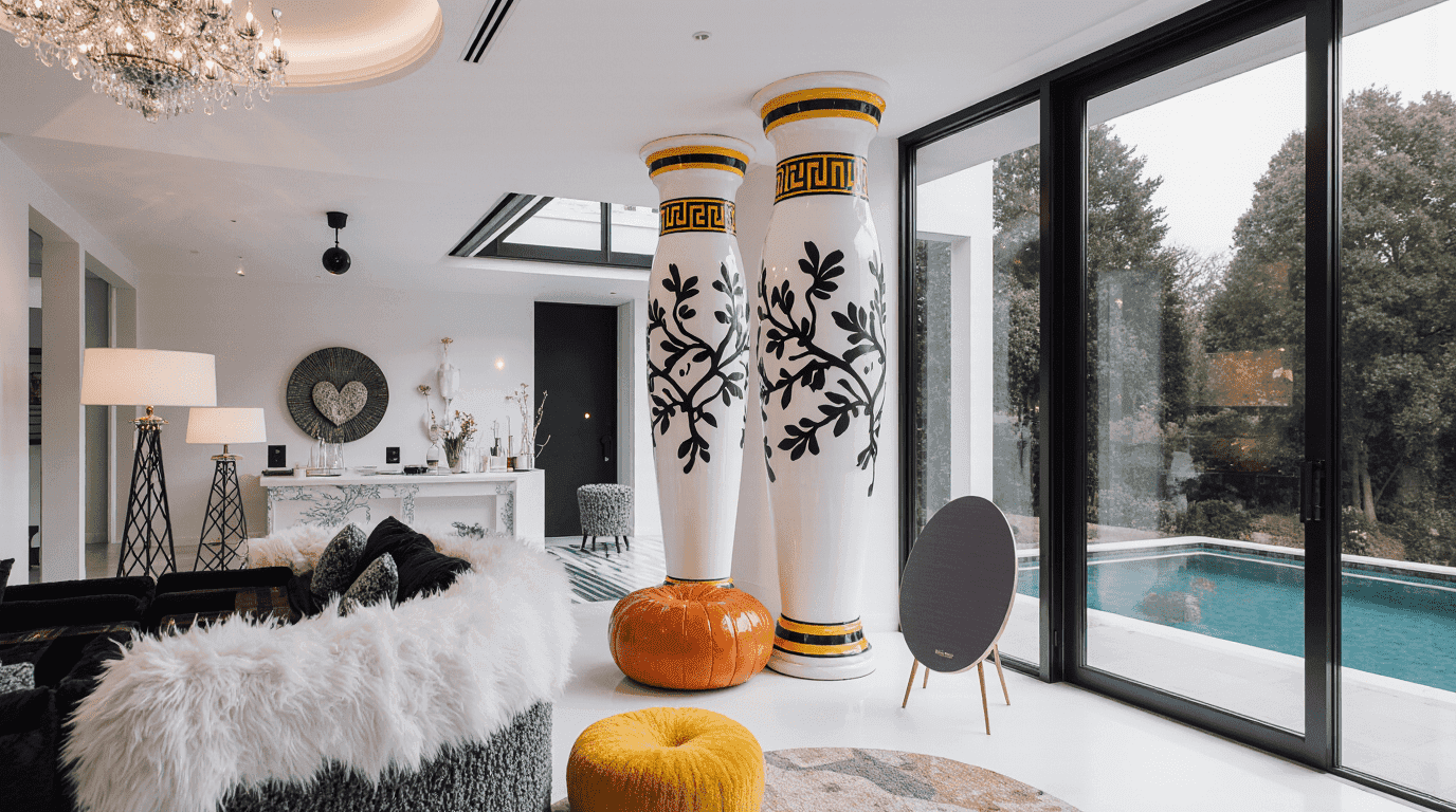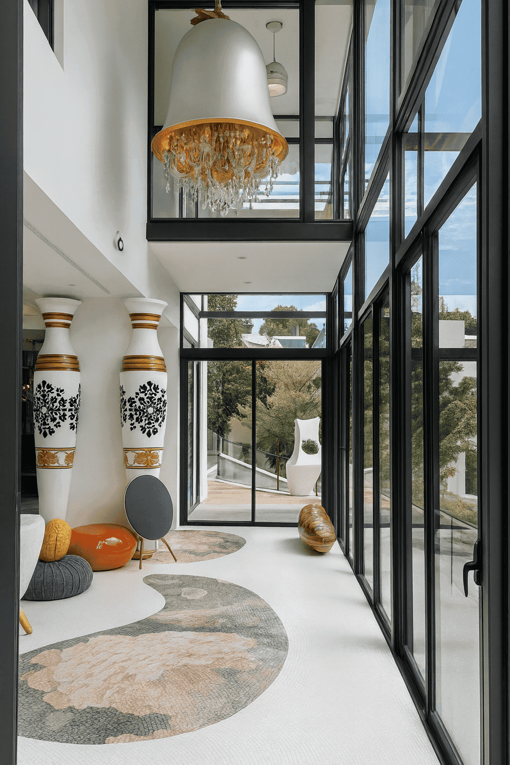 The interior design for the Private Residential Bangsar project presents a stunning fusion of eclectic art-house aesthetics and modern luxury living, characterized by bold, sculptural elements and a seamless indoor-outdoor connection. The space is anchored by a dramatic double-volume living area featuring immense, custom-designed black and white ceramic totem pillars with gold Greek key detailing, which act as art pieces rather than just structural supports. A whimsical, oversized bell-shaped pendant light with a crystal interior hangs above, adding a surrealist touch. The furniture is eclectic and curated, mixing modern textures like white fur sofas with pop-art inspired pieces like bright orange ottomans and a heart-shaped, multi-colored wall art installation that serves as a vibrant focal point. Floor-to-ceiling black-framed glass doors flood the white terrazzo-floored space with natural light and provide a direct view of the private lap pool and lush garden, creating a sophisticated, gallery-like residence that feels open, airy, and deeply personal.