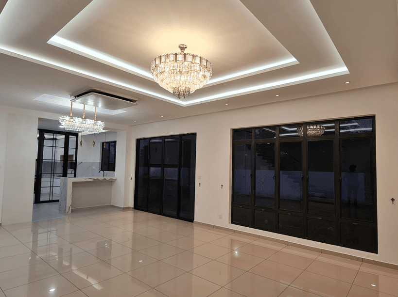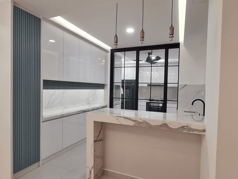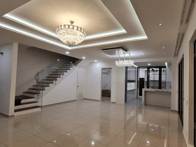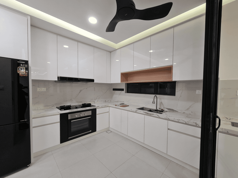 The interior design for the Private Residential Castenia Setia Alam project embodies a modern, warm, and highly functional family aesthetic, prioritizing comfort, integrated storage, and a light-filled atmosphere. The design is characterized by a harmonious blend of warm, light wood textures used extensively for custom cabinetry, paneling, and floating shelves, set against a backdrop of clean white walls and light grey flooring. A key feature is the strategic creation of separate yet visually connected zones, utilizing subtle transitions in floor material and open shelving units to maintain an airy feel. The living area is centered around a streamlined entertainment unit flanked by vertical wood slatting, while the kitchen/dining area features white, minimalist cabinetry contrasted by wood accents and a sleek island. The overall design achieves a feeling of contemporary, uncluttered living, perfectly balancing minimalist sensibility with comfortable, family-focused functionality.