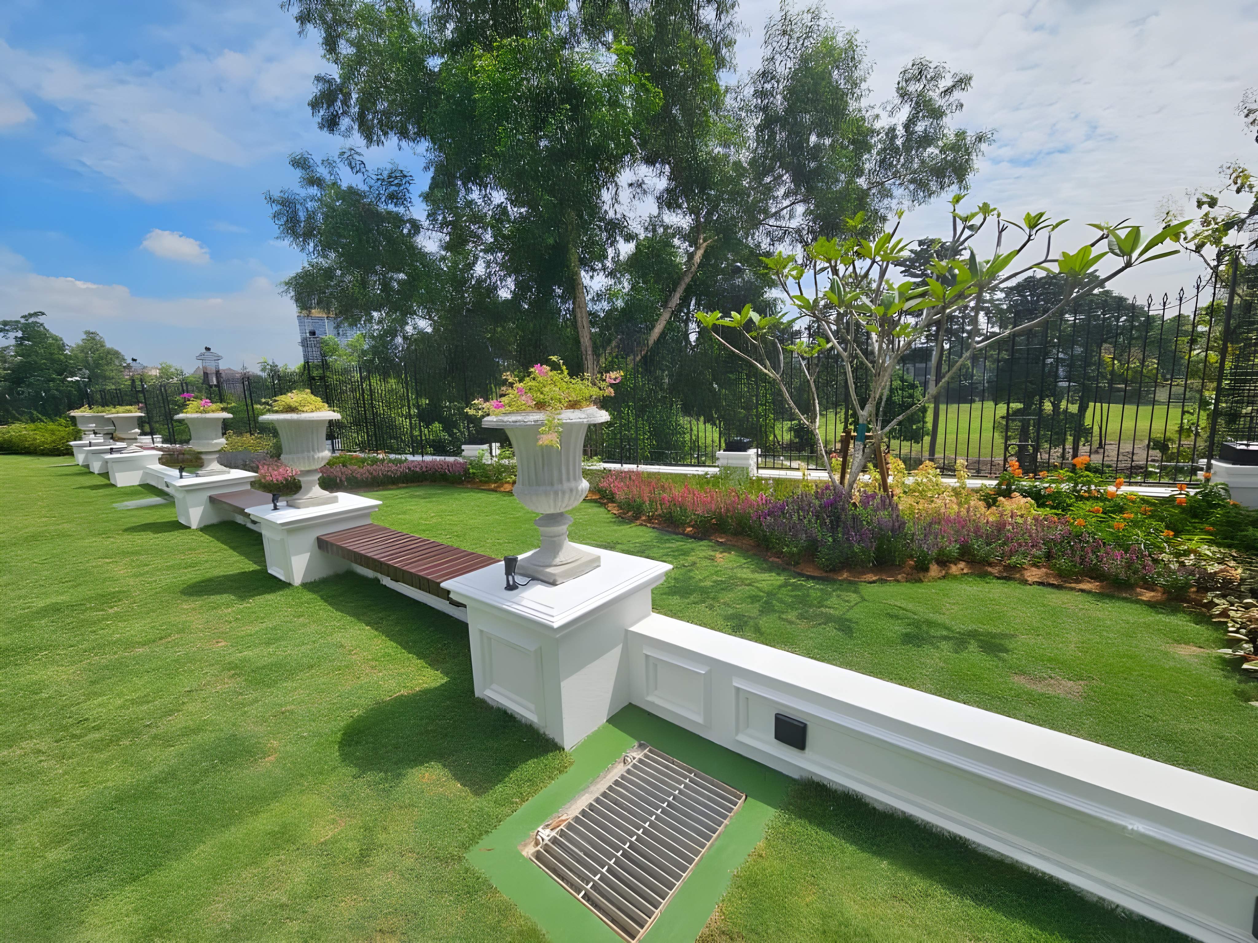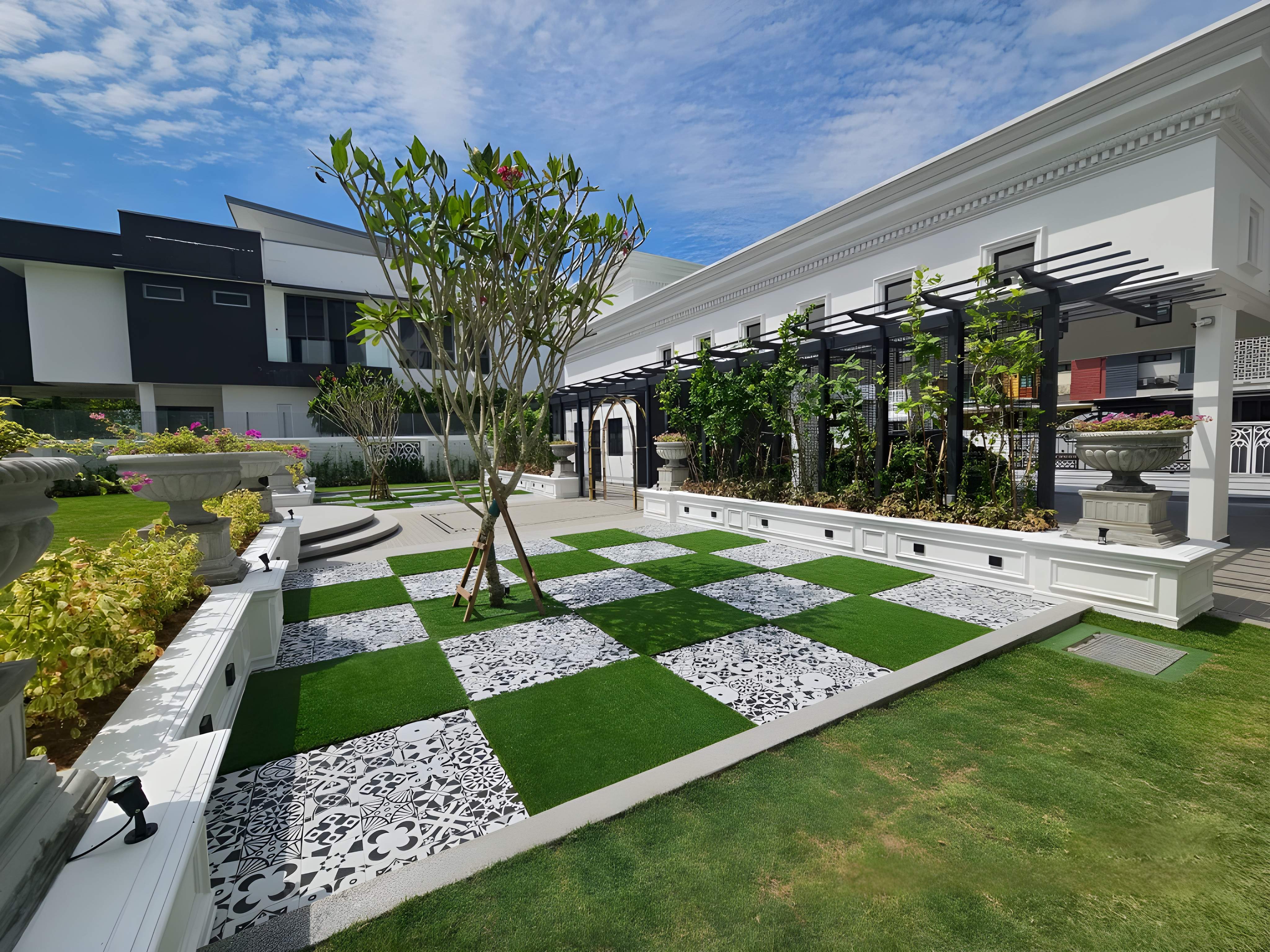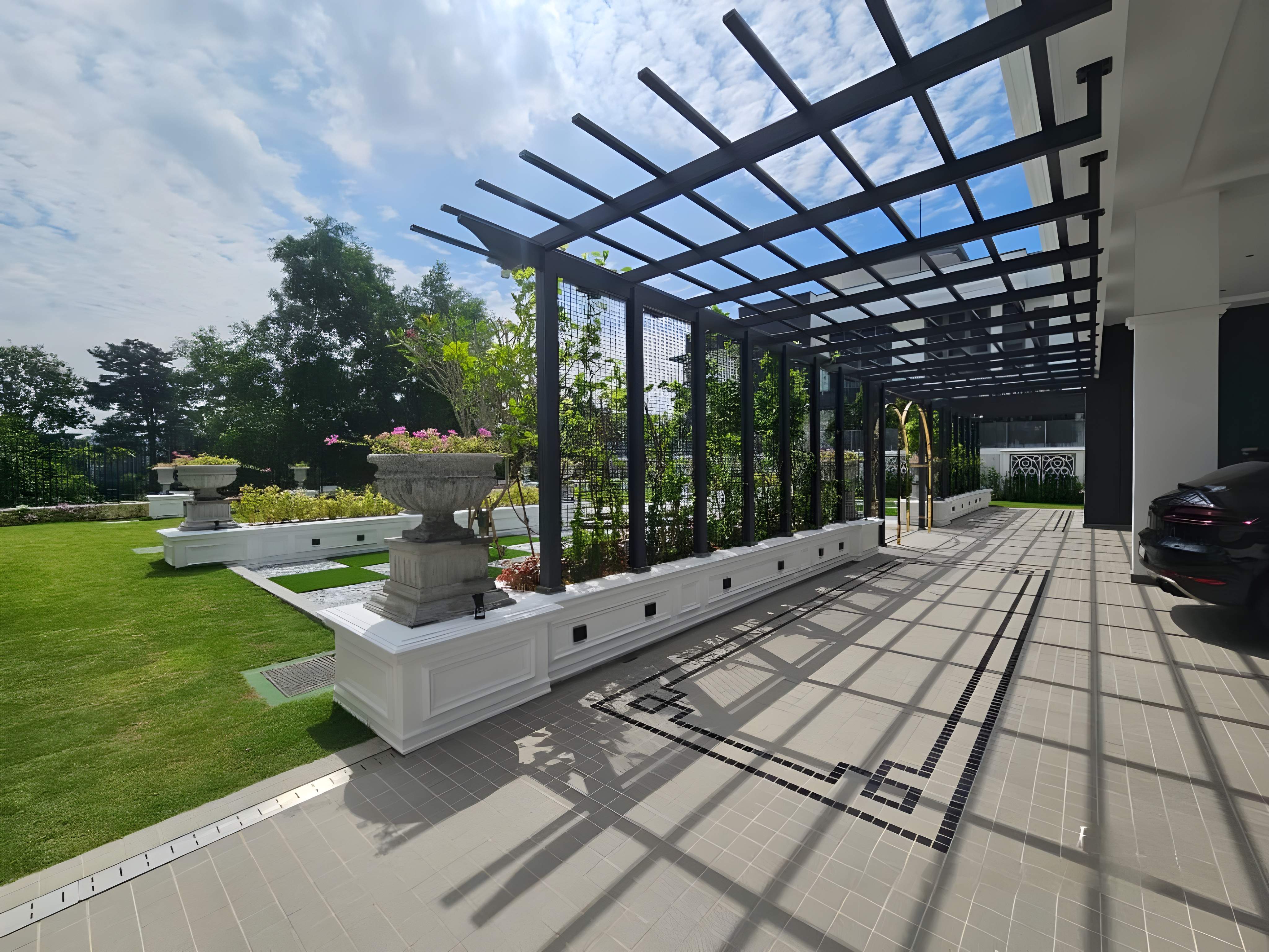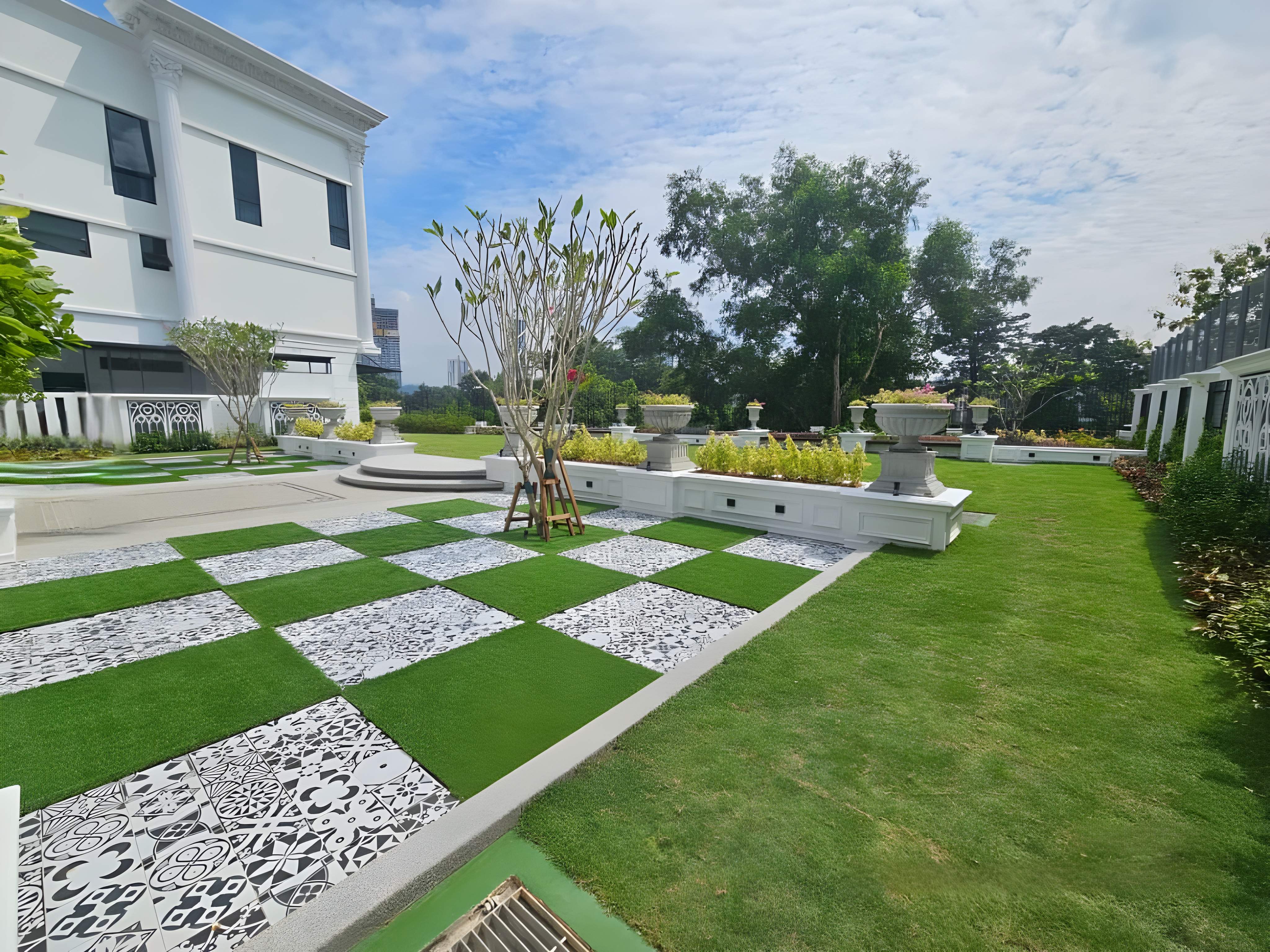 The landscape design for the Private Residence Tropicana Indah project establishes a lush, resort-style outdoor environment that seamlessly integrates modern architectural lines with dense tropical planting. The design is characterized by extensive use of water features, most notably a sleek swimming pool bordered by clean, minimalist hardscaping, often utilizing light-toned stone or tiles. Vertical elements are key, featuring tall, structured stone or textured walls and striking timber vertical screens that provide privacy and a backdrop for the planting. The planting scheme is dense and tropical, incorporating mature trees, ferns, and various undergrowth to create a feeling of immersion in nature and privacy. Functional areas include shaded wooden decks and modern seating areas, beautifully illuminated by integrated lighting in the hardscaping and pool area, ensuring the garden is usable and dramatic both day and night, successfully delivering a private, luxurious, and tranquil urban retreat.