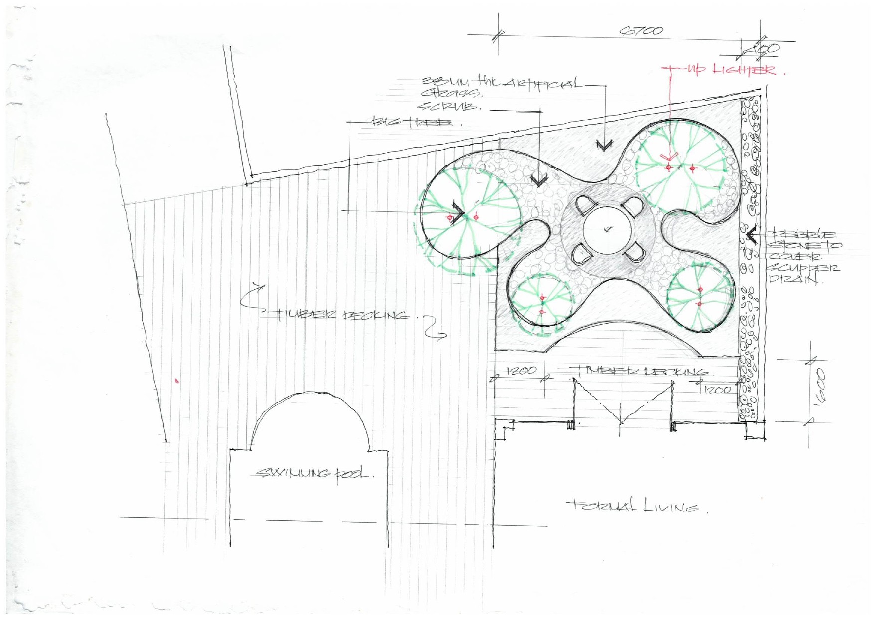 The landscape design sketches for the Private Residential Tropicana Indah project illustrate a sophisticated, resort-inspired garden characterized by a seamless integration of minimalist architecture and lush tropical density. The conceptual focus is on the luxurious interplay of expansive water features, including a clean-lined swimming pool, with structured hardscaping elements such as large, planar stone steps and polished paving. Key design elements feature high wooden vertical screens and textured retaining walls, which function both to define space and provide privacy, creating a strong architectural backbone. The planting scheme is deliberately layered and abundant, utilizing dense, exotic foliage to frame the built elements and immerse the space in a tranquil, natural environment, with integrated ambient lighting proposed to dramatically highlight these textures and volumes for nighttime viewing.