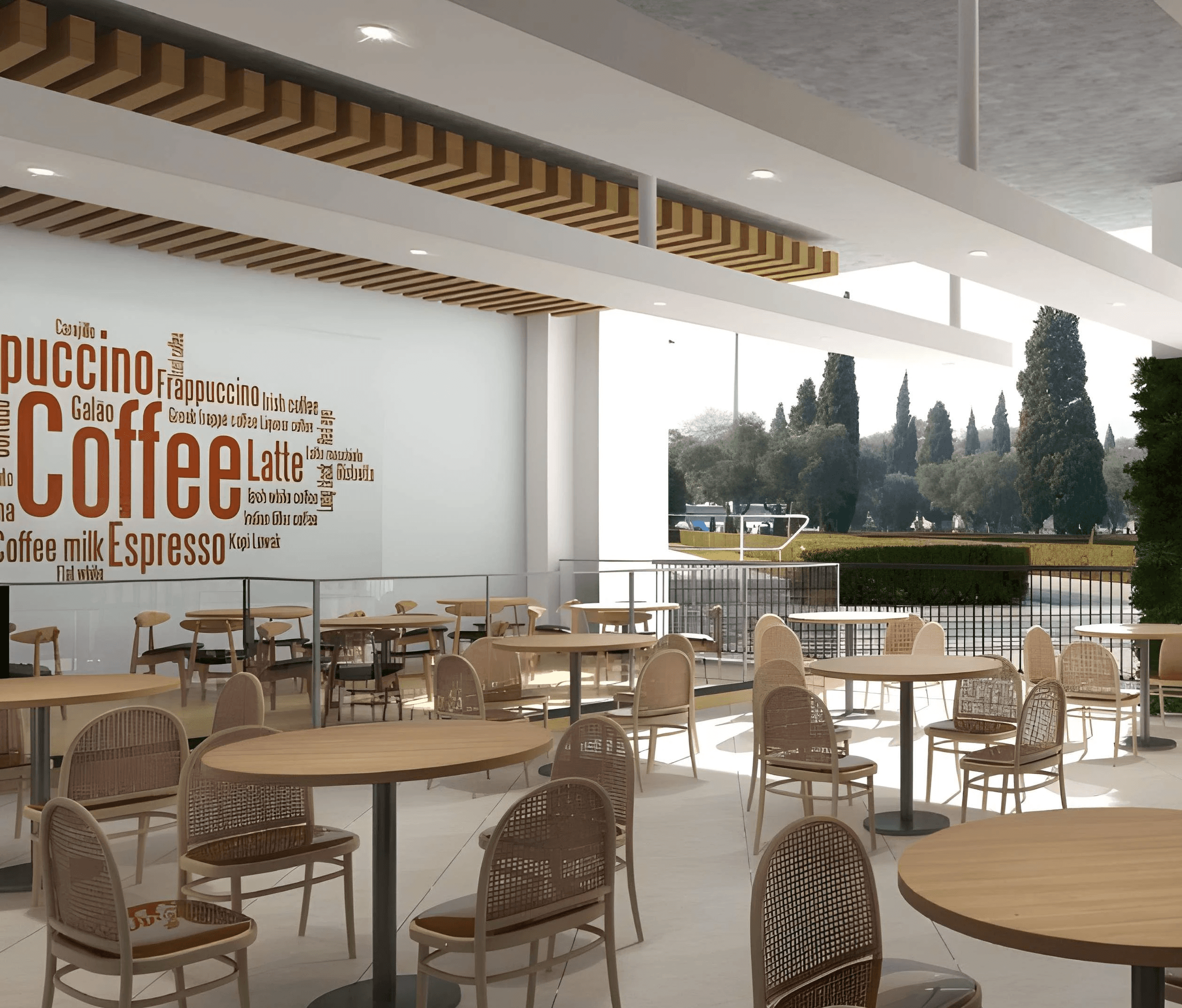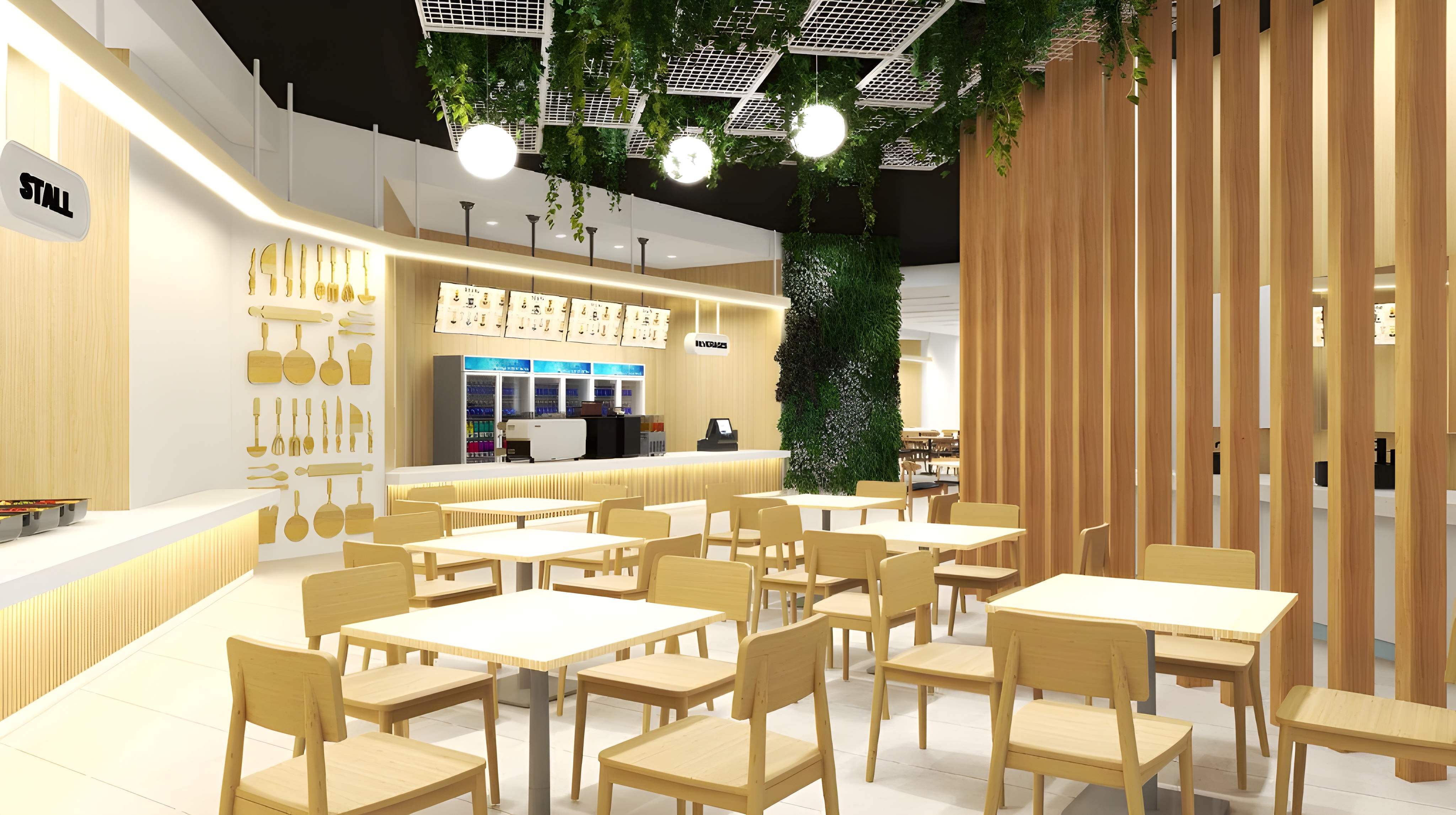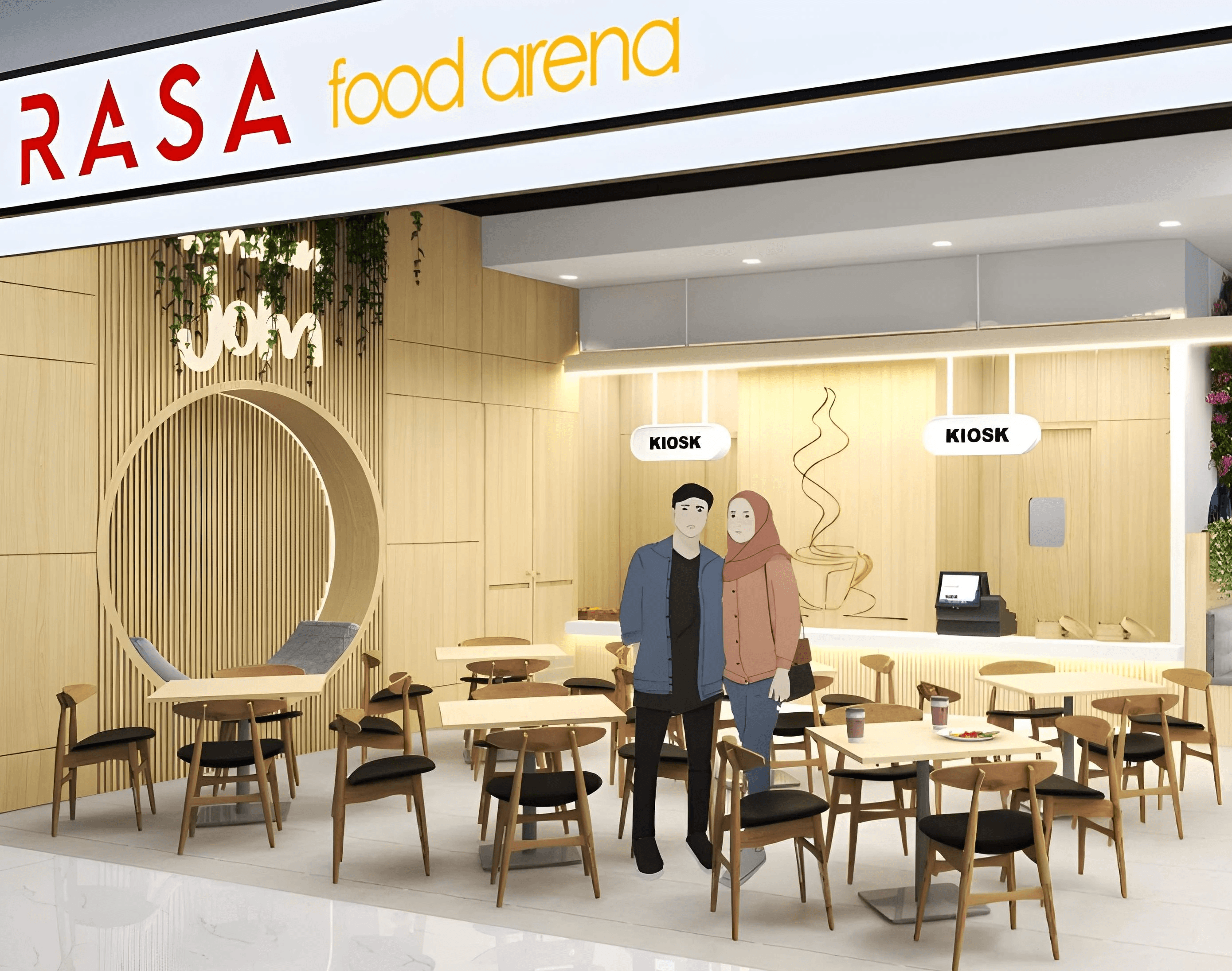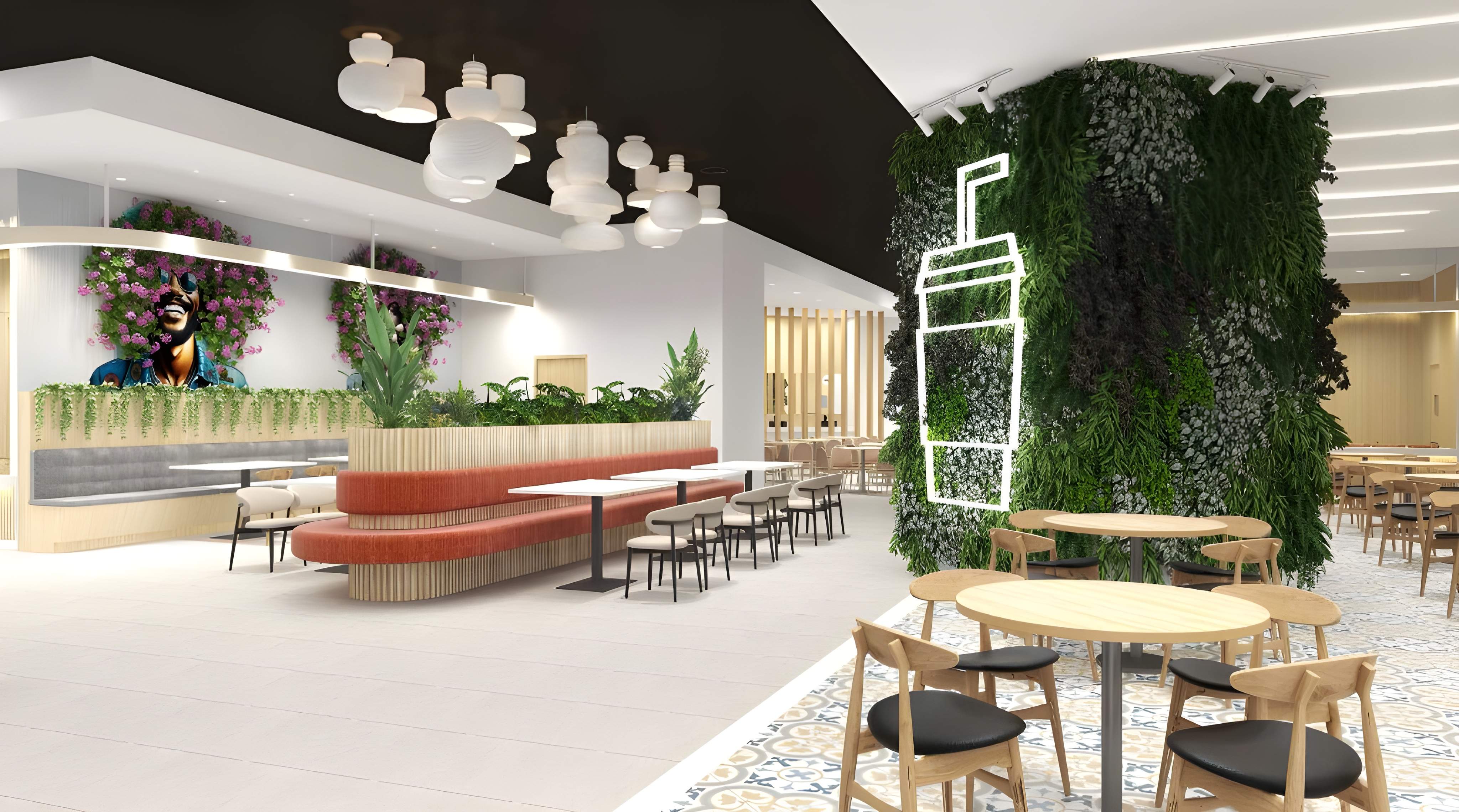 The proposed design for the Rasa Food Arena at Datum Jelatek Mall envisions a bright, modern, and inviting casual dining destination, defined by a strong emphasis on natural materials and biophilic design. The aesthetic centers on a warm, contemporary palette, dominated by extensive use of light-toned vertical timber slats and wall paneling, which instantly creates a welcoming and organic atmosphere. This warmth is sharply contrasted with bold vertical gardens and lush ceiling-mounted greenery, providing striking focal points and enhancing the sense of freshness. Seating areas are diverse and comfortable, including banquette seating upholstered in a vibrant terracotta or reddish fabric, paired with minimalist tables and a variety of wooden chair designs, sometimes featuring woven cane detailing for a touch of classic café charm. Distinctive design elements include a highly visible coffee kiosk area featuring a stylized coffee-word cloud graphic, a black ceiling treatment above key zones, and playful lighting fixtures like oversized white lantern pendants and integrated linear lighting. The overall design successfully combines contemporary clean lines with rich, natural textures and pops of color and greenery, aiming to deliver a high-quality, relaxed, and visually stimulating food arena experience.