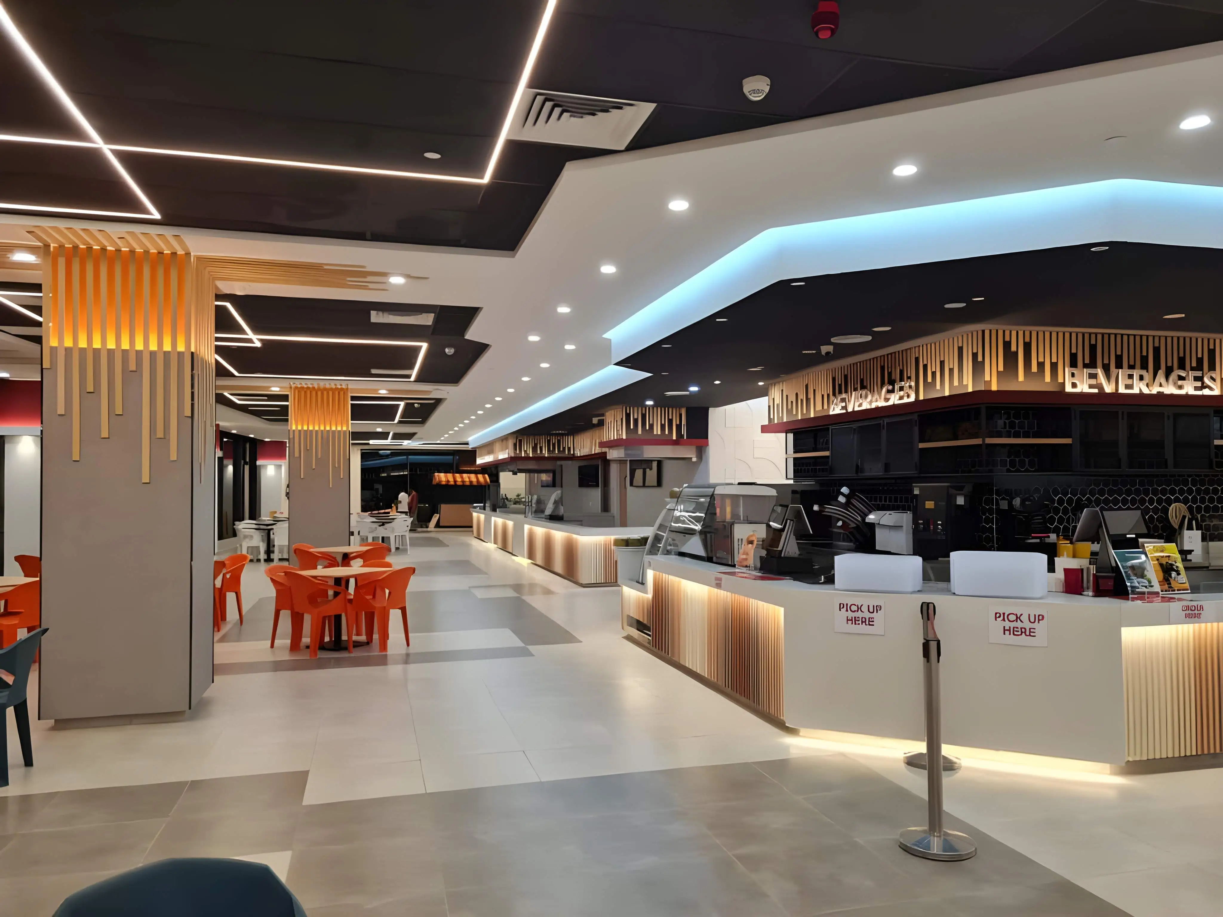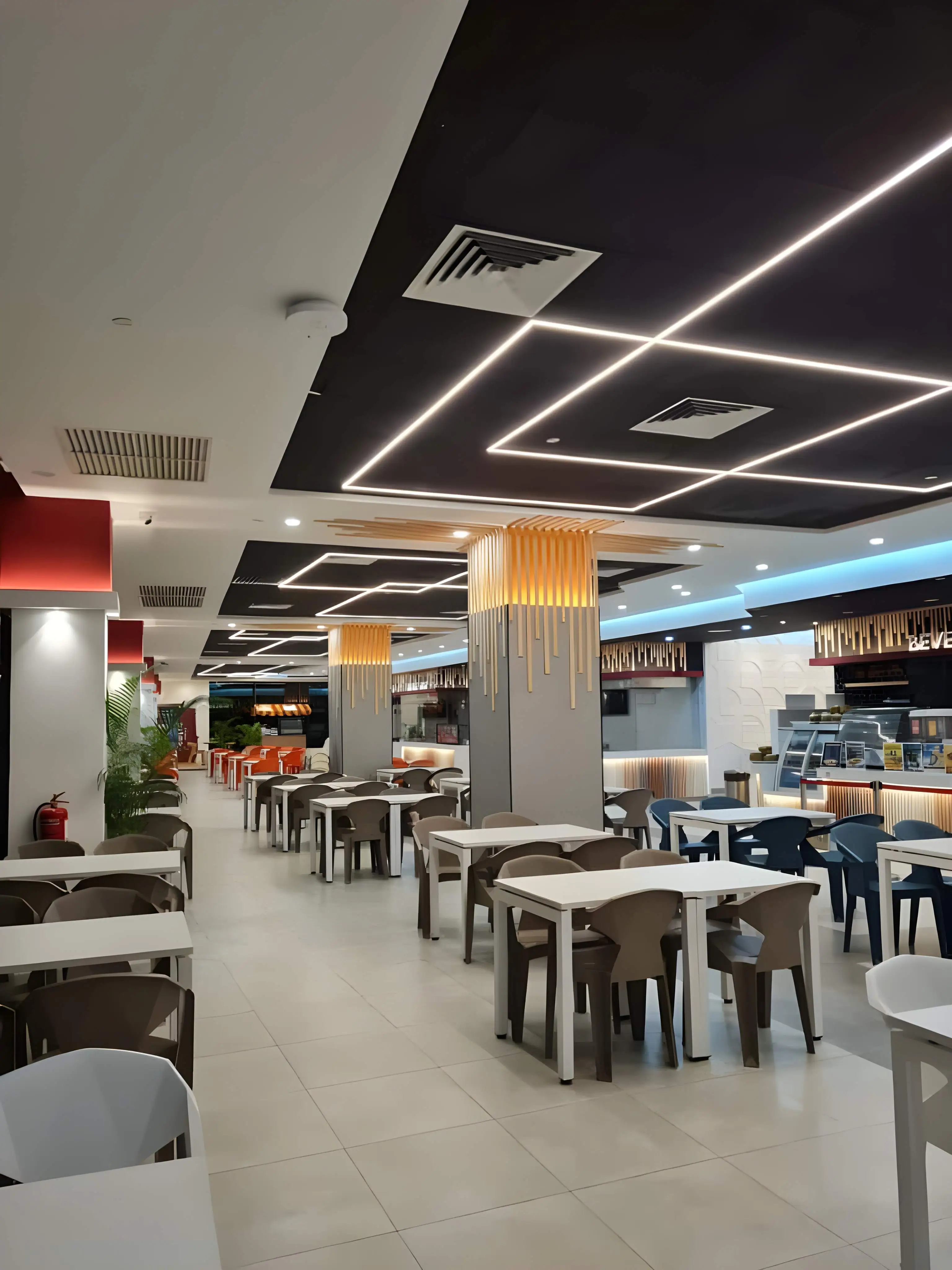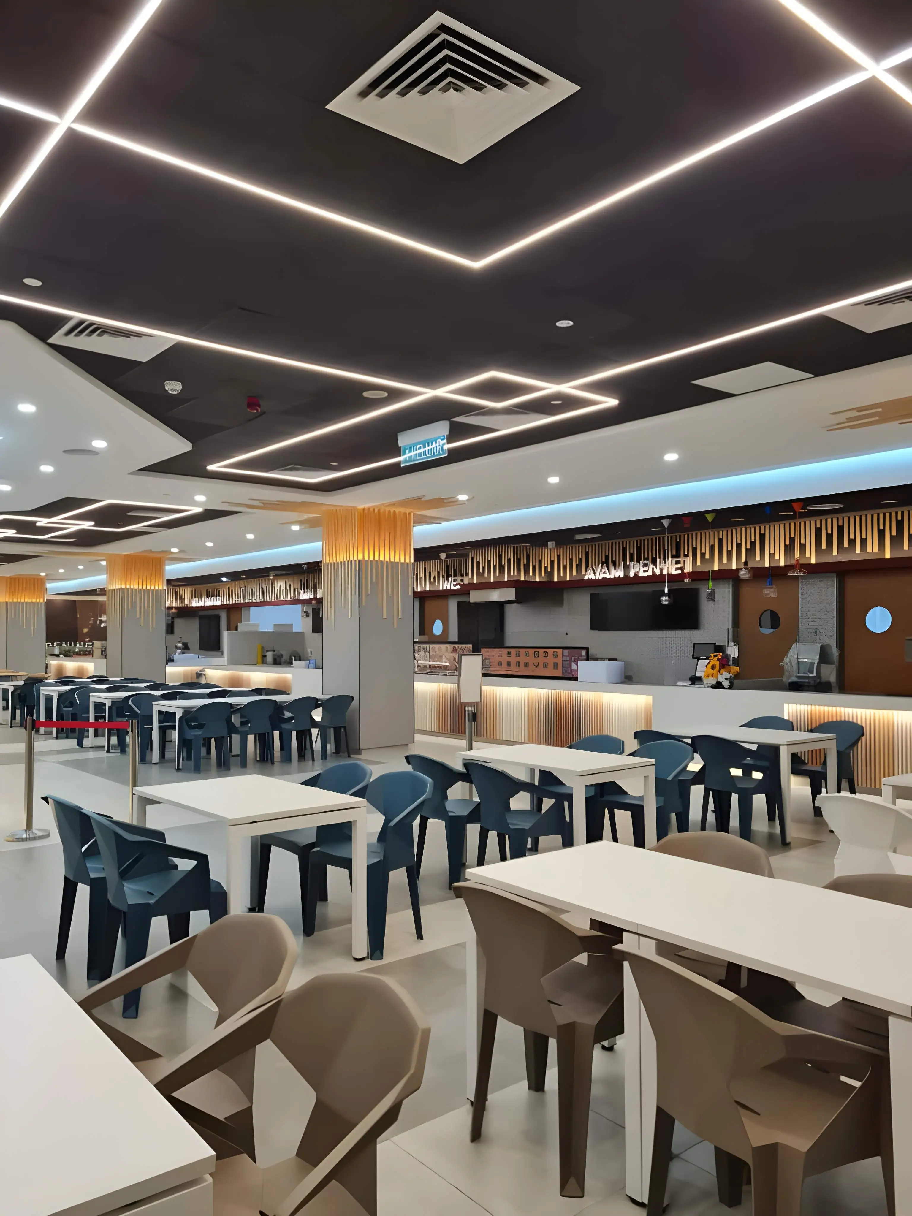 The Rasa Food Arena at Setia City Mall presents a dynamic and contemporary food court experience, designed to be visually appealing, highly functional, and comfortably accommodating for large volumes of customers. The space utilizes a sophisticated interplay of lighting and modern design elements to create a distinctive atmosphere. A key feature is the bold ceiling design, which combines black painted sections with linear LED lighting strips forming striking geometric patterns, ensuring a bright and modern environment. The food stalls and central columns are enhanced by warm wooden vertical slat accents illuminated by bright backlighting, providing a visually appealing contrast against the clean, light-toned service counters. Seating areas are clearly defined by the use of varied furniture colors, incorporating blocks of bold terracotta orange, deep teal/blue, and neutral brown/taupe chairs, which delineate zones while adding vibrant energy. The layout is optimized for efficiency, featuring well-organized service and pick-up counters, and is softened by integrated planters that introduce a touch of natural greenery, creating a clean, high-energy, and welcoming communal dining space.