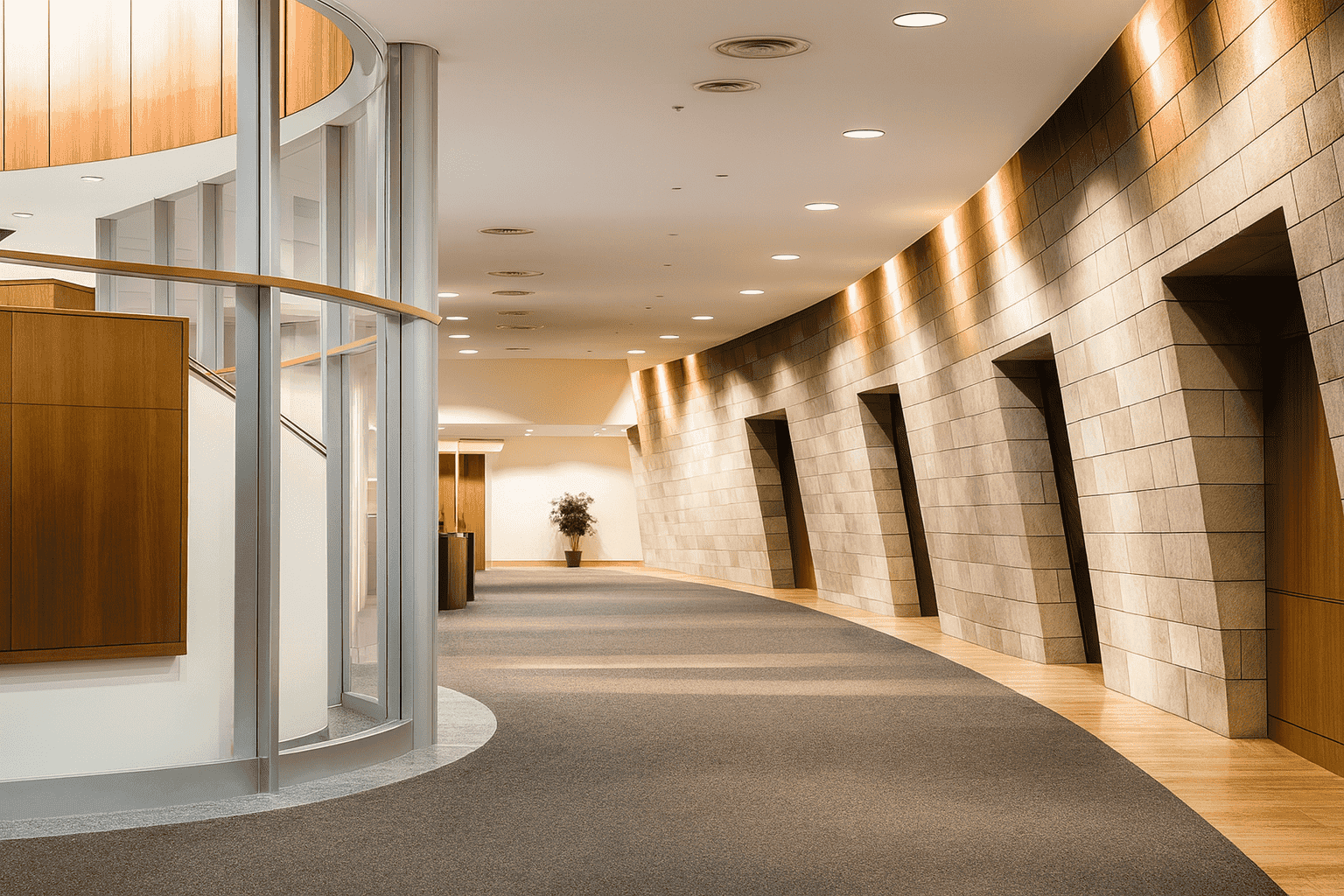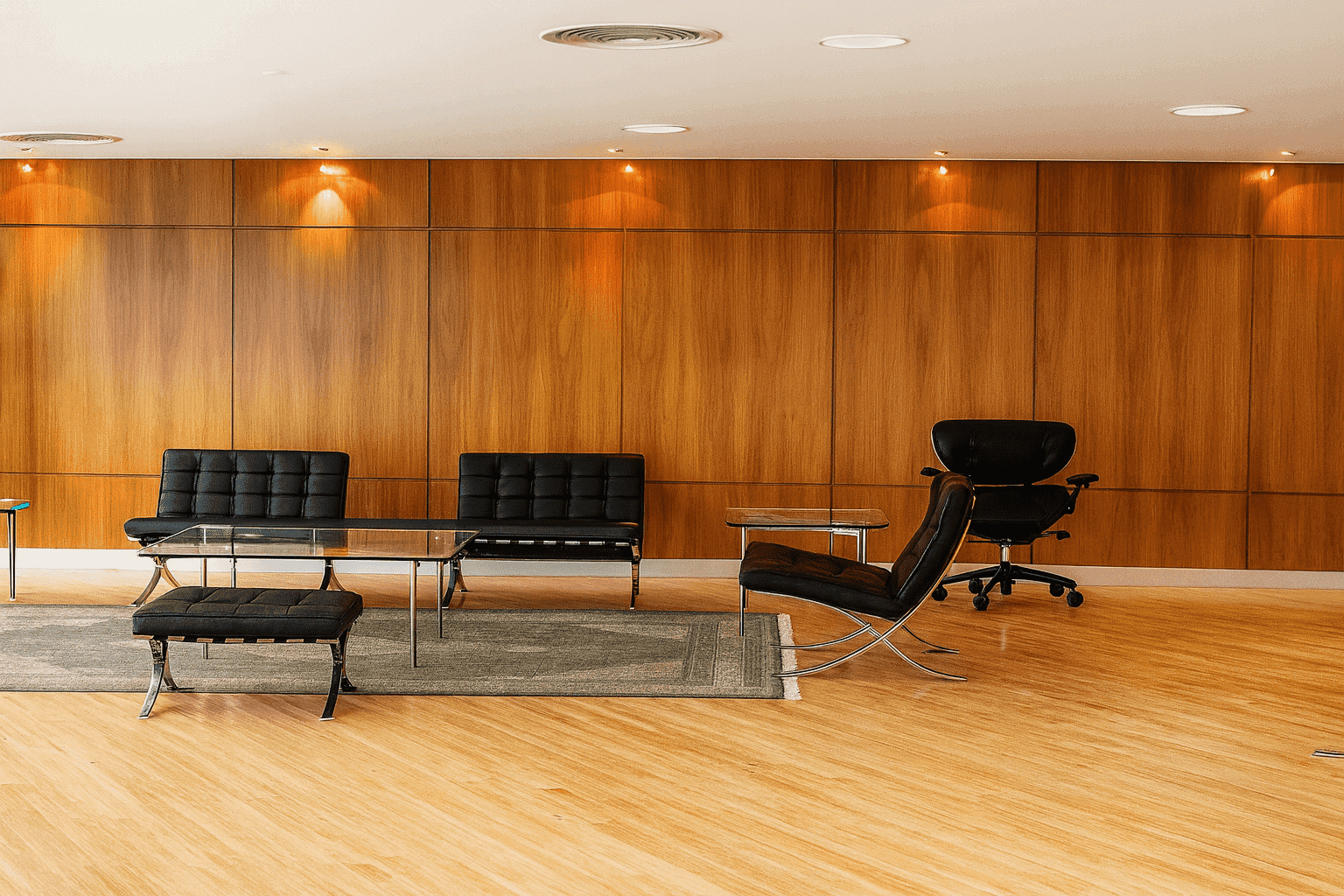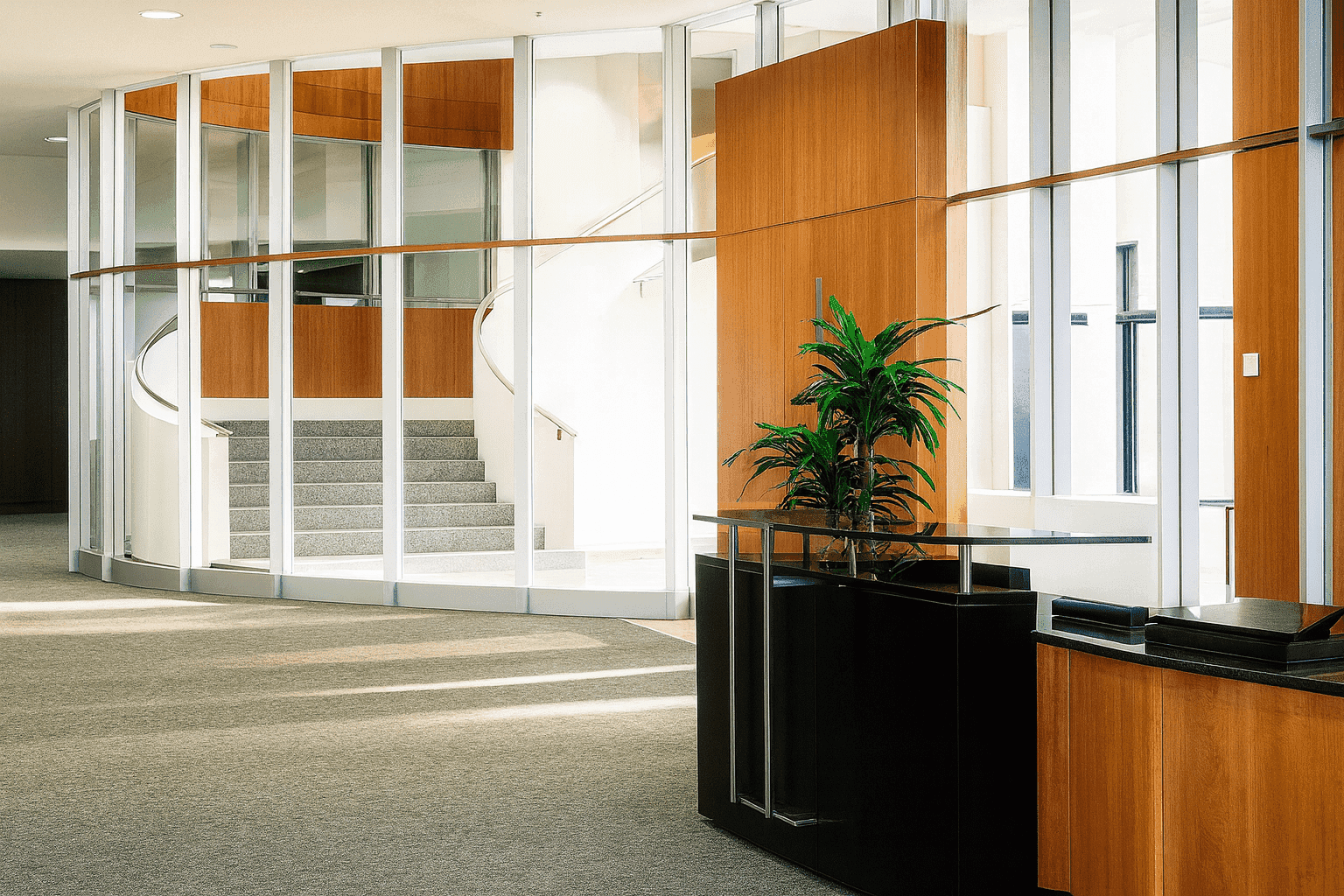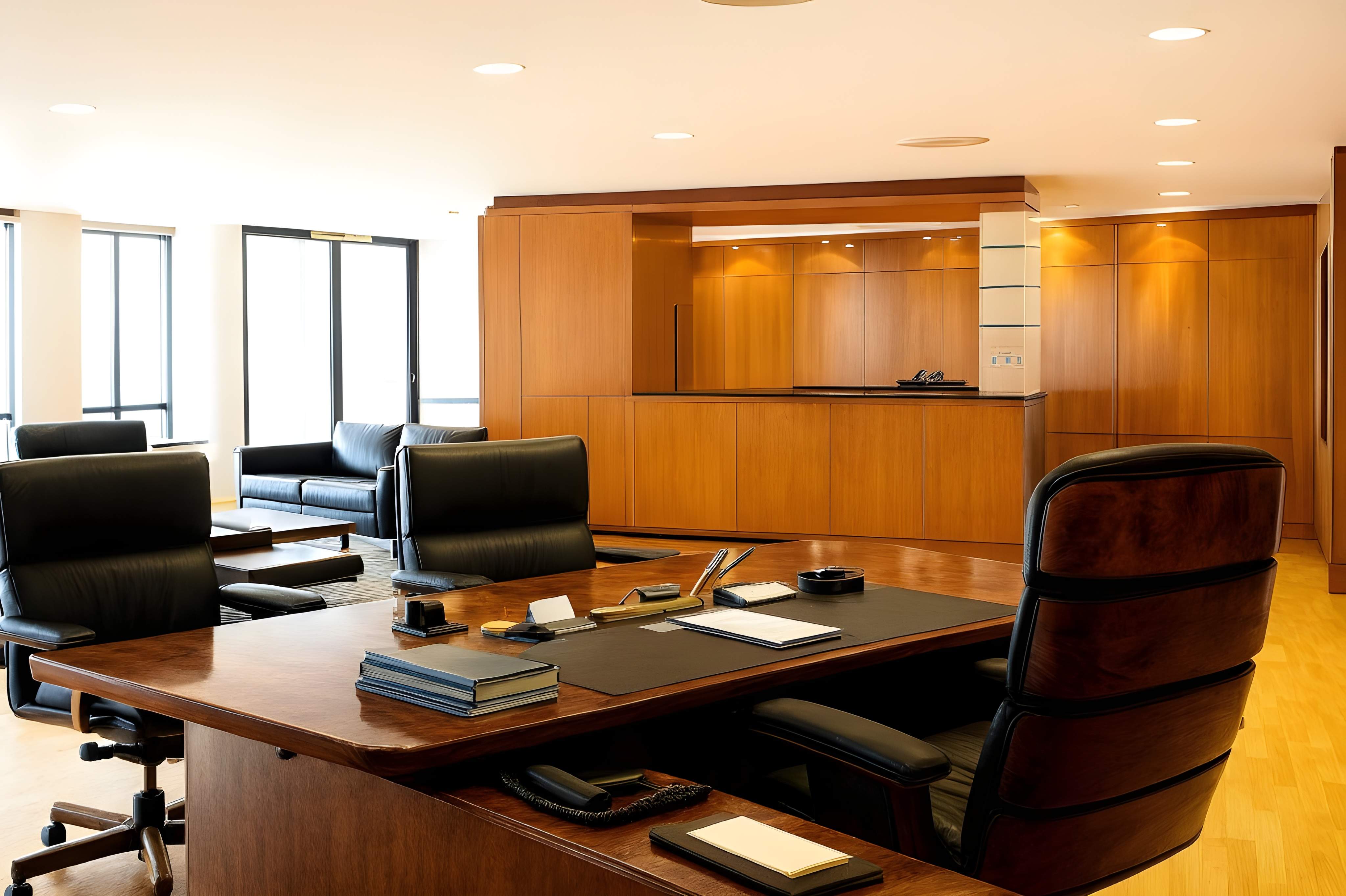 The interior design for the Sapura The Mines project showcases a sophisticated, executive, and technologically integrated corporate environment, characterized by a contemporary interpretation of high-end office design. The aesthetic is defined by a polished yet subdued palette, primarily featuring rich, dark wood veneers for feature walls and doors, contrasted with cool grey textiles, white walls, and bright, polished flooring. A key element is the emphasis on structural and geometric forms, particularly visible in the custom reception counter design and the striking, vertical wooden slatting used on feature walls which adds texture and depth. The spaces are well-defined by clean lines and high-quality finishes, creating a seamless flow between the formal reception area and the executive zones. Integrated lighting, often in hidden coves and as linear fixtures, reinforces the modern, streamlined atmosphere, projecting an image of stability, precision, and high-level corporate professionalism.