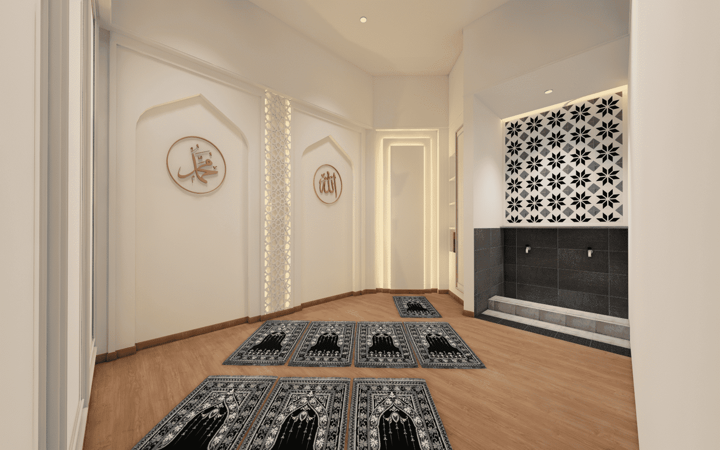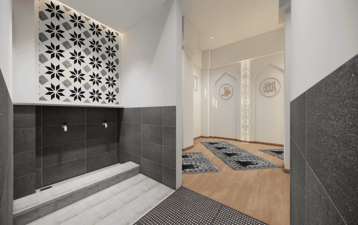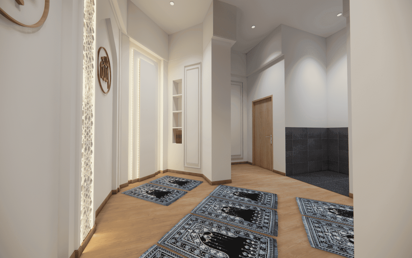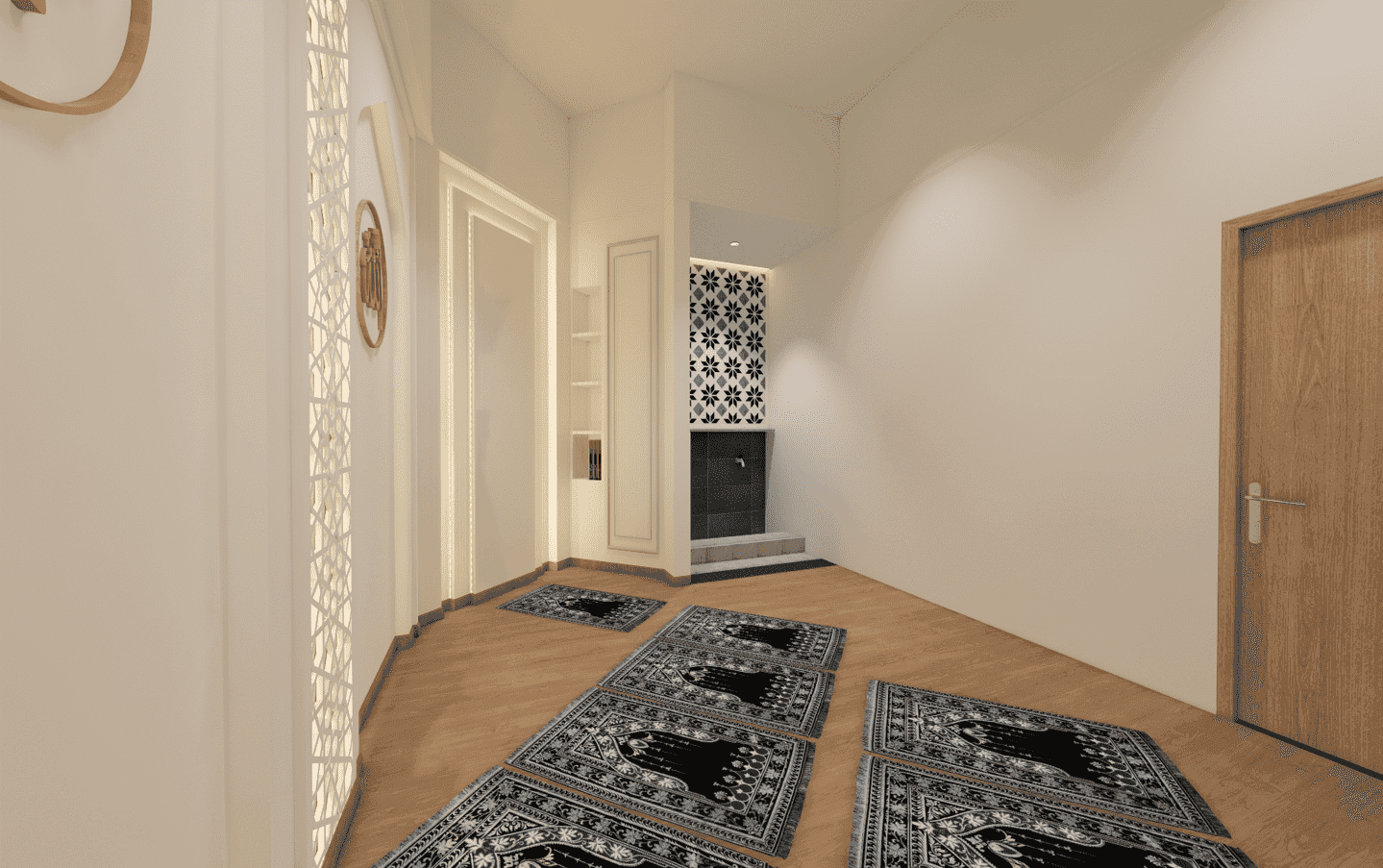 The conceptual interior design for the Surau Puteri Bay Hotel proposal aims to create a space of deep tranquility and reverence, utilizing a modern, minimalist aesthetic that respects the sacred function. The design emphasizes a serene palette of calming neutrals—primarily light cream or white walls, subtle pale wood accents, and durable, neutral-toned flooring—to promote a sense of peace and cleanliness. Key features focus on simplicity and functionality, including an elegant, unadorned Qibla wall with possibly a very subtle niche or integrated lighting, and efficient, custom-designed low shelving for personal items and religious texts. Natural light is prioritized where possible, complemented by soft, non-distracting ambient lighting and clear, uncluttered circulation paths, resulting in a design that is contemporary, highly functional, and dedicated to quiet reflection.