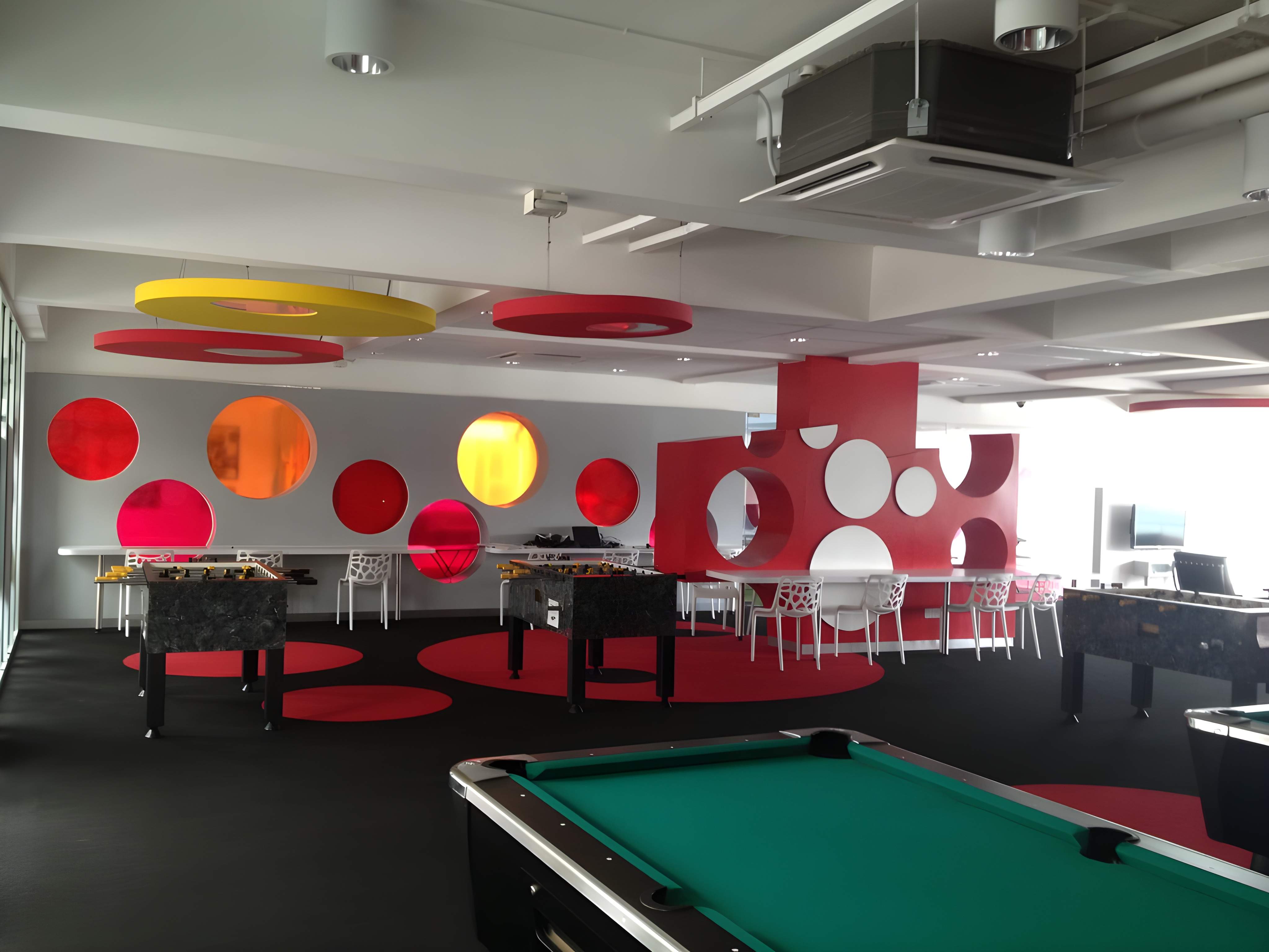 The interior design for the Taylor's U-Lounge project showcases a modern, vibrant, and multi-functional communal space tailored to the needs of university residents, emphasizing comfort and collaboration. The aesthetic utilizes a contemporary base of exposed white ceilings and clean walls complemented by warm, medium-toned wood finishes on flooring, built-in seating, and architectural frames. Defining the space is the strategic use of bold, playful colors—including bright yellows, turquoise/teal, and lime green—which appear in accent chairs, patterned wallpaper, and custom geometric ceiling features, injecting a youthful energy. The layout incorporates diverse seating arrangements, from custom-built window-facing study benches with integrated planters to casual lounge chairs and collaborative tables, providing various options for studying, socializing, and relaxation. The design also features dramatic, oversized lighting fixtures and contemporary graphics that reinforce the modern, energetic, and highly student-focused environment.