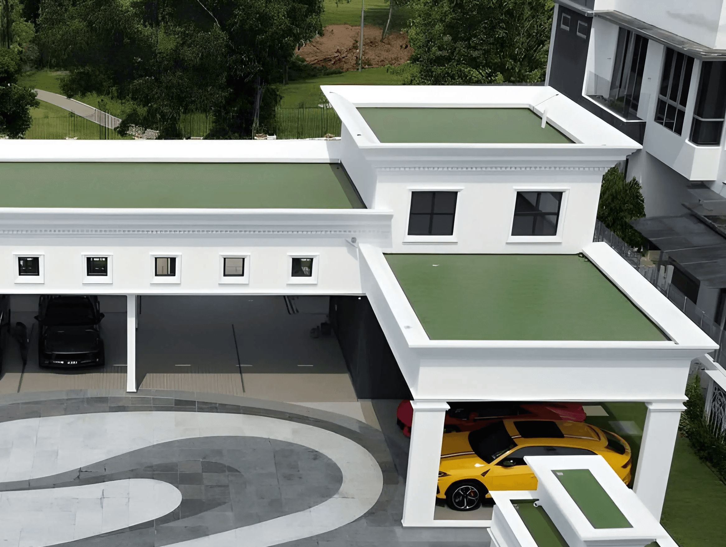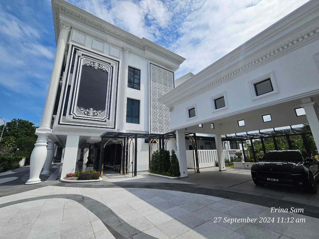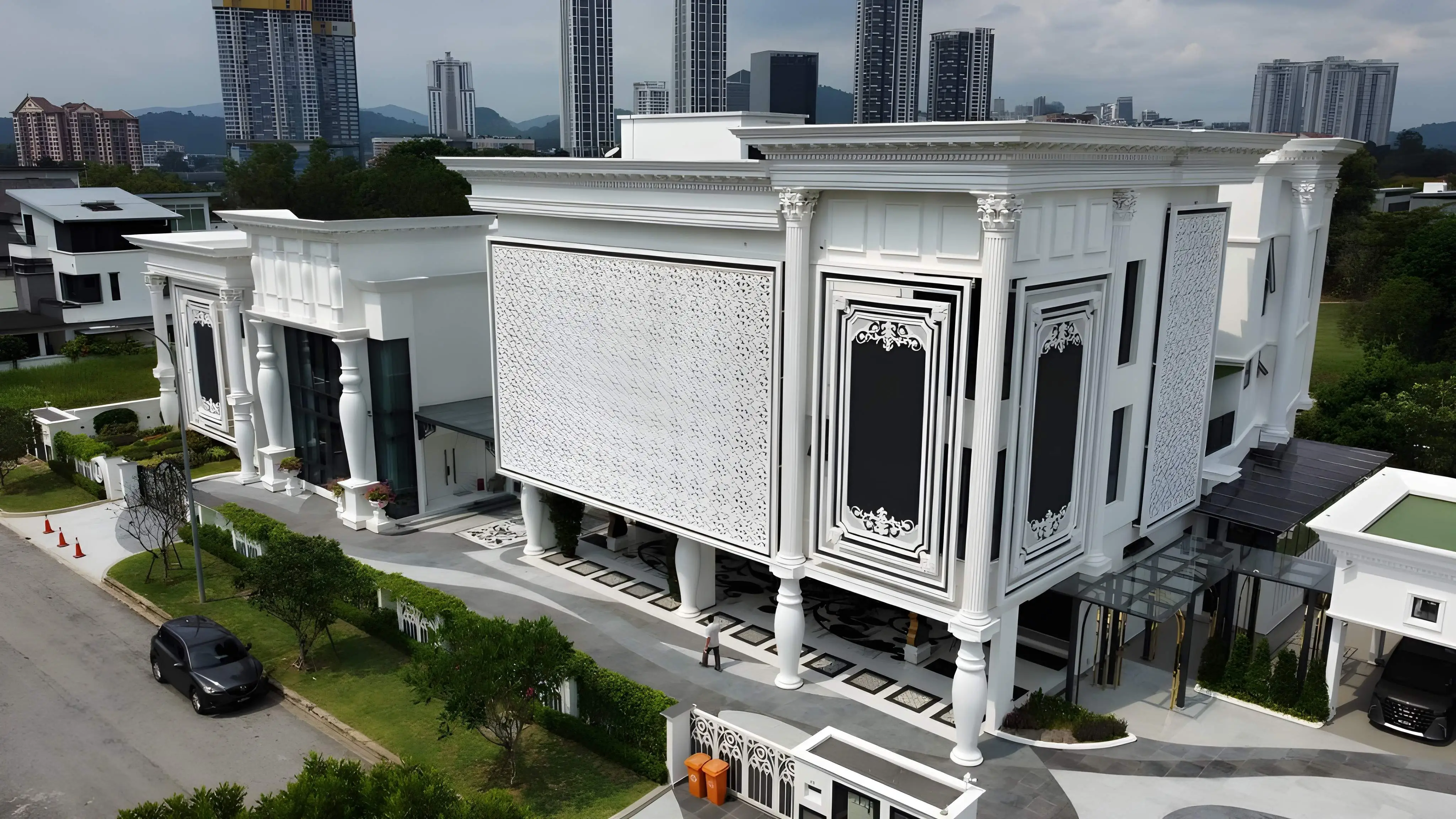The architecture of the Tropicana Indah project presents a bold, statement-making residential compound that dramatically fuses Neoclassical grandeur with contemporary massing. The primary structure is defined by its pristine all-white exterior, highlighted by strong classical features such as large fluted columns, intricate cornices, balustrades, and detailed friezes, lending a majestic, palatial quality. This traditional elegance is powerfully contrasted with modern additions like expansive dark grey/black wall panels, large stretches of glass, and striking contemporary elements, including a towering section featuring a massive, laser-cut white geometric screen and ornate black-framed windows. The compound includes multiple wings and structures, connected by an elegant, sweeping driveway with a modern grey and black patterned surface. The landscaping is equally detailed, featuring a dramatic black and white checkerboard patio created with patterned tiles and artificial turf, set within lush green lawns and classical stone planters, establishing a luxurious outdoor entertaining space.