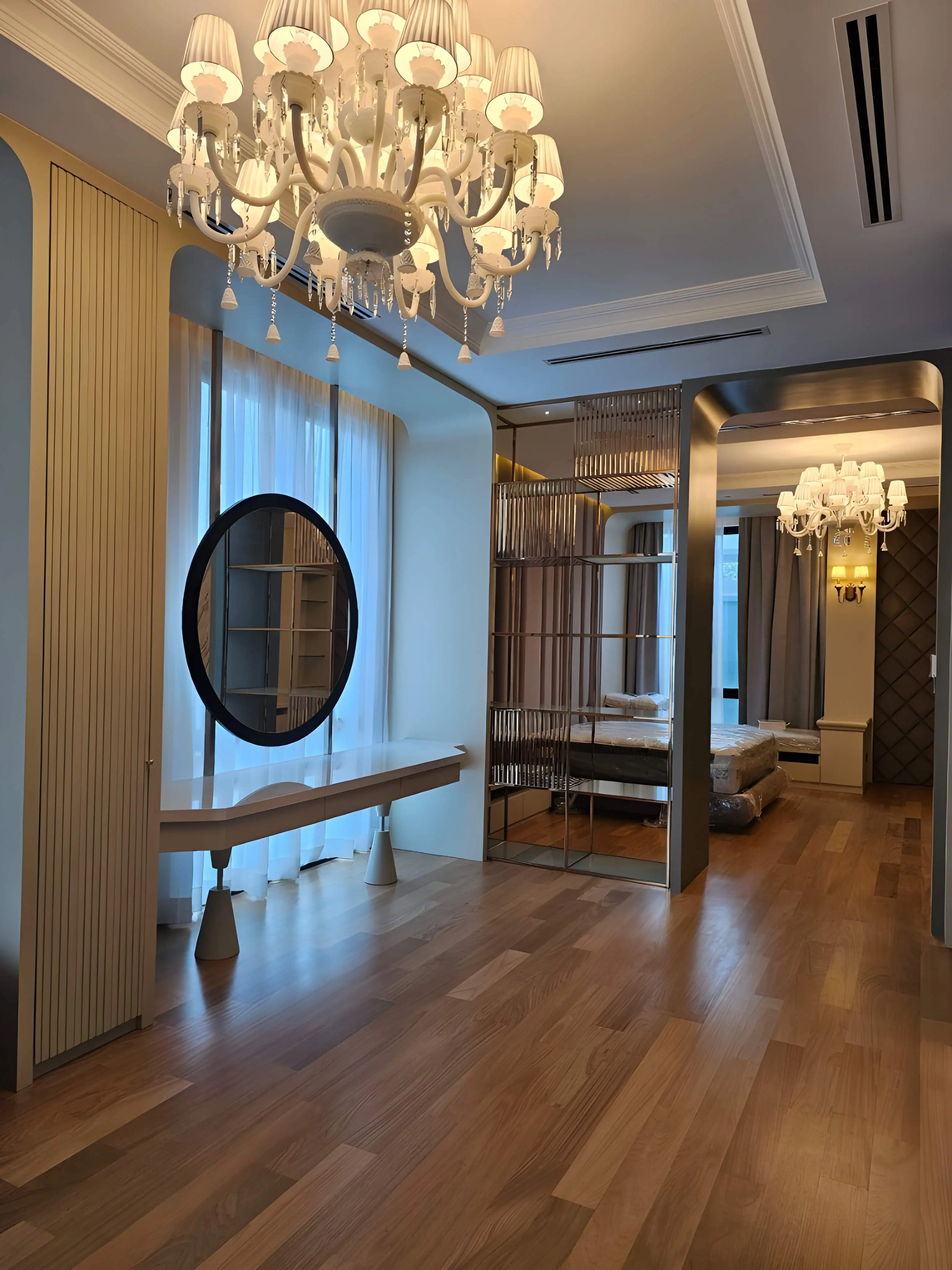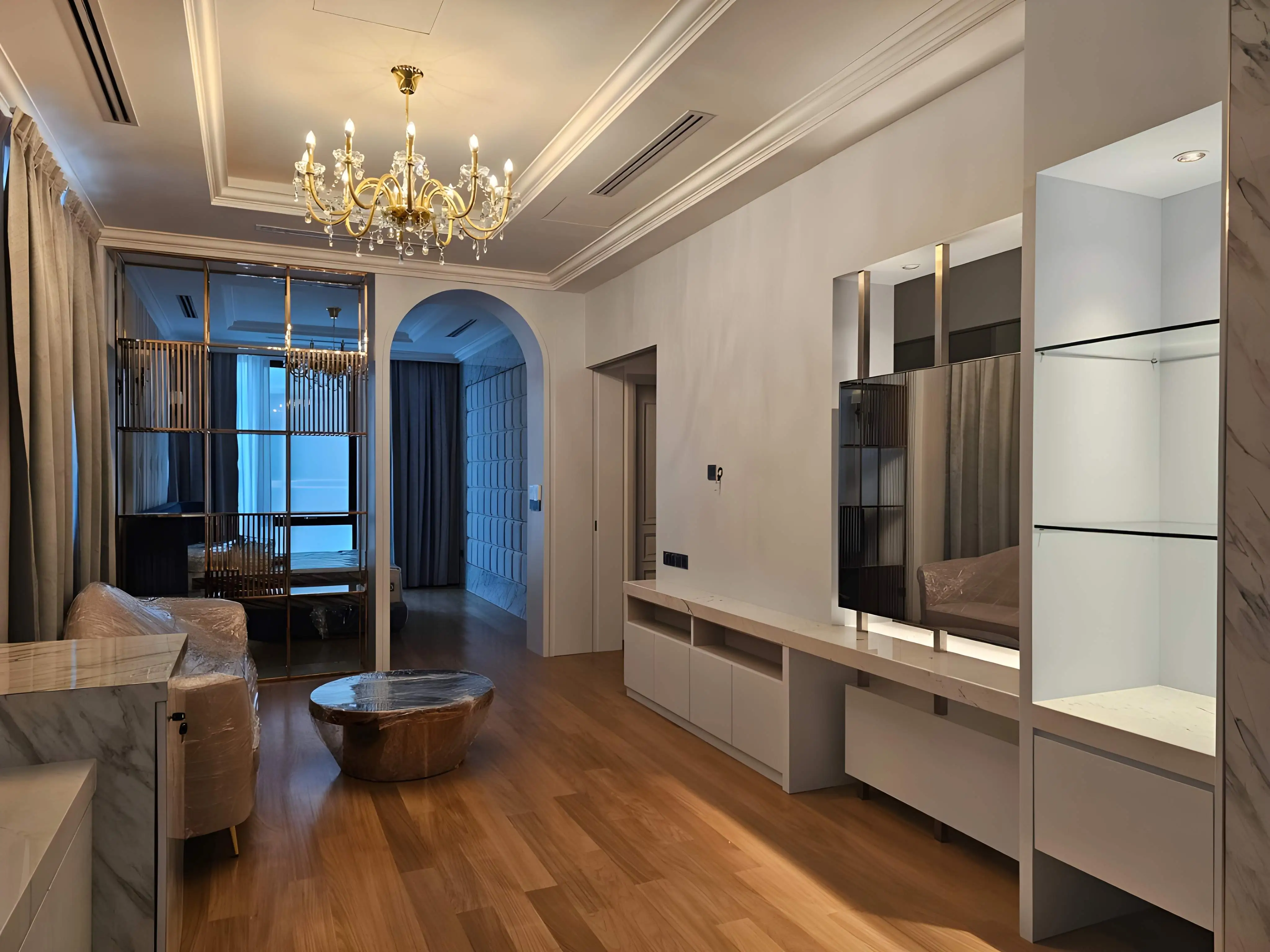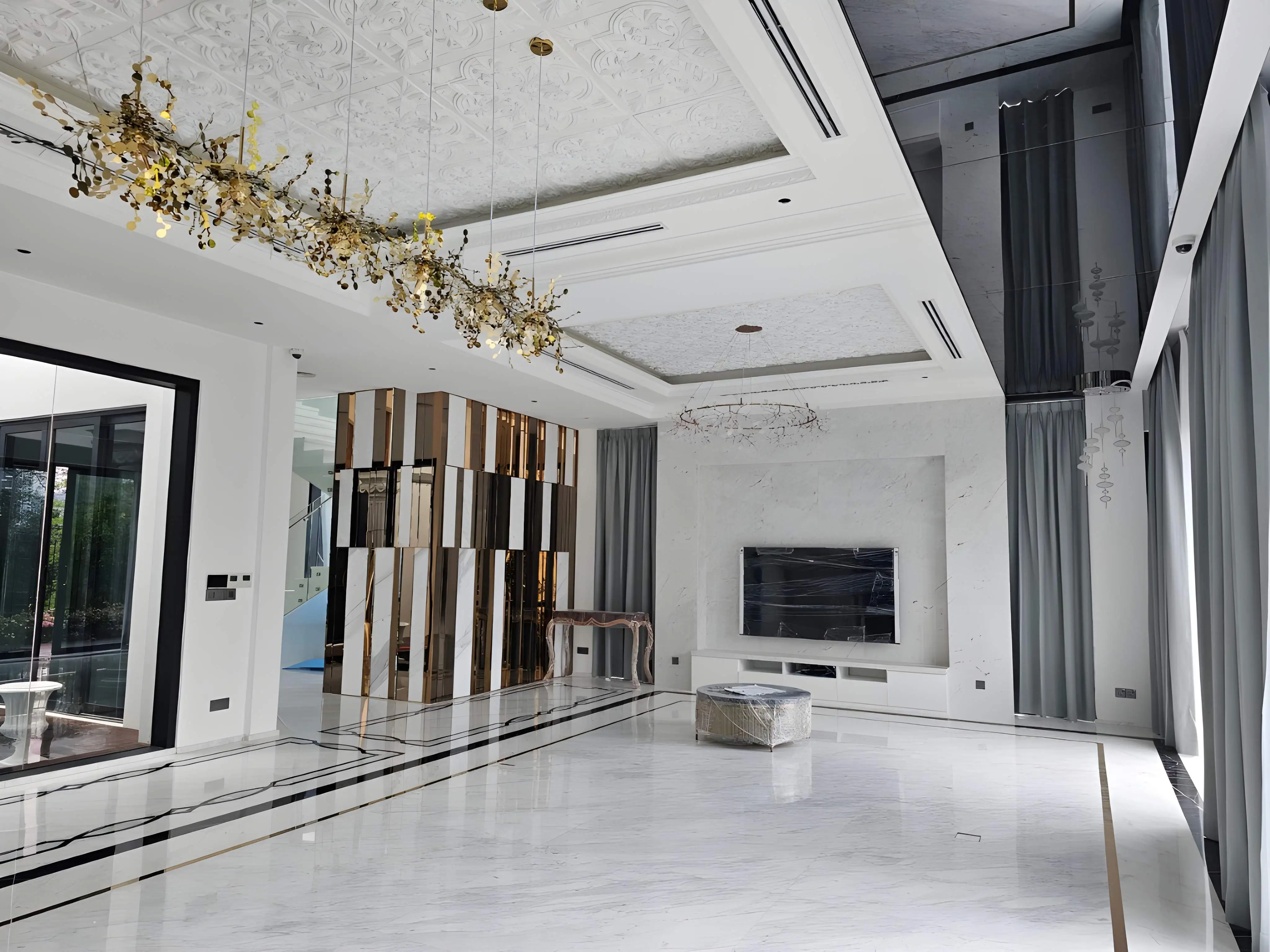 The Private Residence Tropicana Indah project presents a highly luxurious and glamorous interior design, characterized by a dramatic blend of classic opulence and modern detailing. The aesthetic is defined by a bold commitment to high-end finishes, particularly polished white marble flooring accented with contrasting black and gold inlay strips, which establish a sense of grandeur and precision in the main living areas. This luminosity is complemented by sophisticated wall treatments, including decorative paneling and high ceilings with intricate cornice work. Central to the design is the extensive use of ornate and statement lighting, ranging from multi-tiered crystal chandeliers and bespoke, sculptural gold fixtures to elegant black chandeliers in the double-volume spaces. The furniture and built-in elements feature luxurious materials like mirrored panels, gold/brass accents, glossy surfaces, and plush fabrics (such as the tufted grey sectional and vibrant cobalt blue chairs), creating visual texture and focal points. Architectural details like arched doorways, gilded stair railings, and custom decorative screens made of metal and glass further enhance the lavish, curated environment, successfully establishing Tropicana Indah as a residence of unparalleled modern glamour and sophistication.
